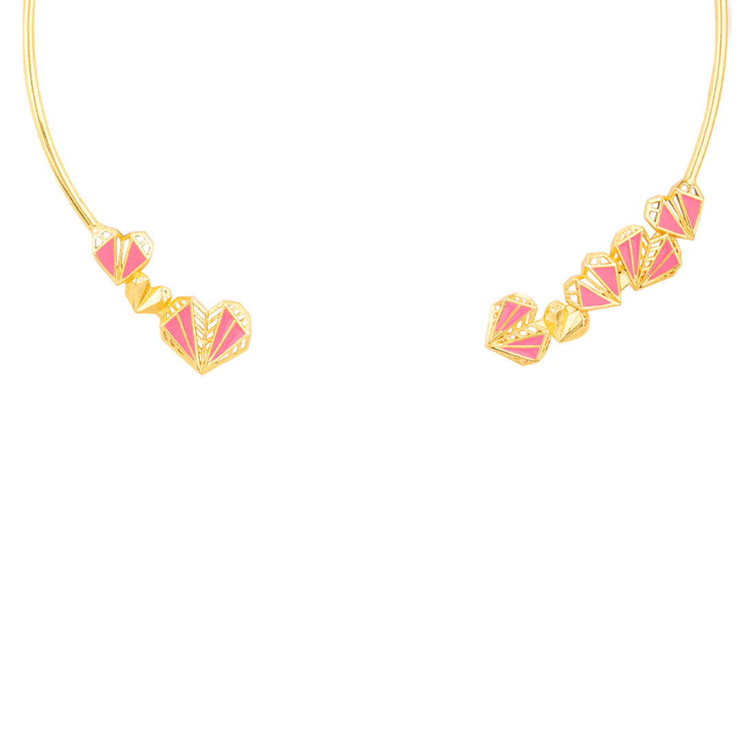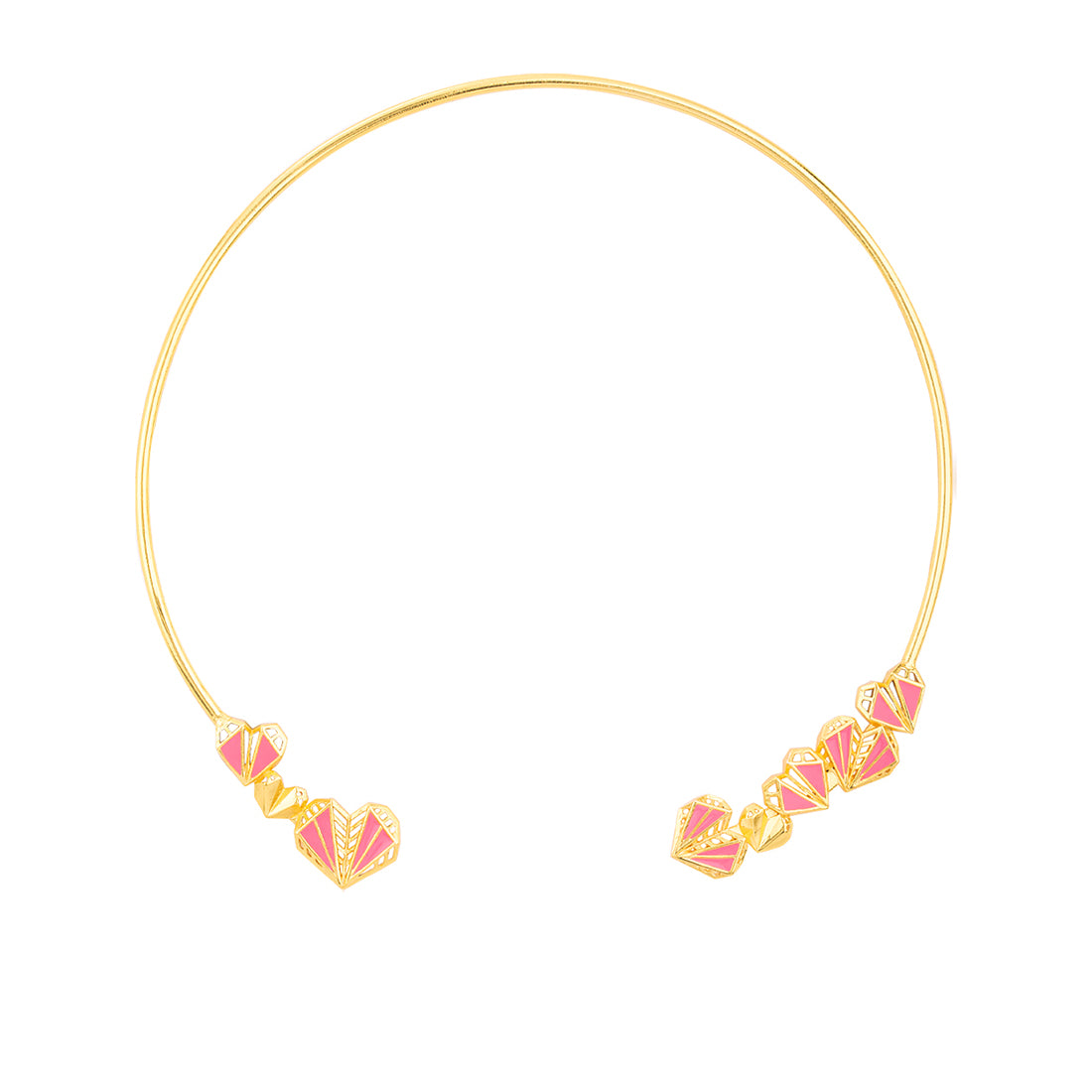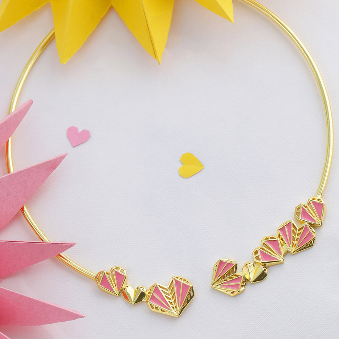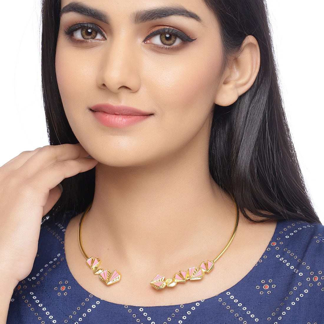 Geometric motifs, trendy open style necklace, inspired by the idea of celebrating the self this V-Day. Brass has been used in the making of this enameled and yellow gold plated necklace. Pair with a formal gown or even ethnic and Indo-Western wear.