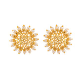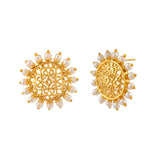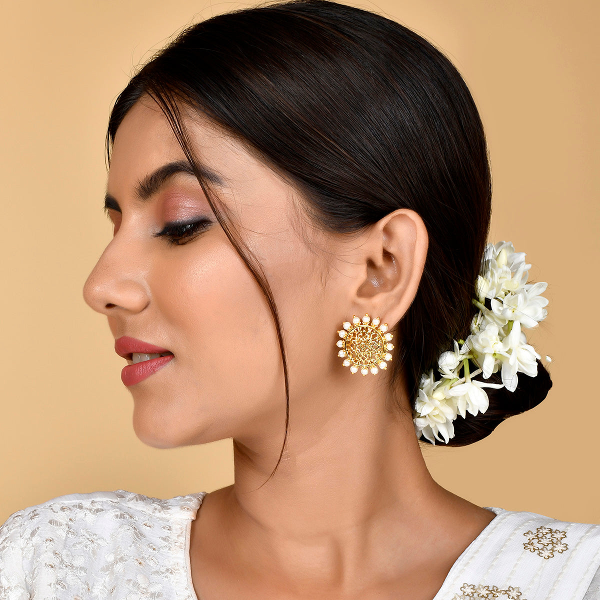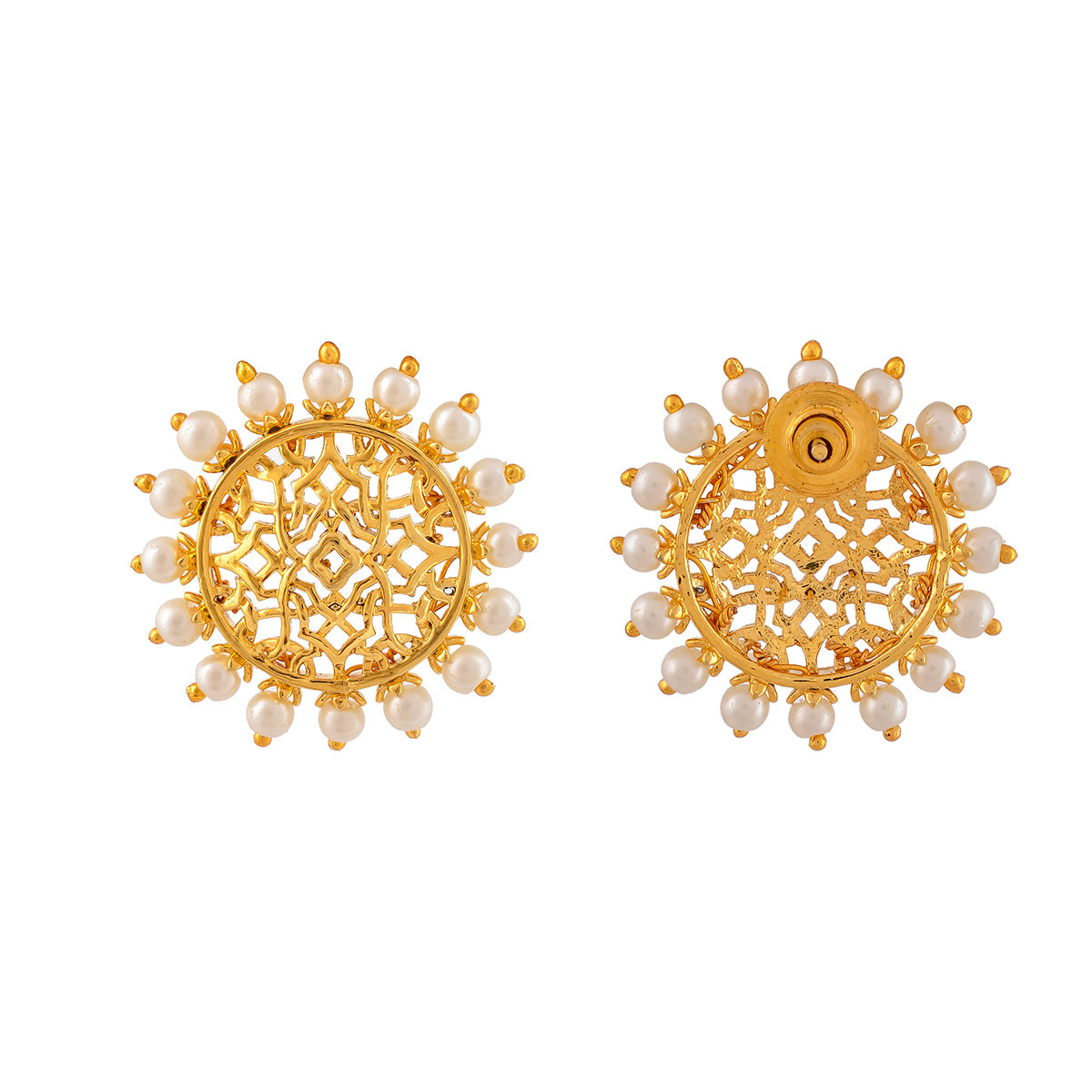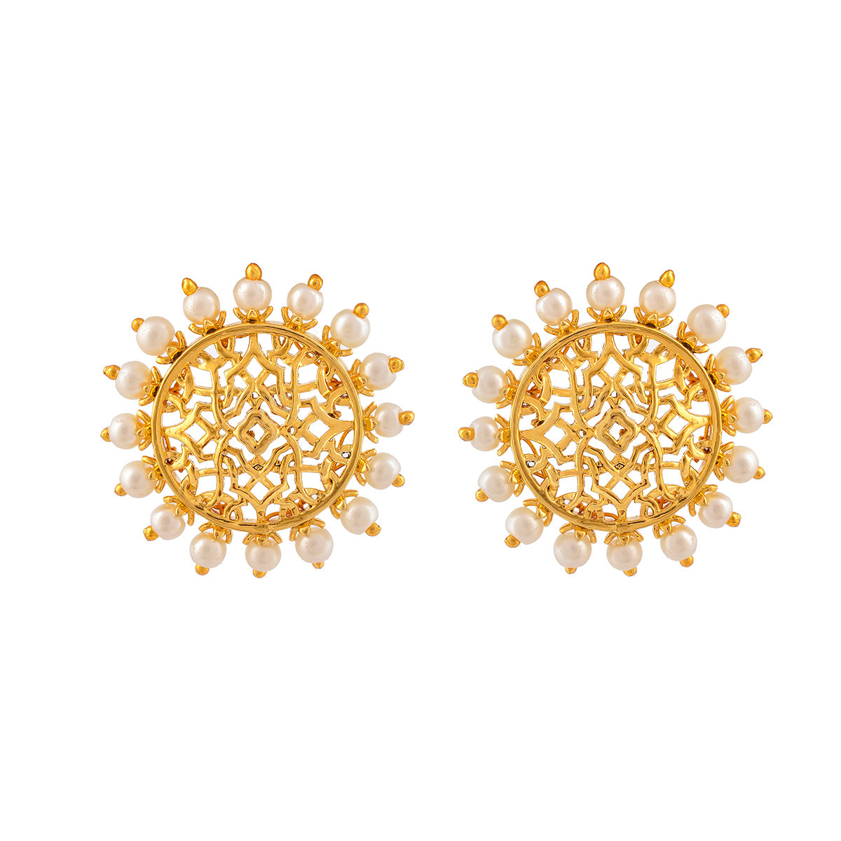 Intricate and elegant Arabesque patterns have inspired these oversized stud earrings, which are bound to add an unmistakable sparkle to all your traditional looks. Brass has been used in the making of these gold plated studs, which have been adorned with white shell pearls. An excellent addition to your collection of artistic Jewellery.