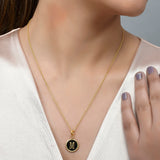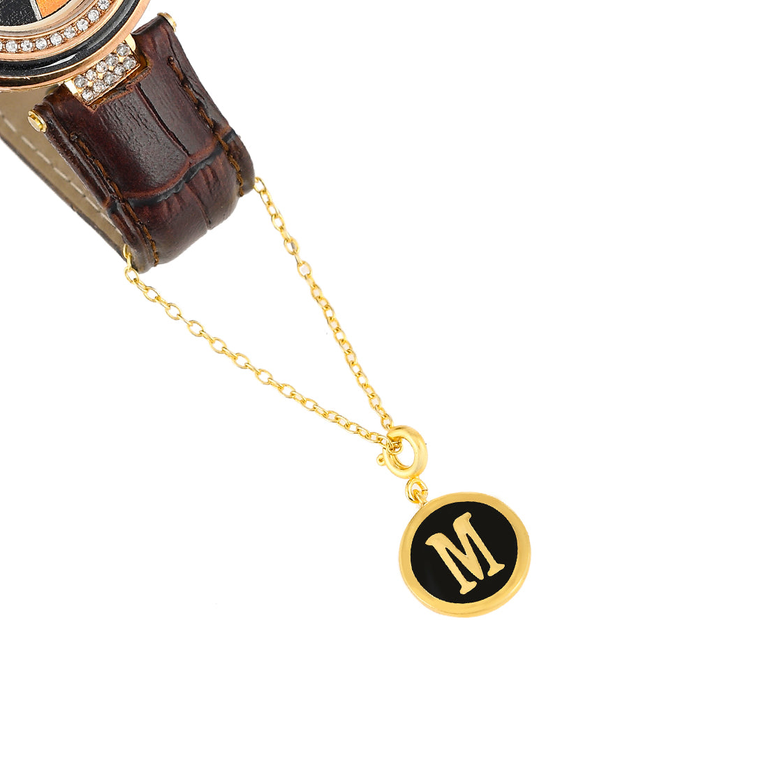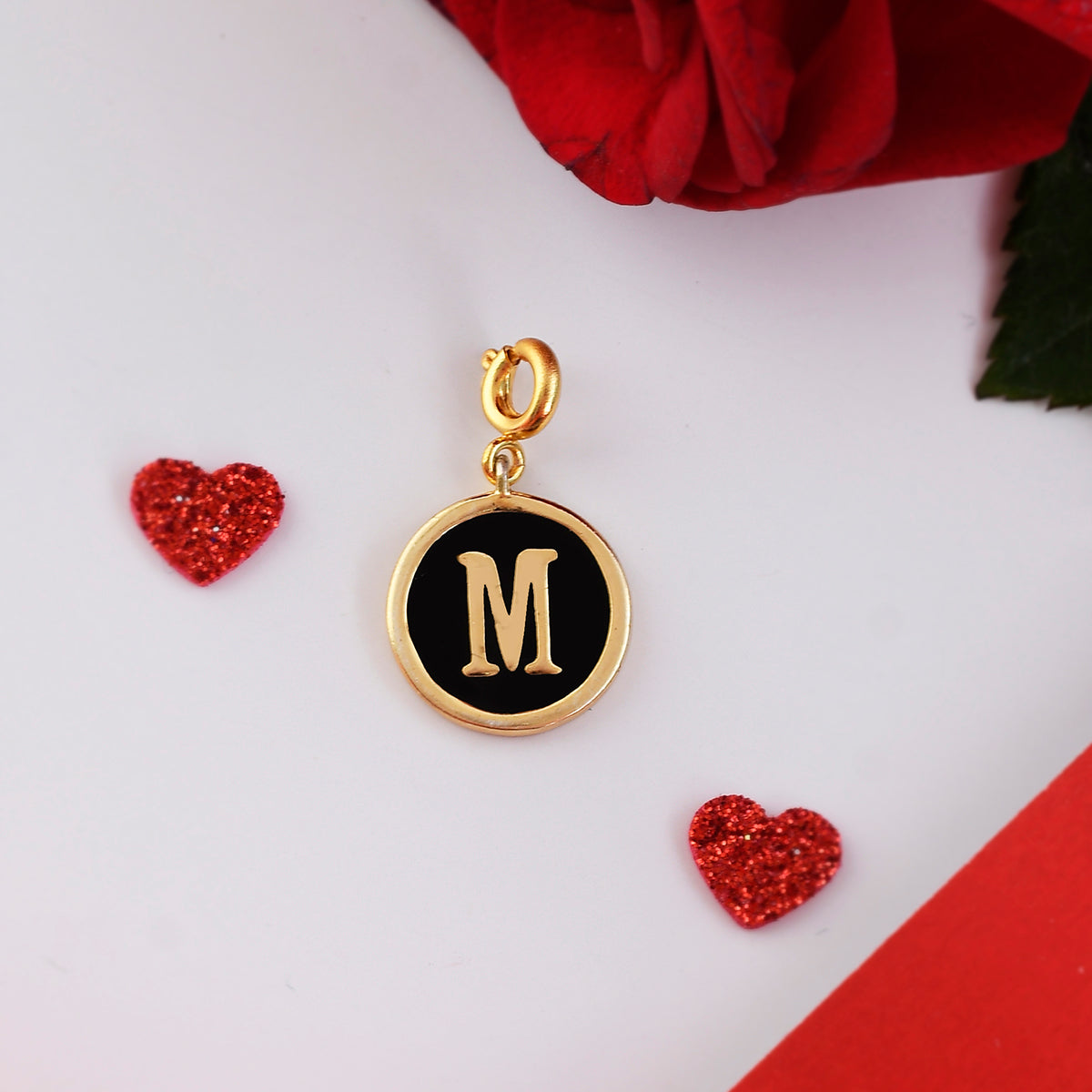 Alphabet M charm with black enamel details. Fashioned from brass into a perfectly round shape and gold plated. A good gifting option and can be paired with watches and bracelets