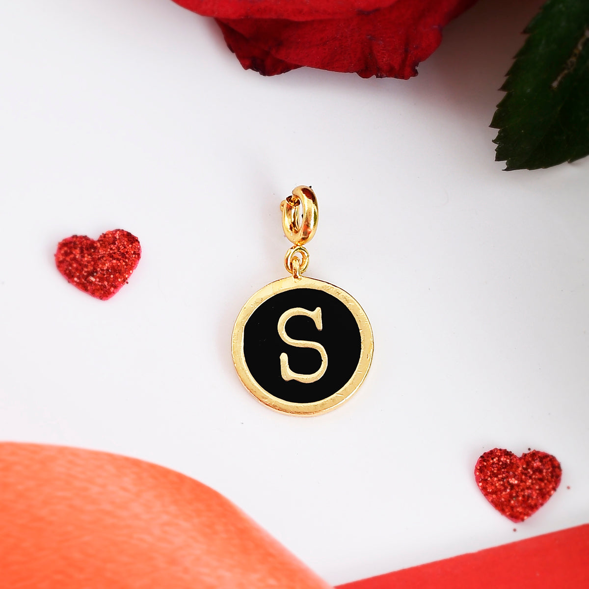 Fashioned from brass into a round shape, this black enamel alphabet S charm has been given a lovely yellow gold plating that adds to its allure. The charm will make the perfect V Day gift and can be added to bracelets and watches.
