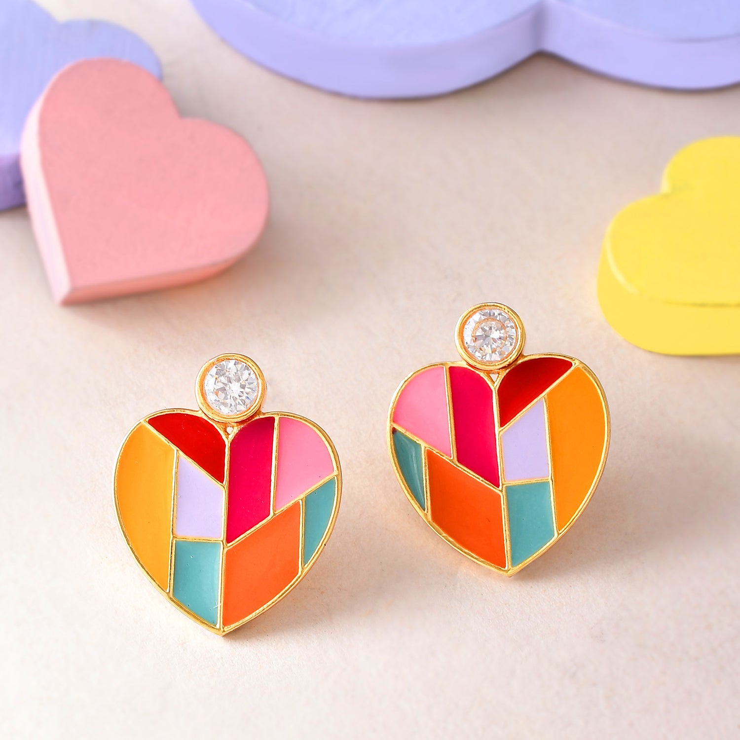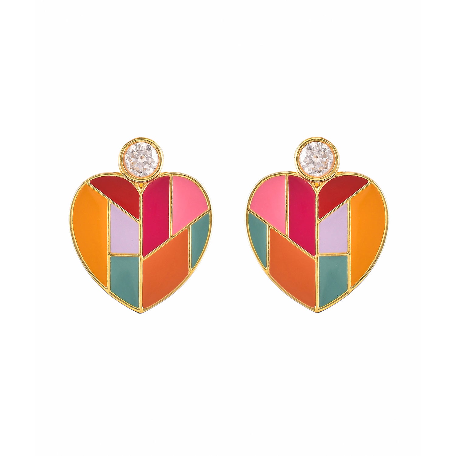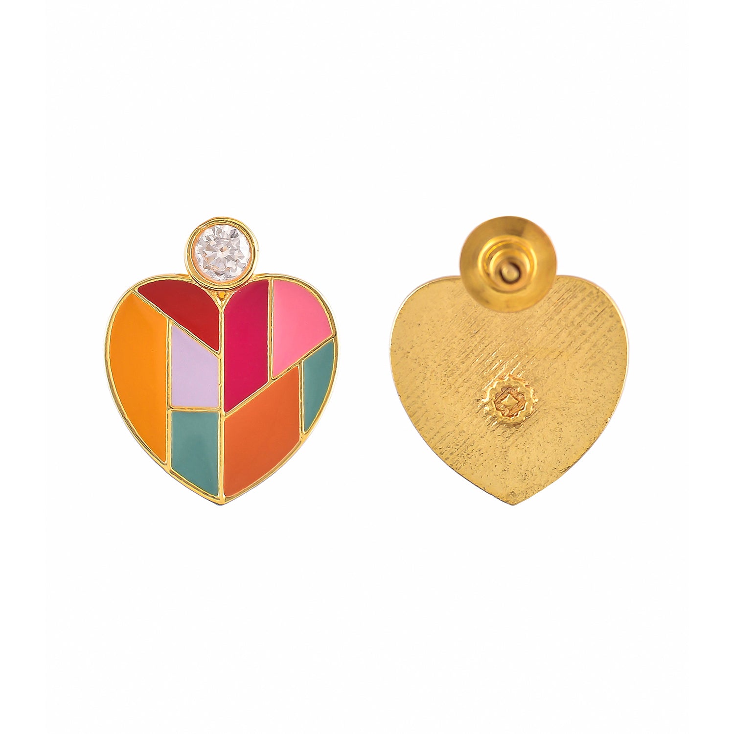 Quirky heart shaped stud earrings featuring a geometric pattern and coloured enamel. Embellished with round cut CZ gemstone, the brass earrings have been given a gold plating. Bound to make V-Day extra special.