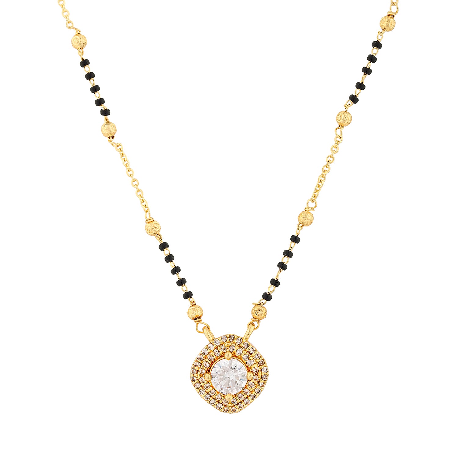 The Gold Essentials Flora American Diamond Mangalsutra is a graceful blend of nature-inspired beauty and timeless tradition. Part of the signature Gold Essentials Collection, this piece is crafted in premium brass with radiant gold plating, ensuring lasting shine, strength, and elegance. Its pendant design features a delicate floral motif, beautifully outlined with sparkling American Diamonds and centered with a cluster of stones for extra brilliance. Paired with a classic black-beaded chain and golden accents, this piece perfectly balances cultural symbolism with the sophistication of a designer mangalsutra. Lightweight yet striking, the Flora mangalsutra is versatile enough for daily wear, office wear, and wedding wear. Whether styled with sarees for festive occasions, kurtis for everyday elegance, or professional outfits for work, it adapts effortlessly. More than just jewelry, it is a keepsake of love and unity, making it a heartfelt gift for wife, anniversary gift, Valentine’s Day gift, or wedding gift.