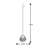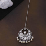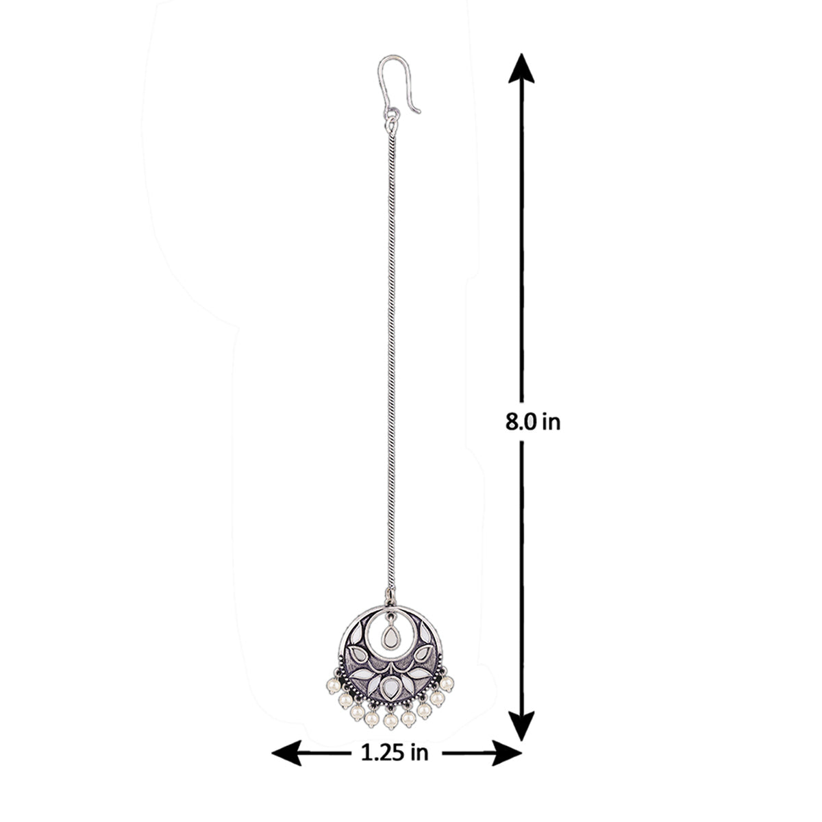 Floral maang tika inspired by the glitz and grace of Sheesh Mahal. Brass has been used in the making of this oxidized silver plated tika, which has been embellished with mirror detailing and faux pearls. Pair with an Indo-Western gown. This piece of jewelry comes with the Voylla assurance of quality and durability. Caring for your fashion jewelry: We, at Voylla, take care of every piece of jewelry so that you don't spend hours caring for them.