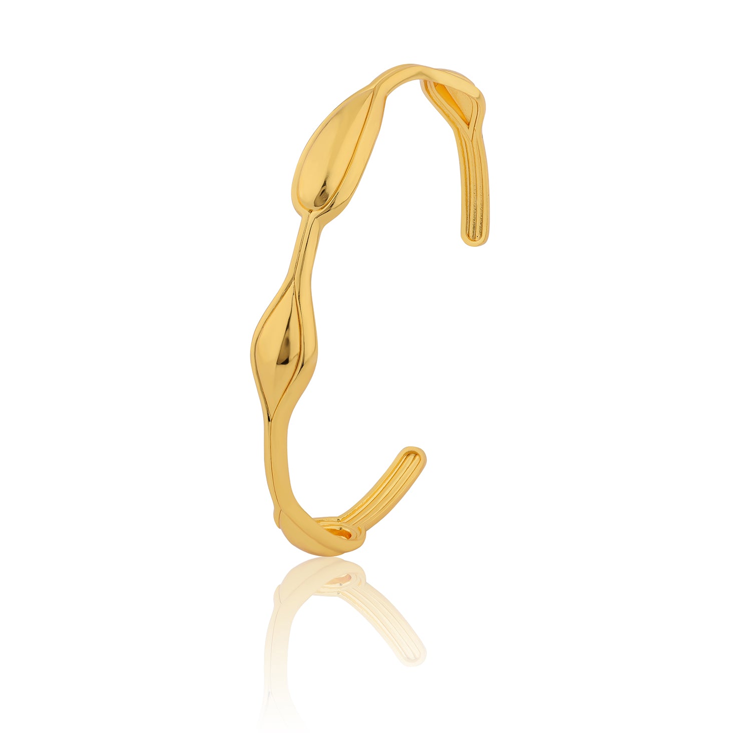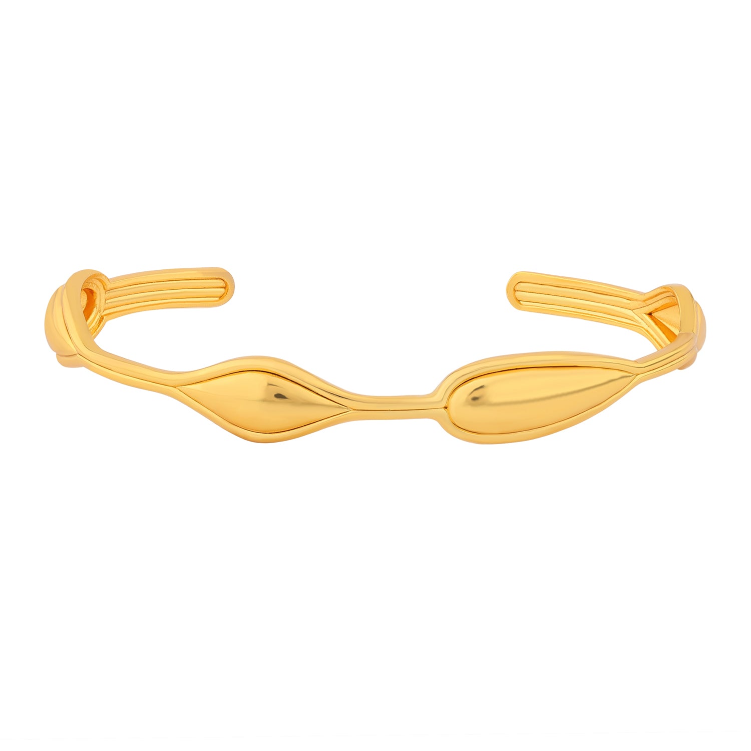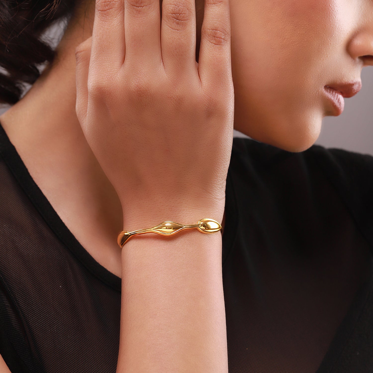 Inspired by the quiet elegance of water in motion, the Flow Tide Dewdrop Cuff Bracelet is a modern expression of fluid design and effortless sophistication. Part of Voylla’s Flow Tide collection, this bracelet draws inspiration from the natural beauty of flowing tides and delicate dewdrops, translating organic forms into a sculptural jewellery piece that feels both contemporary and timeless. Crafted from high-quality brass and finished with a radiant yellow gold plating, this cuff bracelet features smooth dewdrop-inspired motifs connected by gentle, flowing curves. The design reflects the soft rhythm of water, creating a harmonious silhouette that wraps gracefully around the wrist. Its open cuff structure ensures ease of wear and comfort, while maintaining a bold yet refined visual presence. The luminous gold finish adds warmth and polish, making this gold bracelet a versatile addition to any jewellery collection. Designed to complement western outfits, fusion wear, and modern silhouettes, it can be styled effortlessly across occasions. Wear it solo for a minimalist statement that highlights its sculptural beauty, or layer it with western bangles and gold cuffs for a more contemporary, fashion-forward look. Thoughtfully designed for modern women, the Flow Tide Dewdrop Cuff Bracelet transitions seamlessly from everyday wear to special moments. It makes a meaningful Valentine’s Day bracelet, anniversary gift, or romantic gift for your girlfriend, wife, or someone special. Symbolising flow, balance, and lasting connection, this bracelet is perfect for celebrating moments that feel natural, elegant, and enduring.