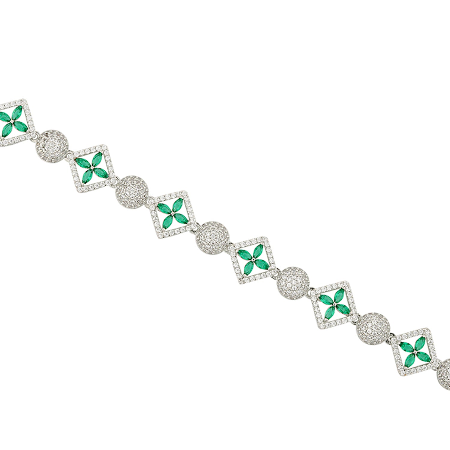 Add a touch of royal radiance to your style with the Emerald Bloom CZ Bracelet from our Sparkling Elegance Collection, a stunning piece that perfectly blends timeless sophistication with a modern twist. Crafted from premium brass and coated in a brilliant white rhodium plating, this bracelet features an enchanting arrangement of floral-inspired emerald green stones framed by shimmering American Diamond (CZ) accents. The geometric blend of square and round motifs brings an elegant rhythm to the design, making it an instant statement piece. With its refined detailing and adjustable chain clasp, this CZ bracelet for women is both comfortable and glamorous, perfect for festive occasions, formal gatherings, or a sparkling night out. The radiant combination of green and white tones adds a touch of nature-inspired luxury to your jewelry collection. Elegant, unique, and full of charm, the Emerald Bloom Bracelet makes a meaningful gift for her, a celebration of grace, beauty, and enduring style.