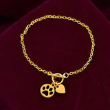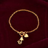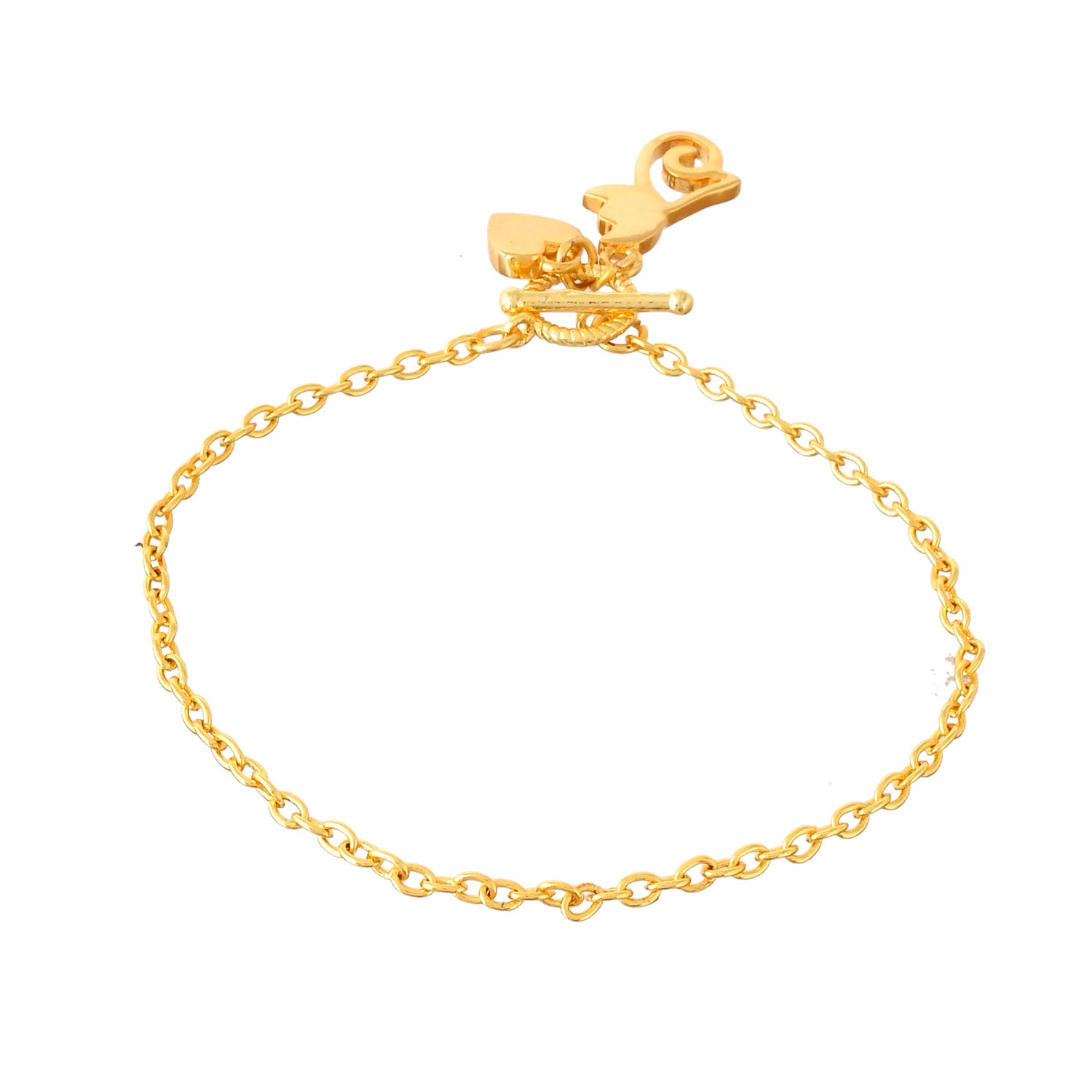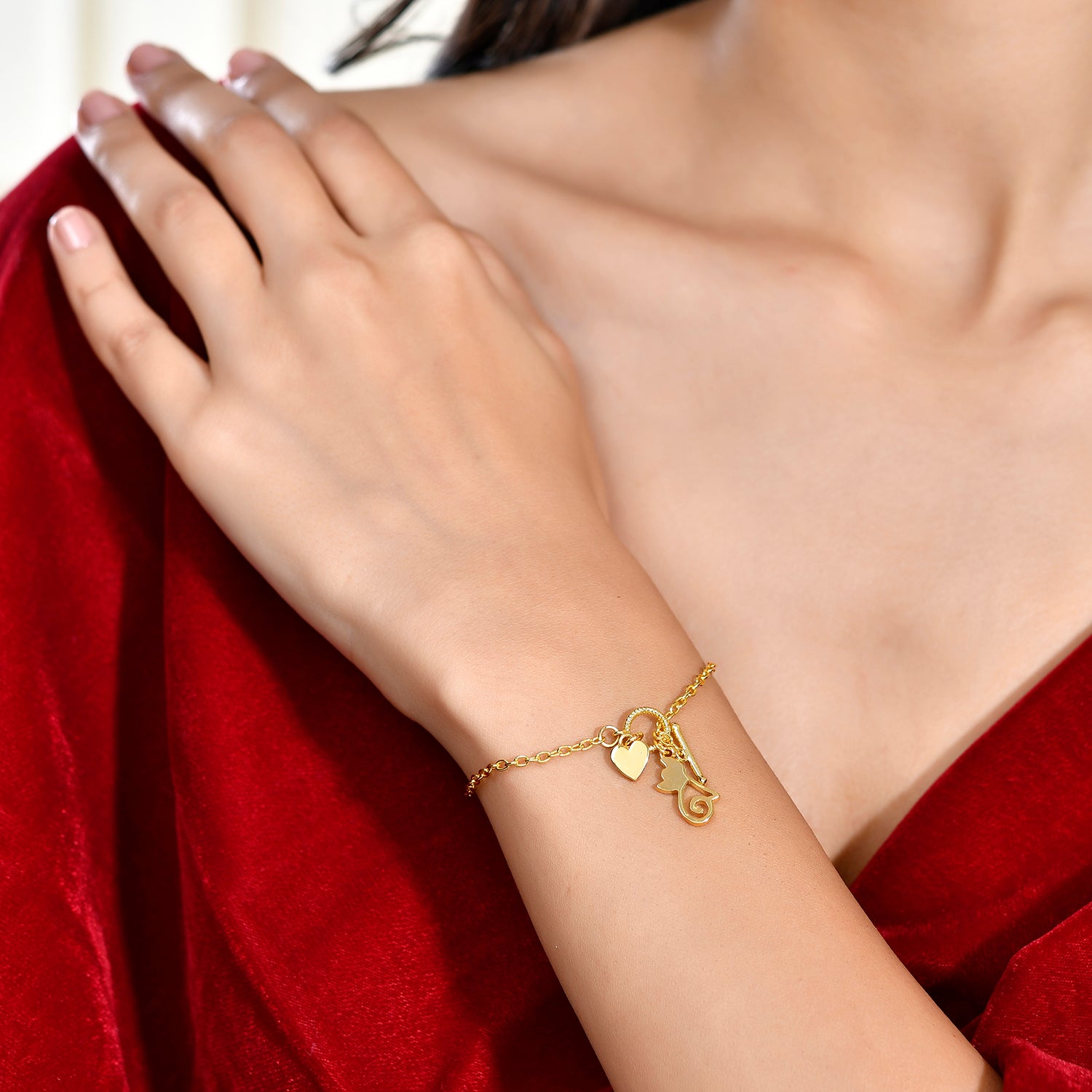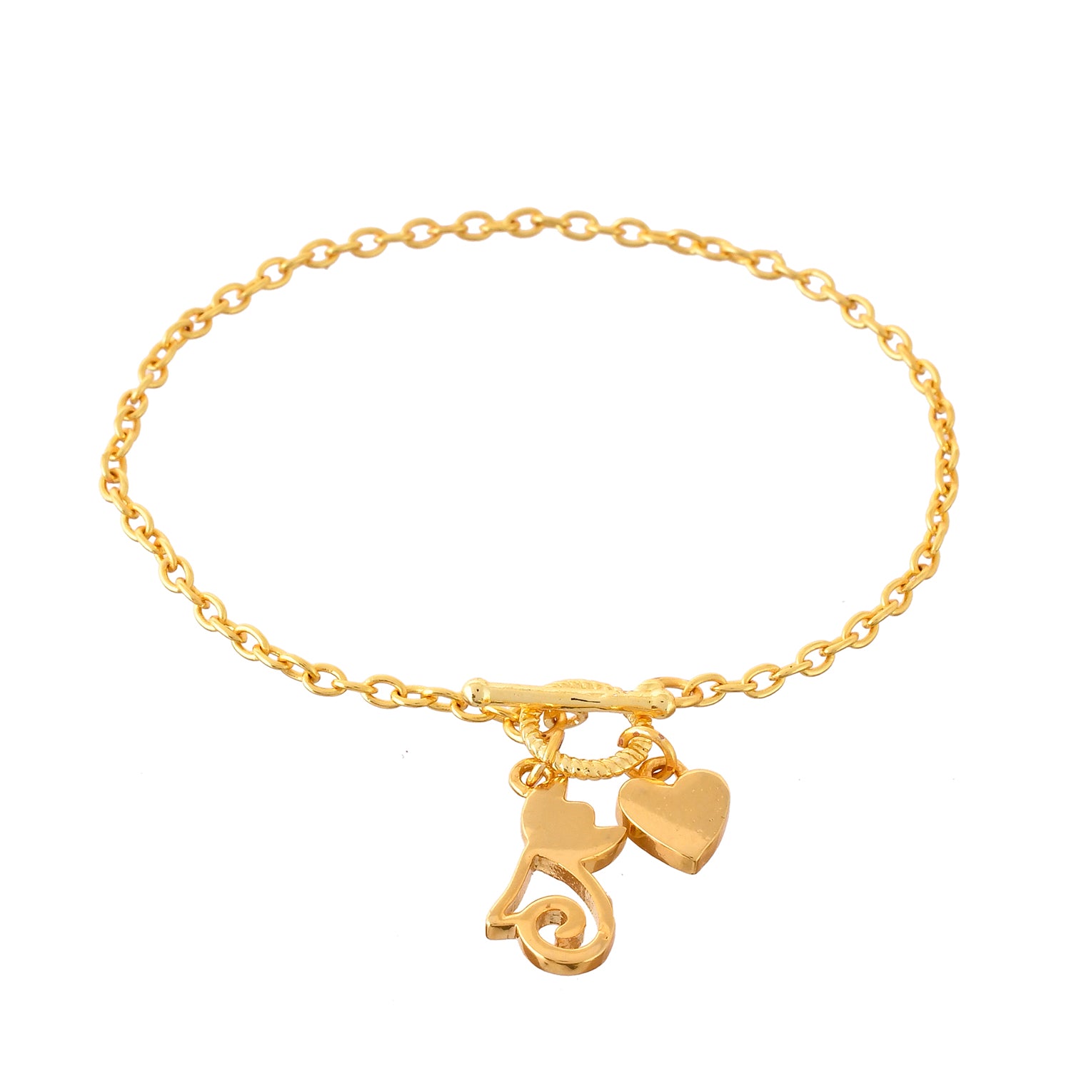 The Valentine's Day Pawsitively In Love Toggle Charm Bracelet is a beautifully crafted piece from the Valentines Collection, designed to capture the essence of love and affection. Made from high-quality brass and plated with gold, this women's bracelet features a delicate chain adorned with two charming pendants: a heart and a whimsical cat silhouette. The toggle clasp not only adds a touch of elegance but also ensures a secure fit. The bracelet's warm gold color makes it a versatile accessory, perfect for party wear, festive occasions, weddings, and even casual outings. This bracelet is an ideal gift for women, whether for Valentine's Day, Diwali, Rakshabandhan, Christmas, New Year, or any special occasion. It is a thoughtful present for sisters, lovers, girlfriends, wives, and mothers, making it a cherished addition to any jewelry collection.