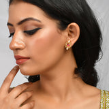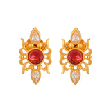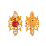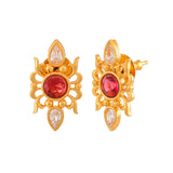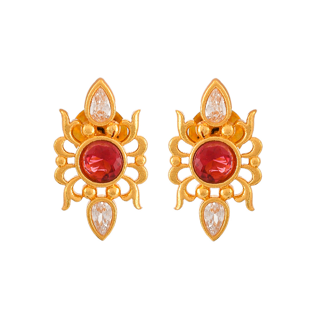 Casual brass stud earrings with yellow gold plating. Adorned with round cut red stones. Pair with everyday attire.
