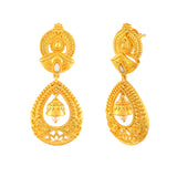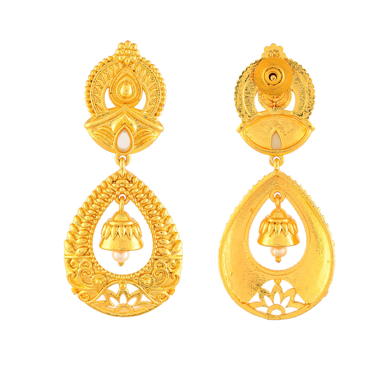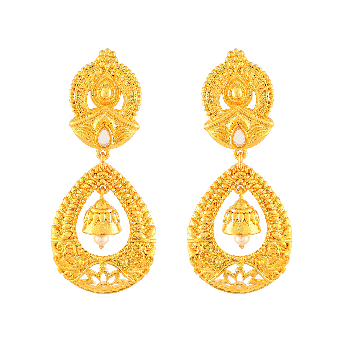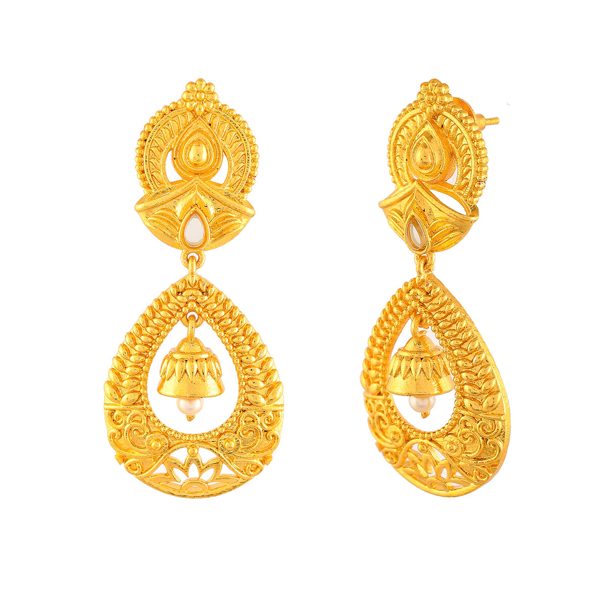 Ethnic style drop earrings, designed as a tribute to the beauty and essence of Indian festivals. Made from brass and yellow gold plated, each earrings has been embellished with a single white pearl. Pair with Indian attire.