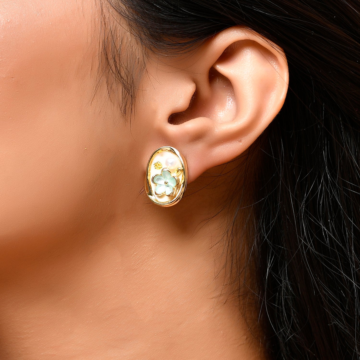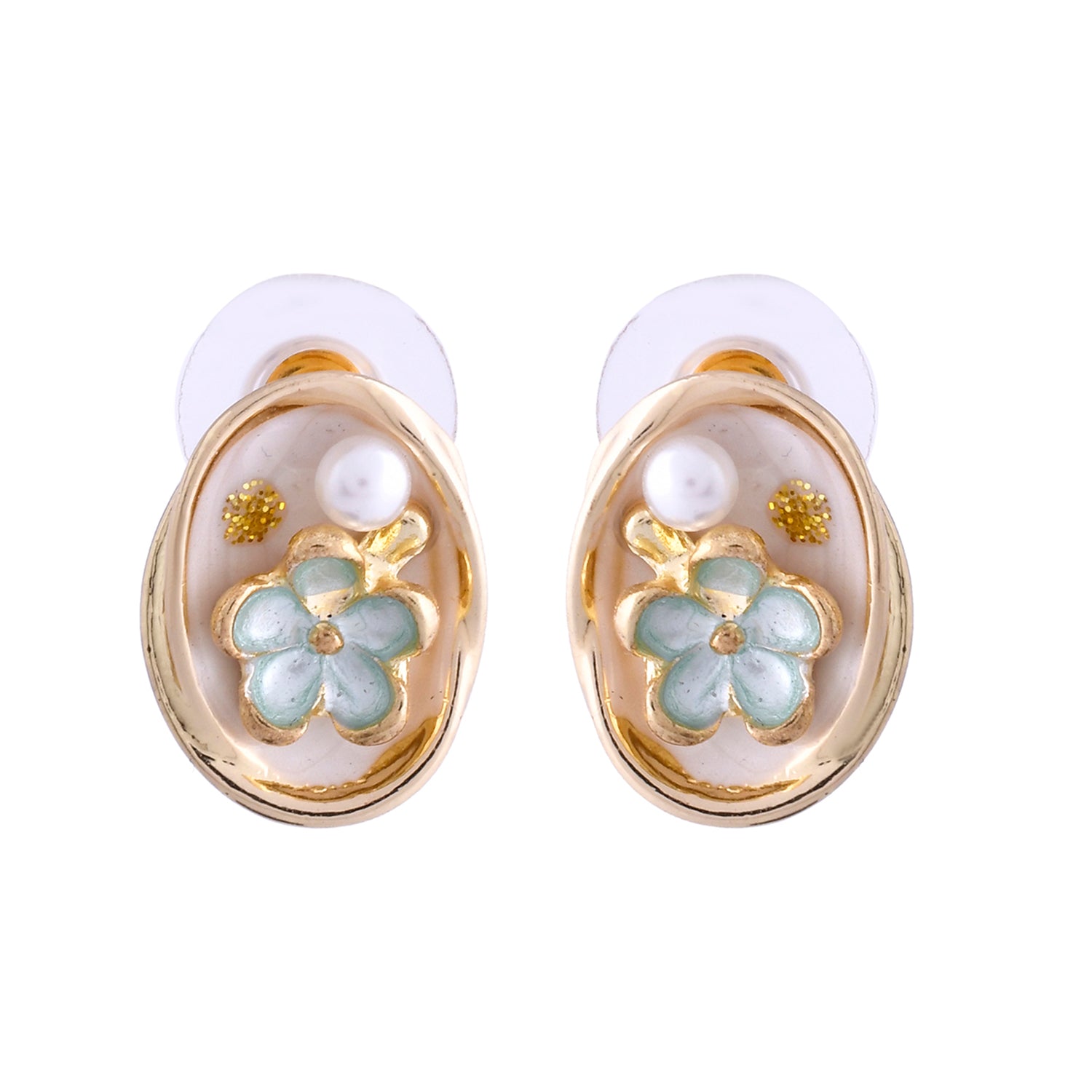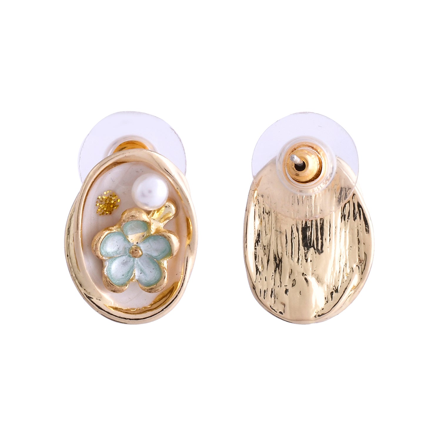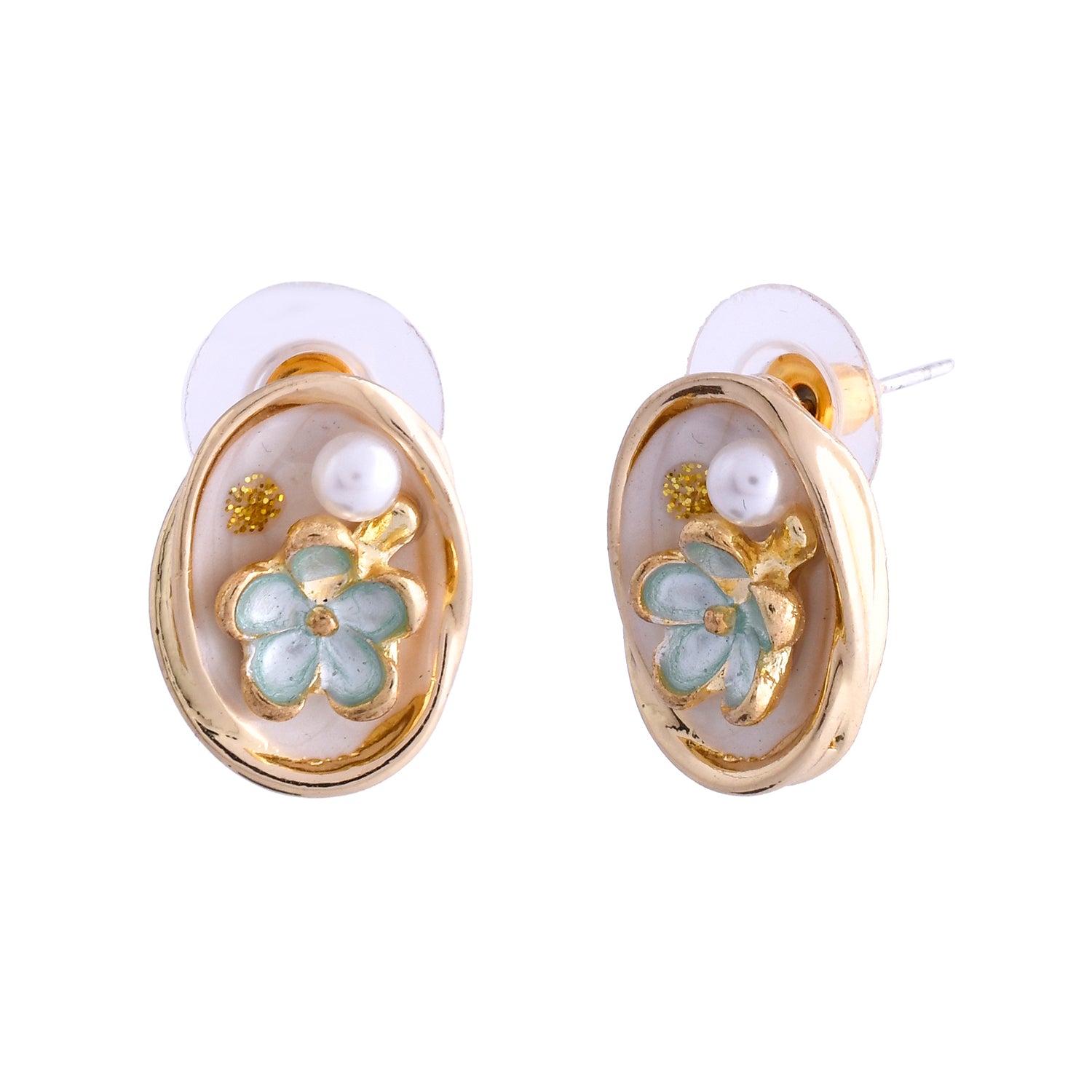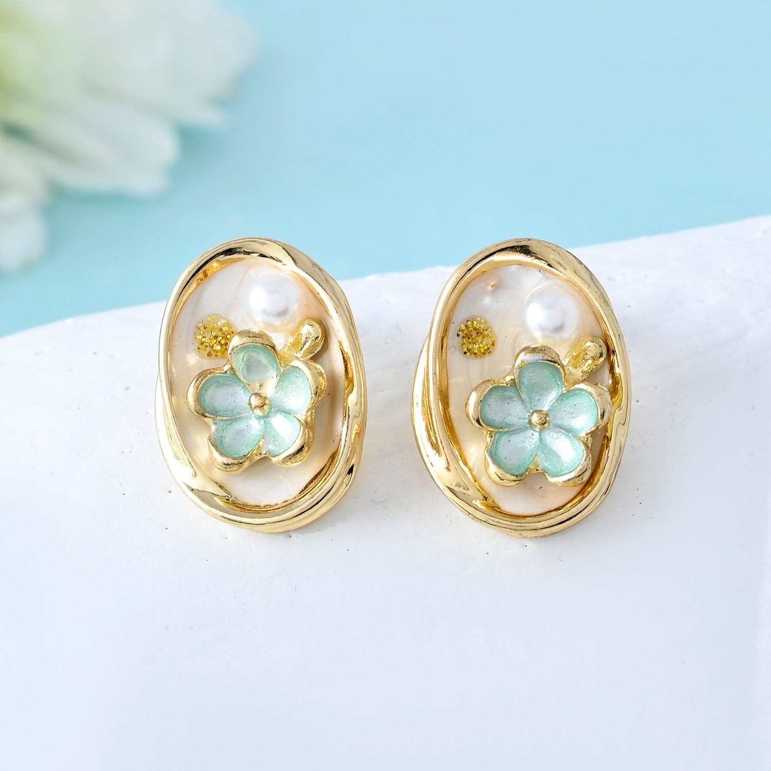 The Daylight Golden Stud Earrings from the Blossom Collection are a stunning blend of elegance and contemporary design, perfect for any occasion. Crafted from high-quality brass and plated with gold, these earrings feature a delicate enamel flower in a soft blue hue, complemented by a pearl and golden accents. The intricate design showcases a beautiful floral motif that adds a touch of sophistication to any outfit. Ideal for everyday wear, these earrings are lightweight and comfortable, making them a versatile addition to your jewelry collection. Whether you're dressing up for a festive event, a wedding, or simply adding a chic touch to your work attire, these earrings are sure to make a statement. They also make a thoughtful gift for loved ones on special occasions such as Valentine's Day, Diwali, Rakshabandhan, Christmas, and New Year. Elevate your style with these elegant and timeless earrings that exude charm and grace.