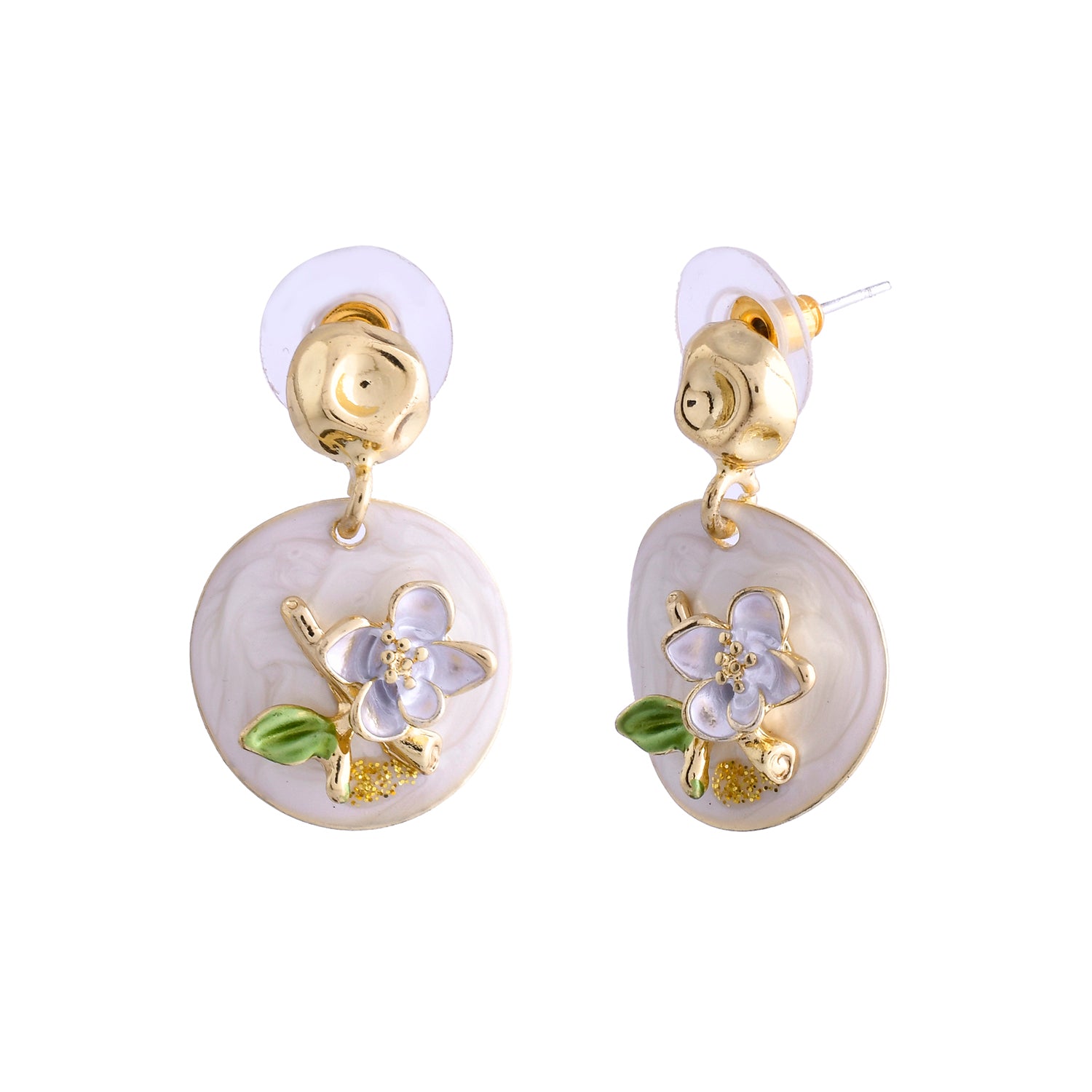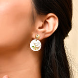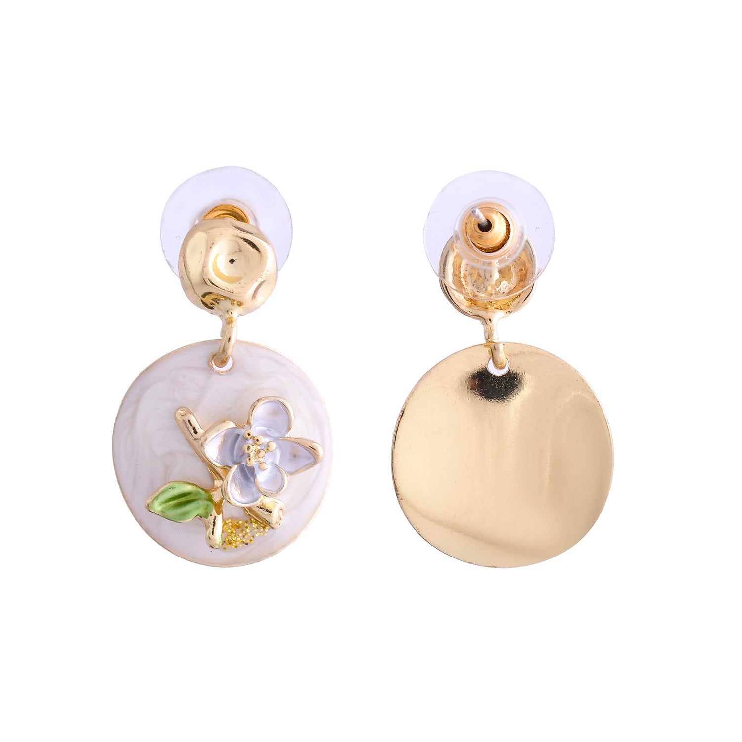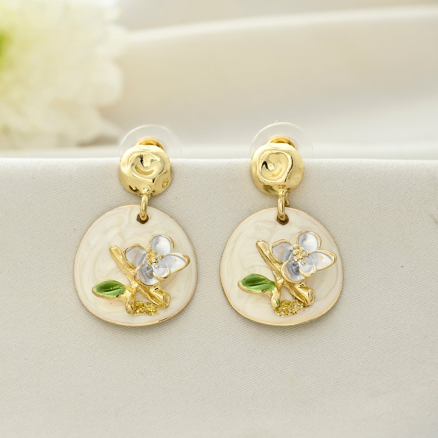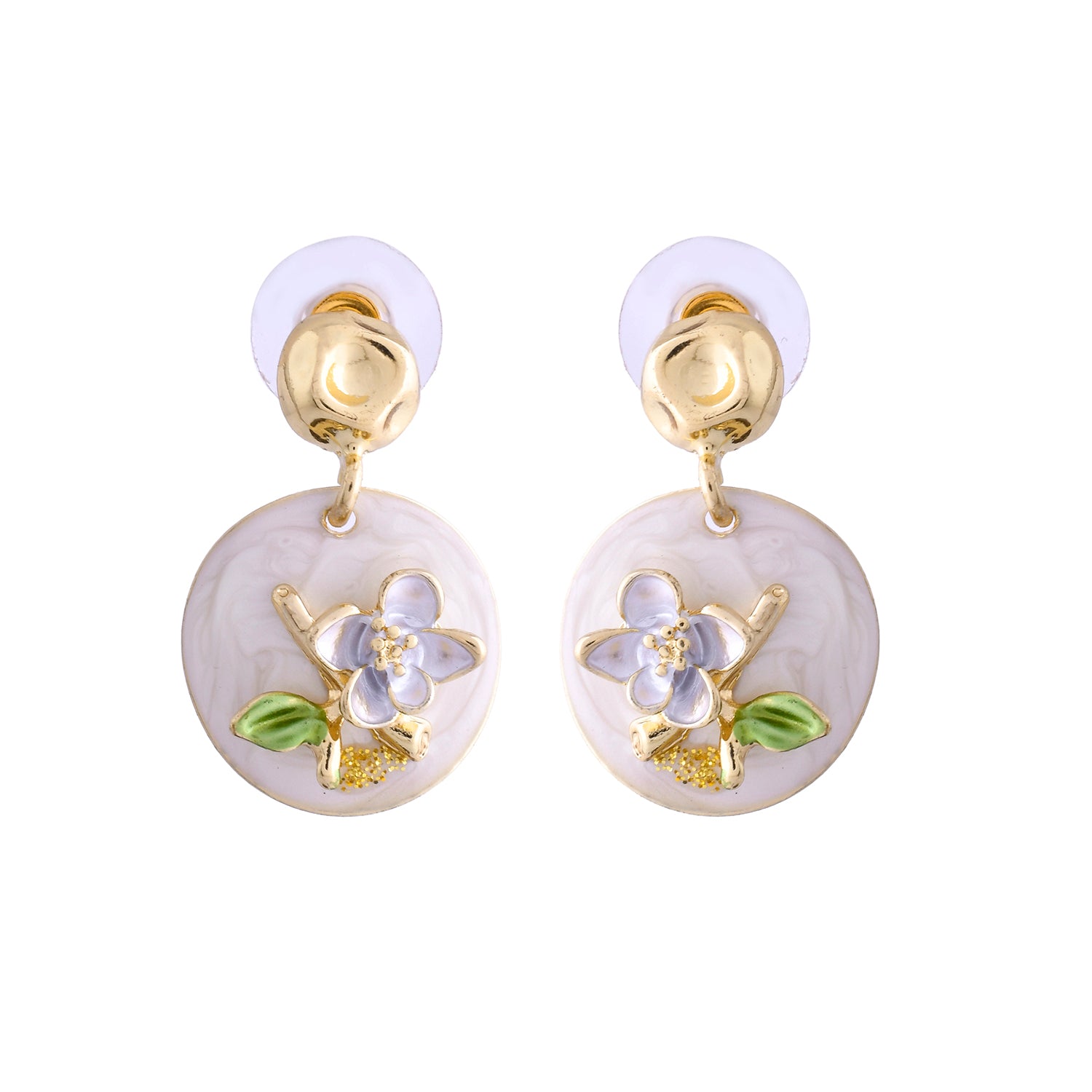 The Dreams Golden Drop Earrings from the Blossom Collection epitomize elegance and contemporary design, making them a standout addition to any jewelry collection. Crafted meticulously from high-quality brass and plated in luxurious gold, these earrings showcase intricate enamel floral patterns that exude sophistication and charm. The harmonious blend of gold, green, and white hues enhances their chic and stylish appeal, perfect for both everyday wear and special occasions. These earrings not only elevate your ensemble but also make a thoughtful gift for loved ones on festive occasions such as Valentine's Day, Diwali, Rakshabandhan, and Christmas. Pair them with traditional or modern outfits to add a touch of elegance and grace to your look.
