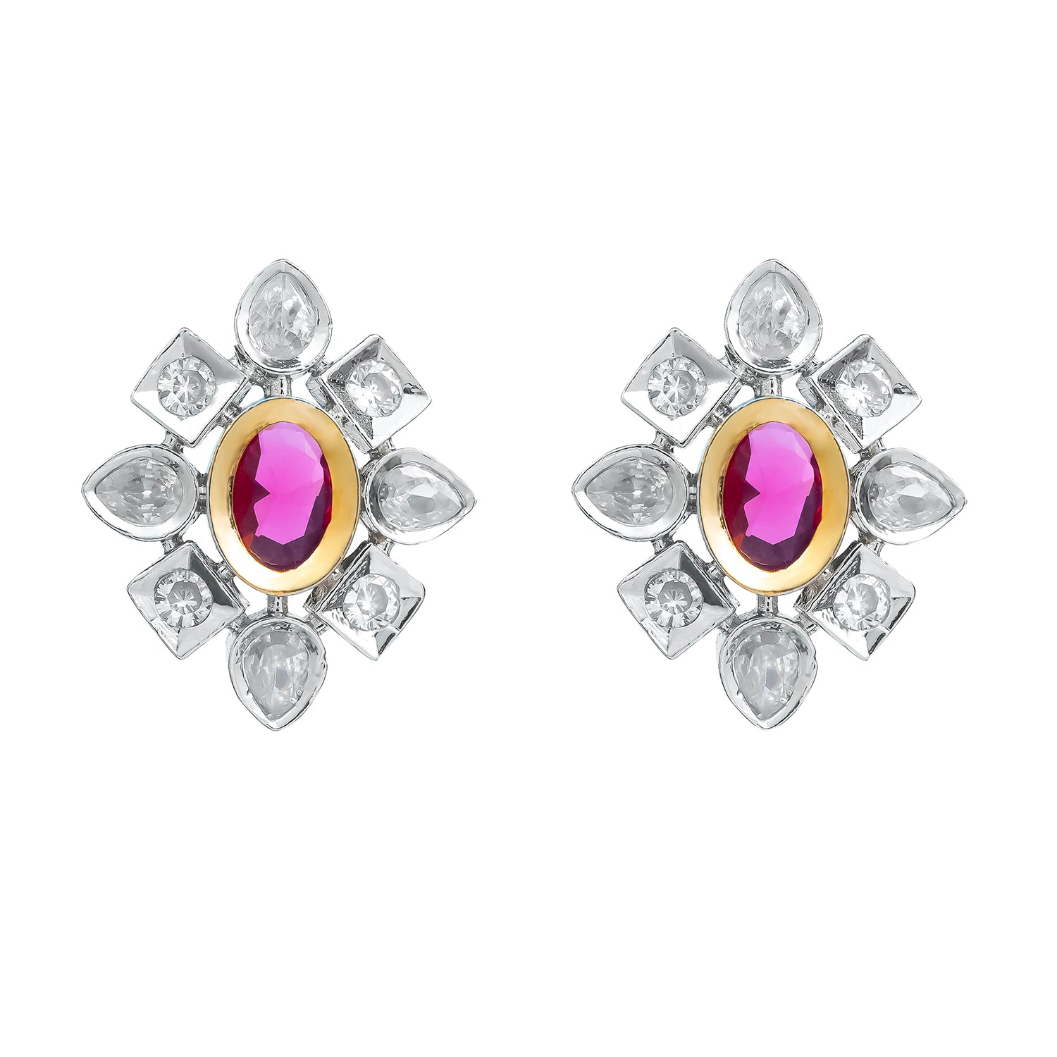 The Gold Elegance Pink Aura Blossom Stud Earrings are the perfect blend of everyday elegance and ethnic charm. Part of the premium Gold Elegance Collection, these stylish women earrings feature a beautifully sculpted floral-inspired design with a sparkling pink oval center stone surrounded by a combination of marquise and square-cut CZ/American Diamond stones. The geometric floral pattern adds a refined, graceful touch that works beautifully with both casual ethnic wear and festive outfits. Crafted from high-quality brass and finished with premium two-tone plating, a rich blend of warm gold and rhodium, these tops earrings for women offer a subtle yet striking sparkle suitable for daily office wear, school teachers, college-goers, and women who prefer lightweight, classy accessories for everyday dressing. The versatile design pairs seamlessly with kurtis, cotton sarees, salwar suits, Indo-western attire, and traditional festive ensembles. Elegant, comfortable, and thoughtfully crafted, these earrings also make a wonderful gift for women, ideal for your lover, wife, mother, sister, colleague, or friend.