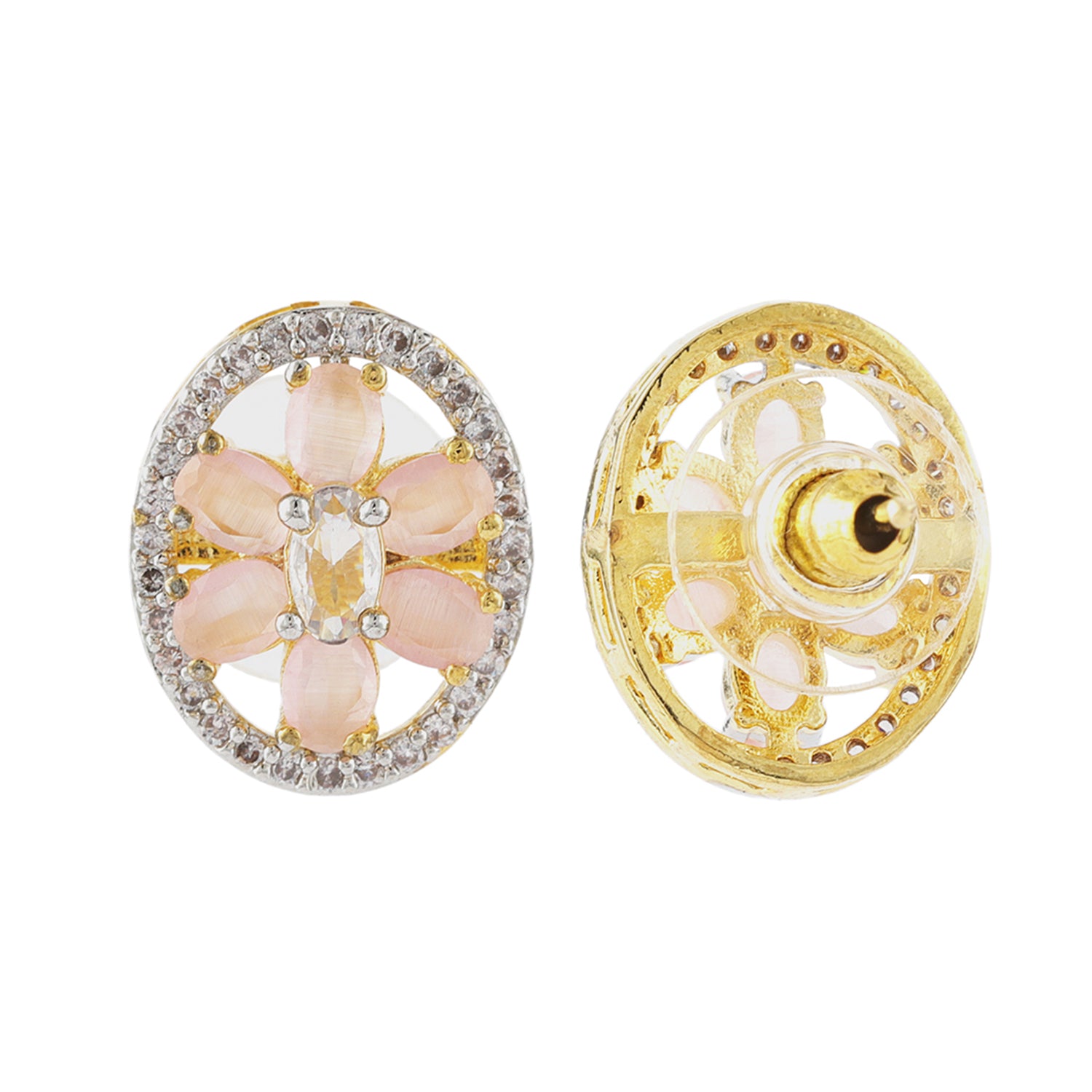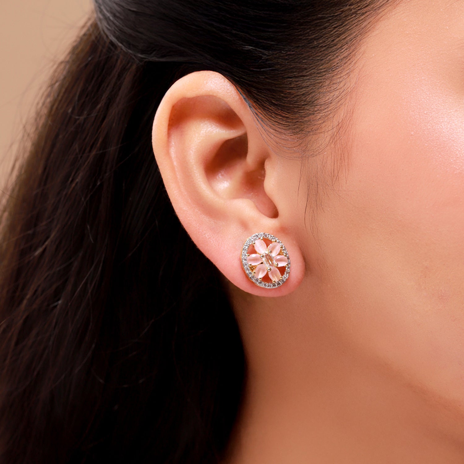 The Gold Elegance Rose Petal Halo Stud Earrings by Voylla are designed for women who appreciate timeless beauty with a soft feminine touch. Inspired by blooming petals, these earrings feature an elegant oval silhouette where blush-toned stones are carefully arranged like flower petals around a shimmering cubic zirconia centre. The surrounding halo of fine CZ stones enhances the brilliance, creating a balanced design that feels refined, graceful, and effortlessly luxurious. Crafted in brass and finished in a warm gold tone, these stud earrings showcase precise stone setting and a smooth polished finish that highlights their intricate detailing. The soft pink hues paired with sparkling white accents make them versatile and flattering, adding a gentle glow to both western and ethnic outfits. Lightweight and thoughtfully designed, they offer comfort while maintaining a polished, premium appearance. Perfect for day-to-evening styling, these earrings complement everything from dresses and co-ord sets to sarees and festive ensembles. Their floral-inspired design makes them a beautiful choice for celebrations, special occasions, or meaningful everyday moments. Whether worn as a personal style statement or gifted to someone special, these earrings reflect elegance, care, and timeless charm. A thoughtful expression of love and celebration, the Gold Elegance Rosé Petal Halo Stud Earrings make an ideal gift for Valentine’s Day, anniversaries, birthdays, or cherished milestones, adding sparkle to moments that matter most.