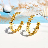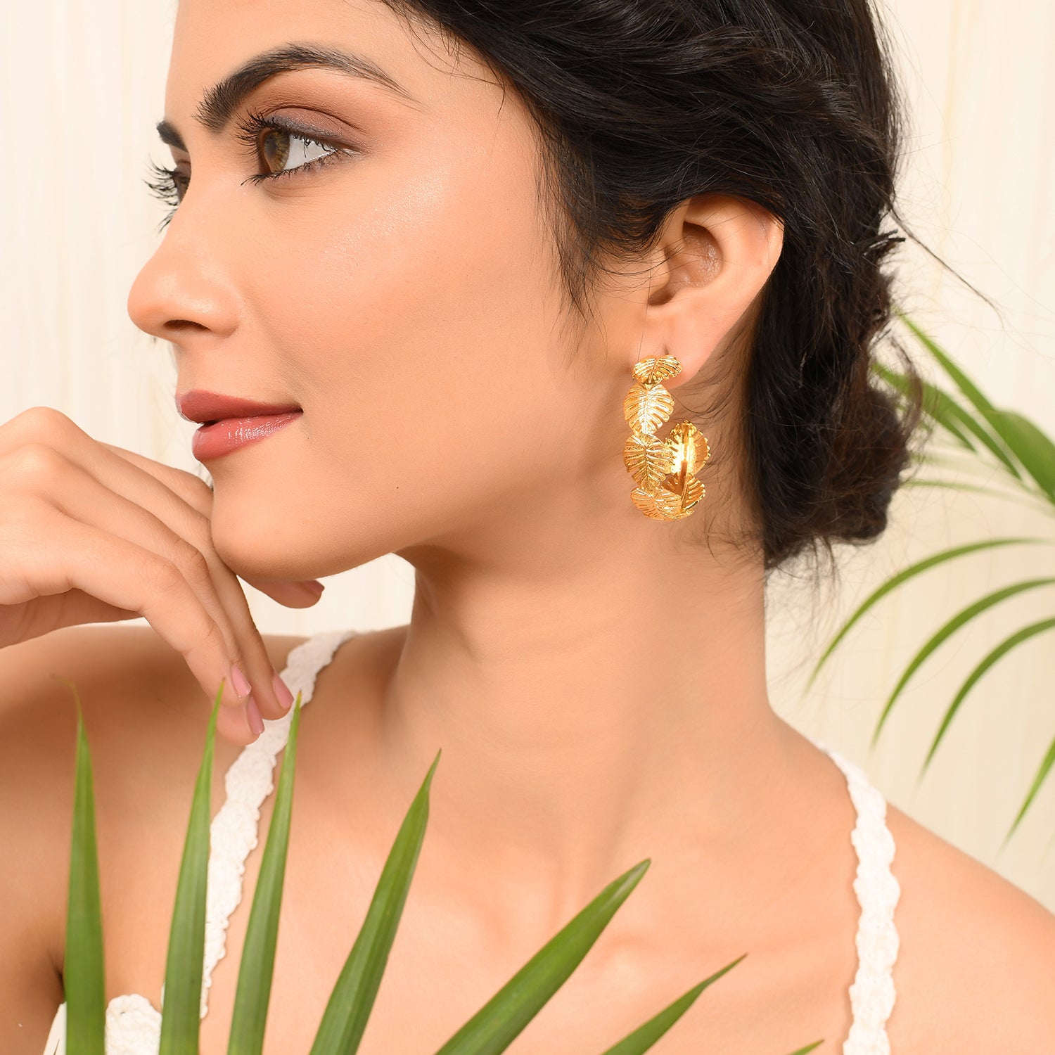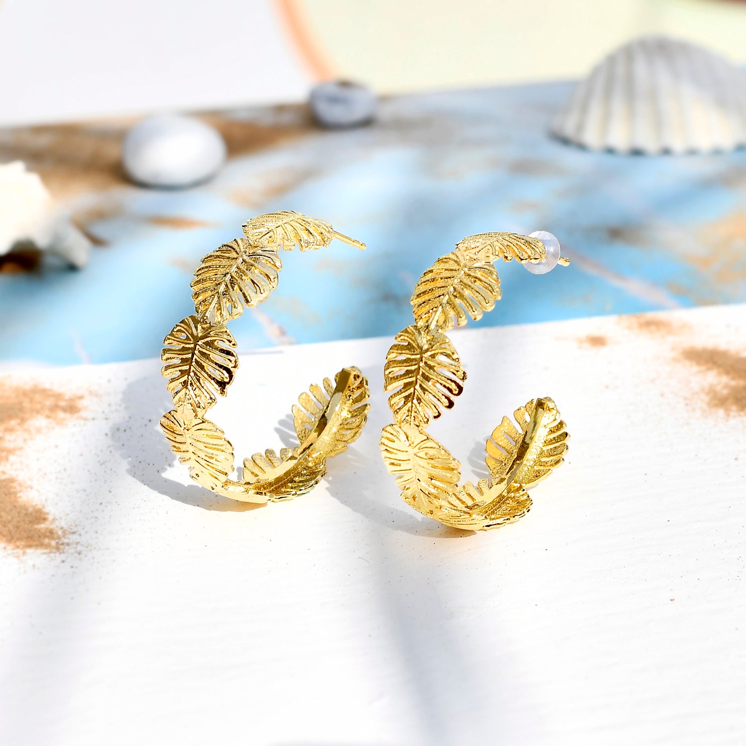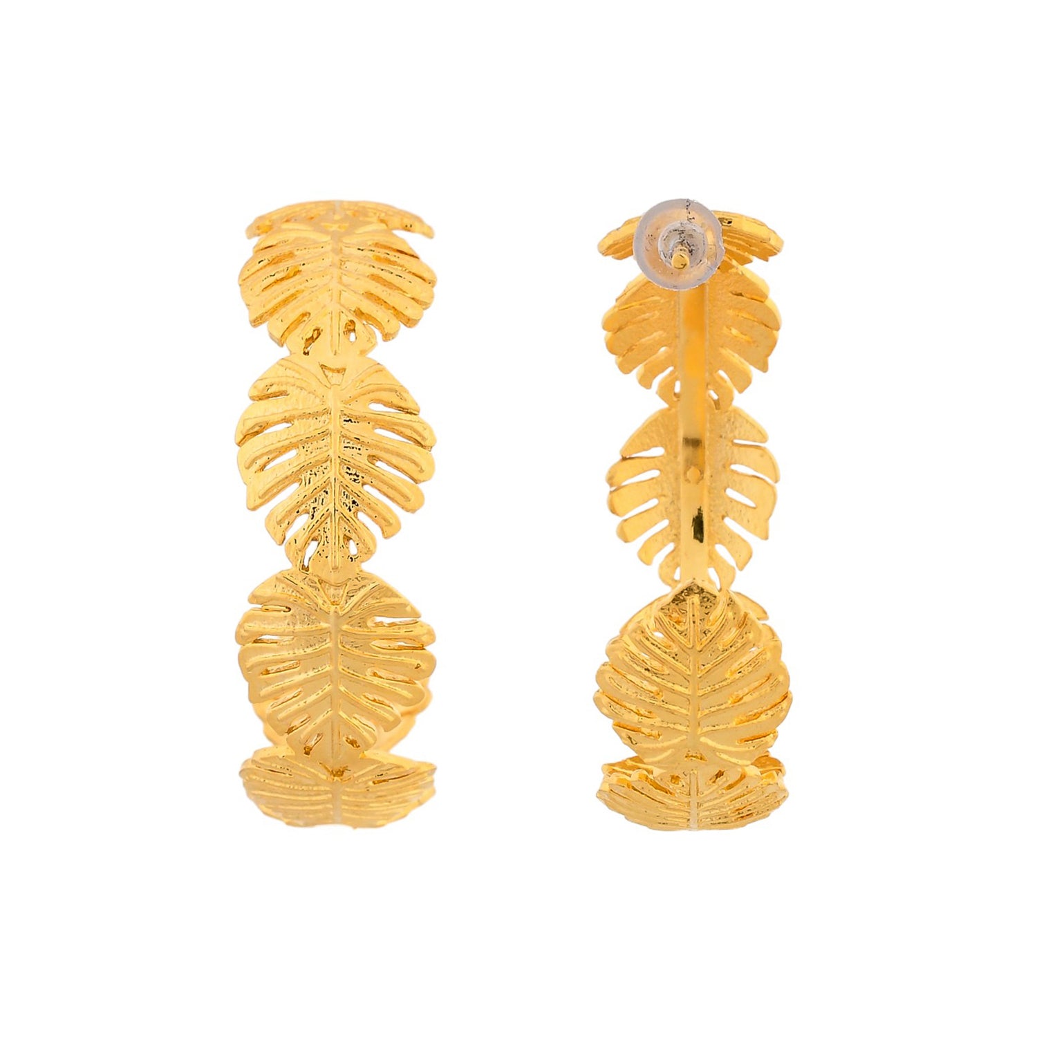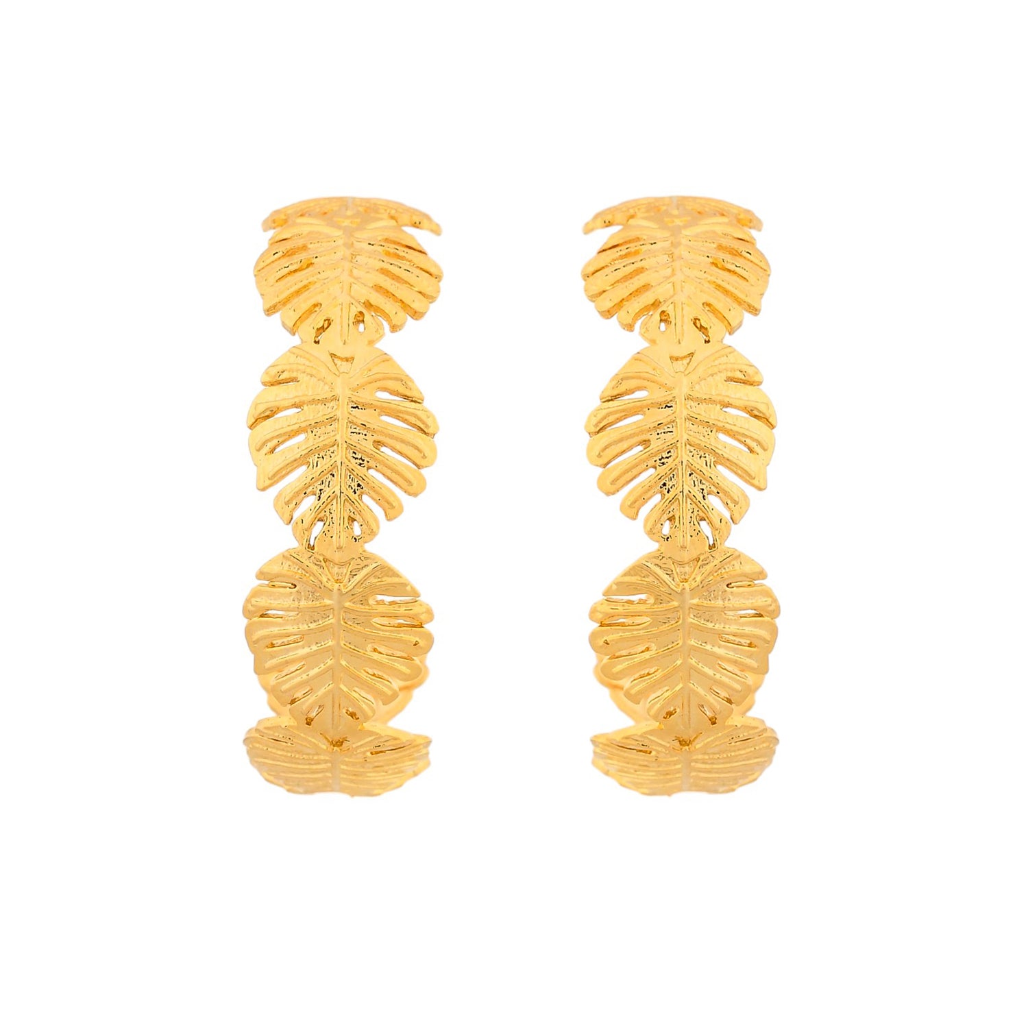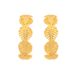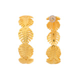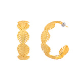 Inspired by the beaches, tropics and their many fascinating elements, these hoop style earrings feature multiple palm leaves motifs. Made from brass and yellow gold plated, the chunky earrings promise to be a comfortable wear at all times and can be paired with just about everything.