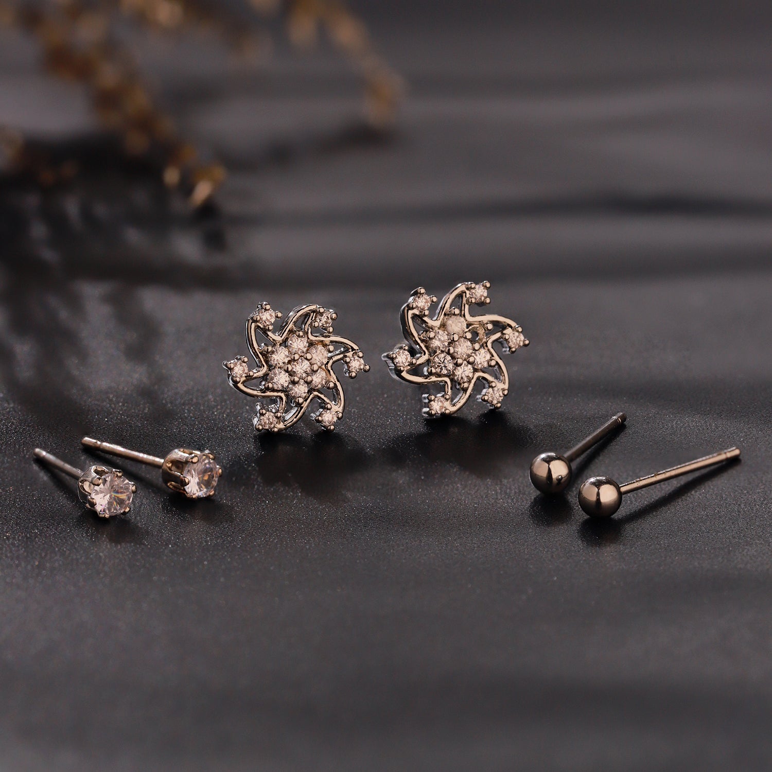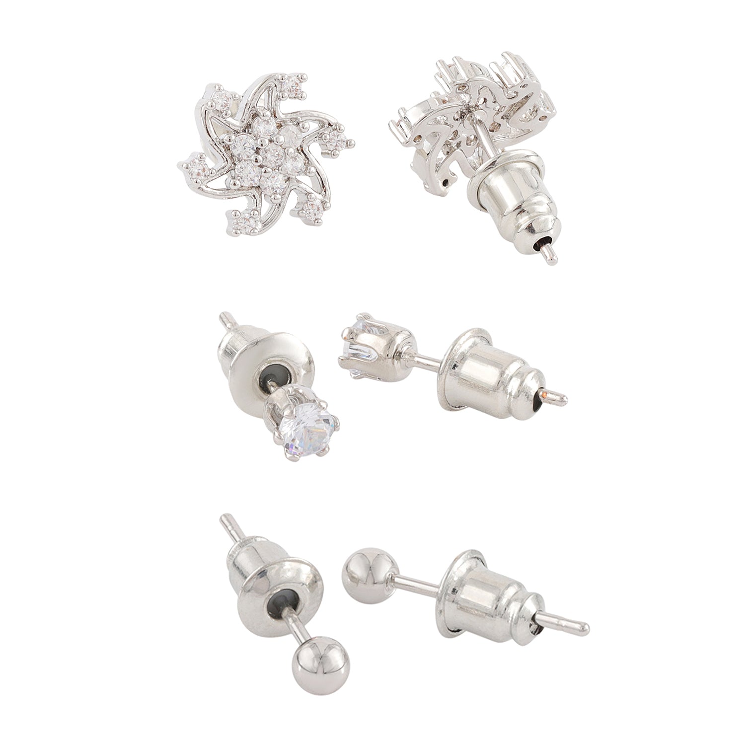 Why stop at one when you can have three, The Korean Bling Silver Spark Trio Earrings Combo is a versatile earrings set for women that gives you multiple ways to shine. Part of the Korean Bling collection, this earrings combo for women includes three chic stud designs, a dazzling floral sparkle stud, a timeless solitaire crystal stud, and a sleek polished ball stud. Crafted with high-quality alloy and finished in luminous white rhodium, this set of earrings combines glamour with everyday practicality.This Korean style earrings combo is perfect for mixing up your look. The floral sparkle studs make beautiful Korean statement earrings for evenings, the solitaire studs add elegance as everyday wear earrings, and the polished balls keep things minimal for workwear or casual days. Lightweight, stylish, and easy to pair, these studs are trendy earrings for women who love flexibility in their accessories. They’re also a thoughtful gift for her, a versatile earrings gift for birthdays, anniversaries, or festive occasions. Whether you’re searching for a gift for girlfriend, chic women gift, or elegant jewellery gifts for women, this earrings set for women is an instant classic.