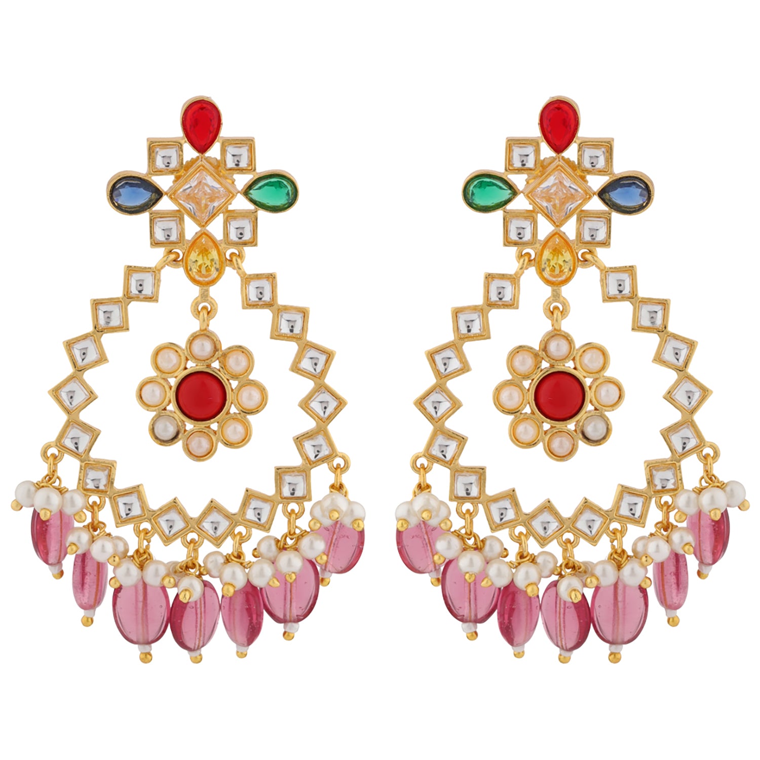 Radiate timeless beauty and cosmic charm with the Navratan Starlit Gems Dangle Earrings, a perfect harmony of tradition, color, and craftsmanship. Inspired by the celestial symbolism of the Navratan, the nine sacred gems that represent divine energy, balance, and prosperity, this pair from the Navratan Collection captures the brilliance of starlit nights and royal opulence. Expertly handcrafted in brass with a luxurious yellow gold plating, these designer earrings for women blend regal design with vibrant gemstone hues. The intricate geometric frame adorned with mirror-set stones gracefully leads to a stunning floral centerpiece, finished with deep red accents, luminous pearls, and elegant maroon bead drops that add movement and richness to every look. Perfect for women who adore jewelry that tells a story, these gold earrings exude festive radiance and timeless allure. Whether it’s a wedding celebration, festive occasion, or pooja wear, these earrings instantly elevate your ensemble with their balance of color, symmetry, and elegance. They also make a thoughtful gift for women, a perfect gift for wife, anniversary gift, or Valentine’s Day surprise, carrying the symbolism of beauty, grace, and cosmic harmony.