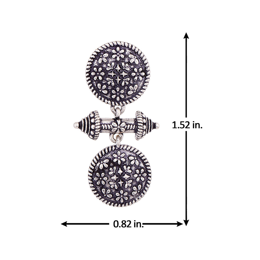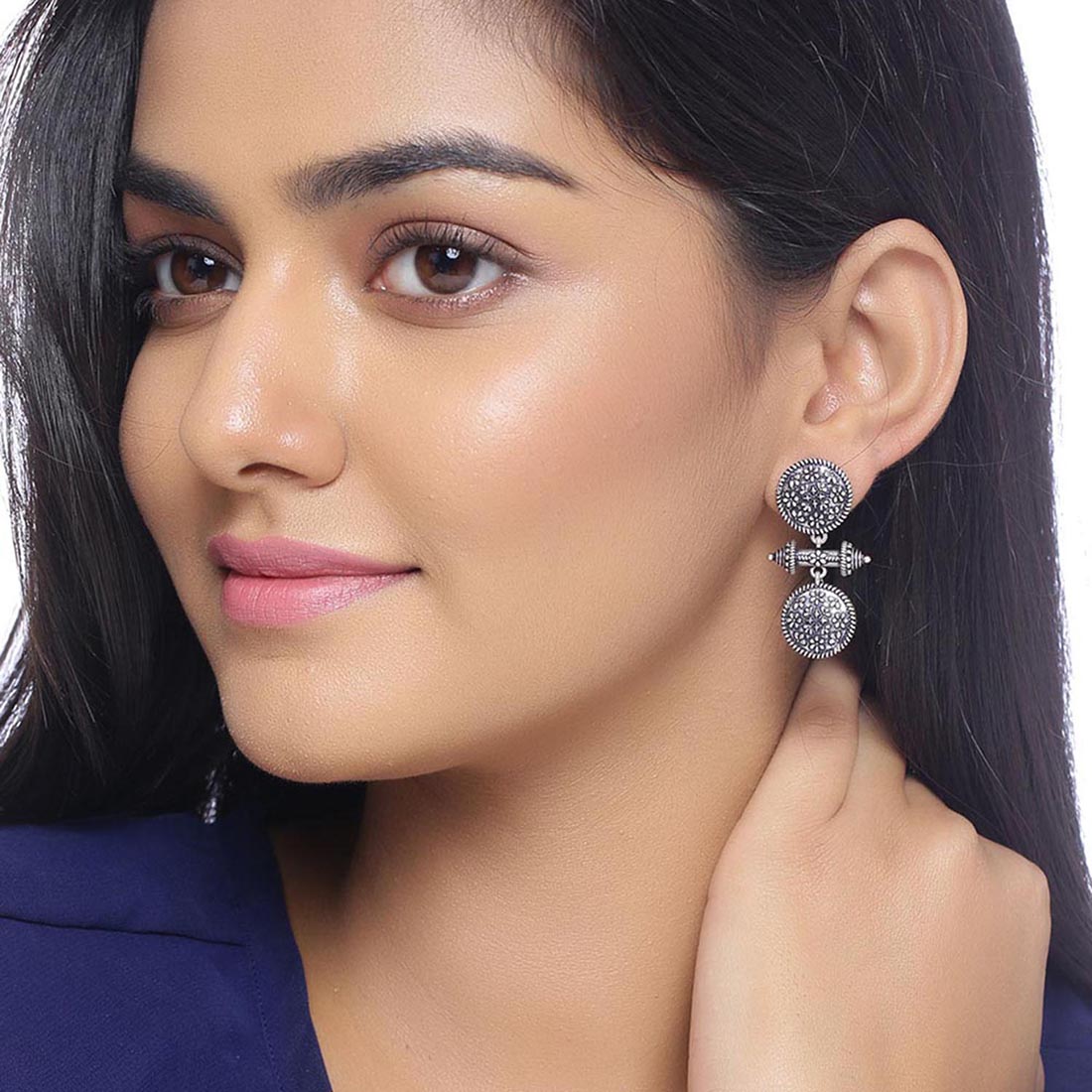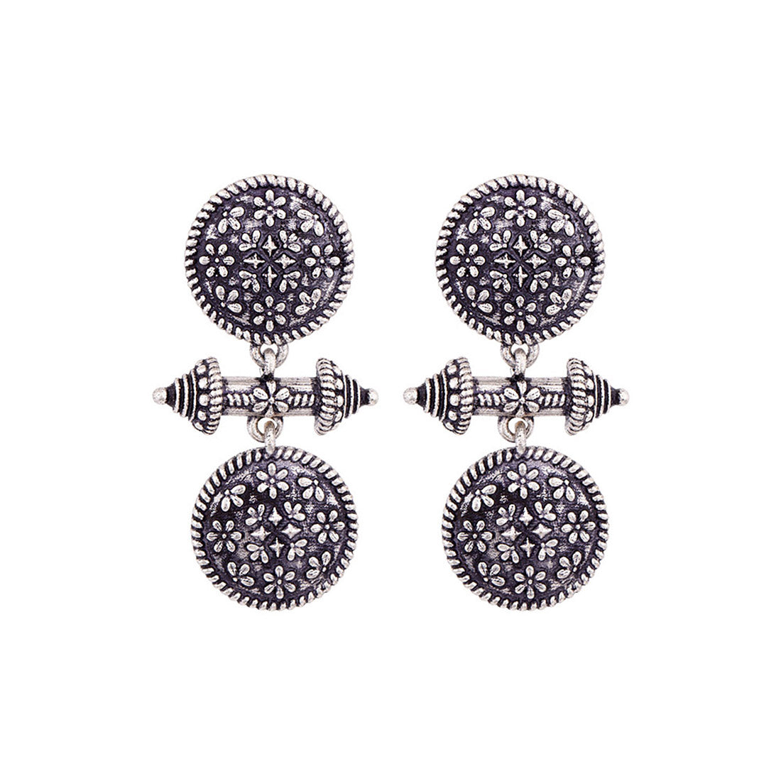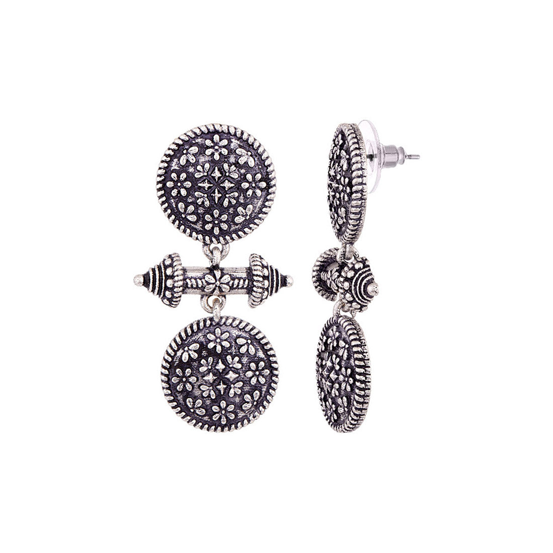 Circles geometric design drop earrings. Made from brass and oxidised silver plating. Wear with ethnic and Indo-Western looks.