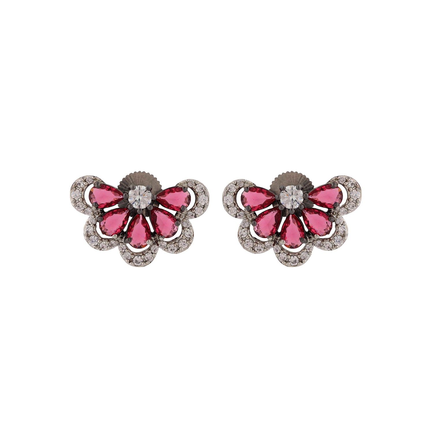 The Royal Romance Ayiana Stud Earrings in black rhodium plating bring a bold and modern twist to classic royal beauty. Part of the Royal Romance Collection, these Earrings for women are designed for those who love deep contrast, rich color, and statement style. Crafted from high quality brass and finished with sleek black rhodium plating, these women Earrings beautifully highlight the vivid ruby pink stones and sparkling cz Earrings. The dark metallic base enhances the brilliance of the stones, making every petal of the floral design look more vibrant and eye catching. These Stud Earrings are perfect for evening parties, festive celebrations, romantic dinners, and special occasions where you want to make a striking impression. Pair them with ethnic wear or western outfits to add a touch of luxury and drama to your look. Lightweight, comfortable, and designed for all day wear, these Earrings for women also make a thoughtful gift for women, a stylish gift for lover, a meaningful valentines day gift, or a beautiful gift for self and self love.
