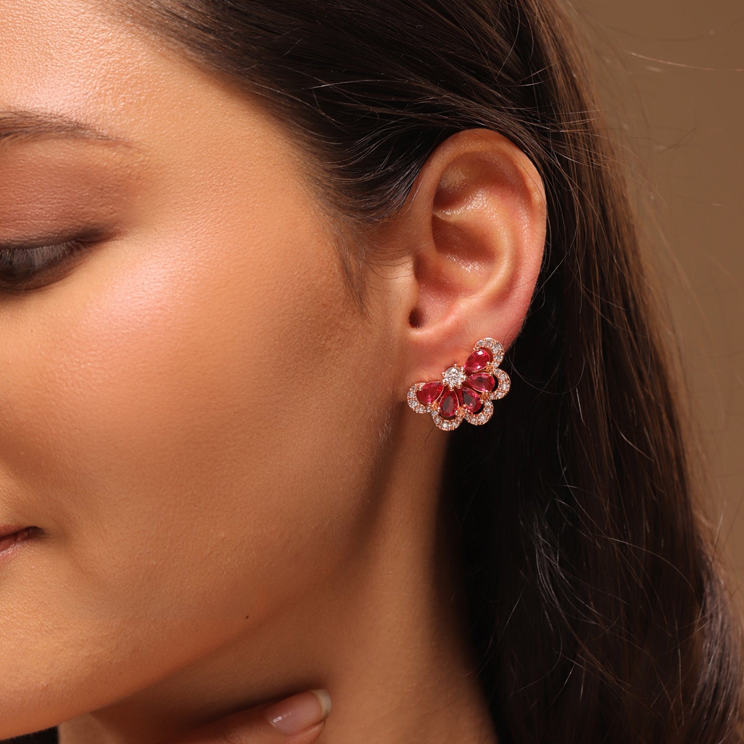 The Royal Romance Ayiana Stud Earrings in rose gold plating are designed to bring out a soft yet luxurious glow that beautifully complements every skin tone. Part of the Royal Romance Collection, these earrings reflect a romantic floral design inspired by royal jewellery and timeless love stories. Crafted from high quality brass and finished with a warm rose gold plating, these Earrings for women are adorned with deep ruby pink stones and brilliant cz Earrings that sparkle with every movement. The delicate flower shaped design adds a graceful charm while the shimmering American diamond Earrings around the edges create a glowing halo effect. These women Earrings are perfect for adding elegance to festive wear, weddings, evening parties, or romantic date nights. Whether you style them with a saree, lehenga, gown, or a chic western outfit, these Stud Earrings make sure you stand out with effortless beauty and confidence. Comfortable, lightweight, and easy to wear, these Earrings for women also make a meaningful gift for women, a thoughtful women gift for your lover, or a beautiful valentines day gift, galentine gift, or gift for self to celebrate love and self love.