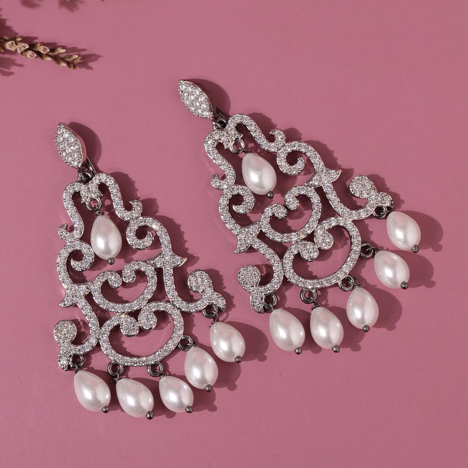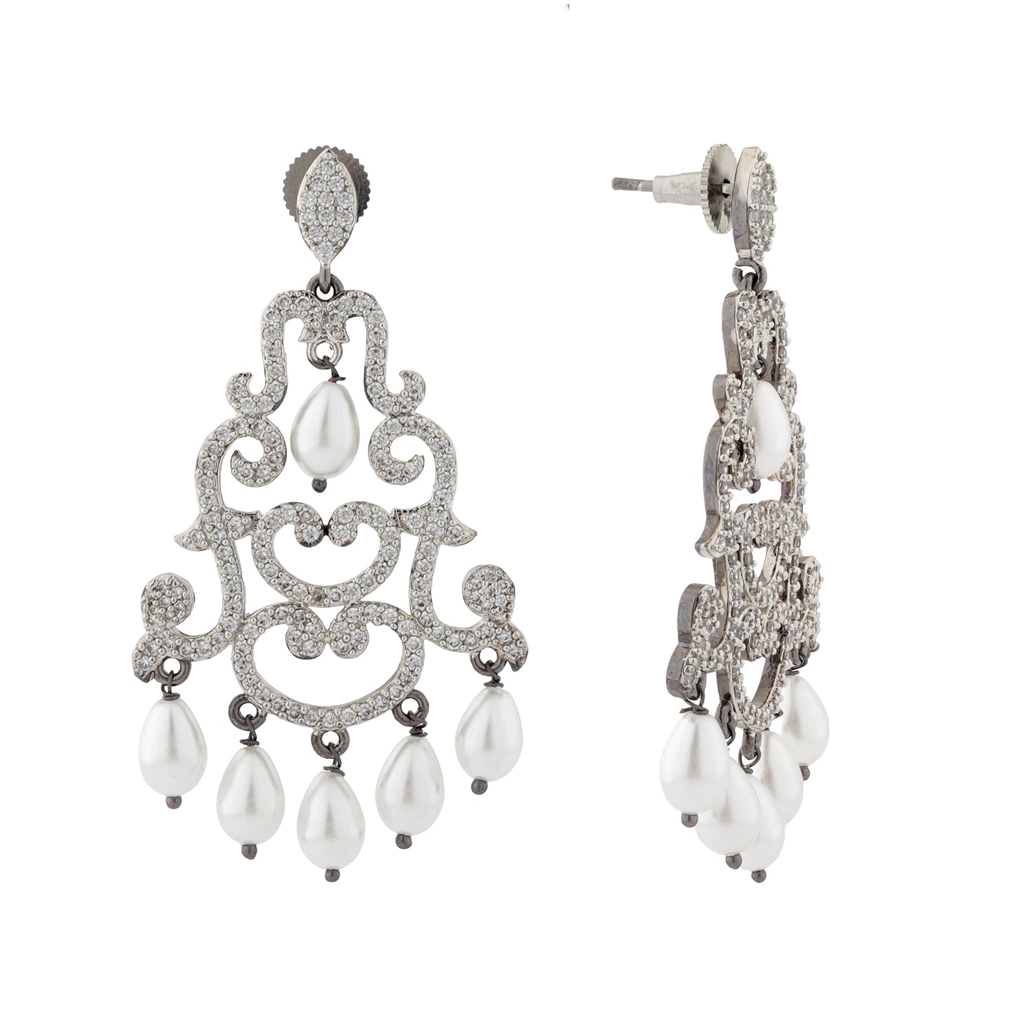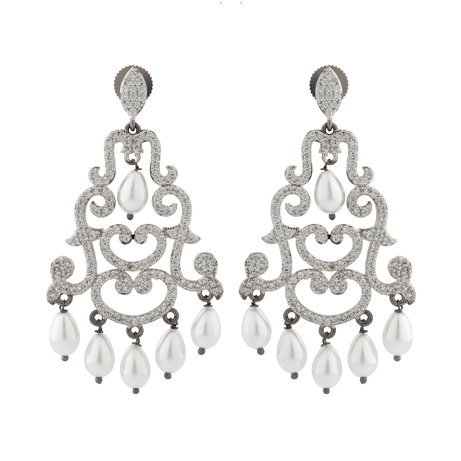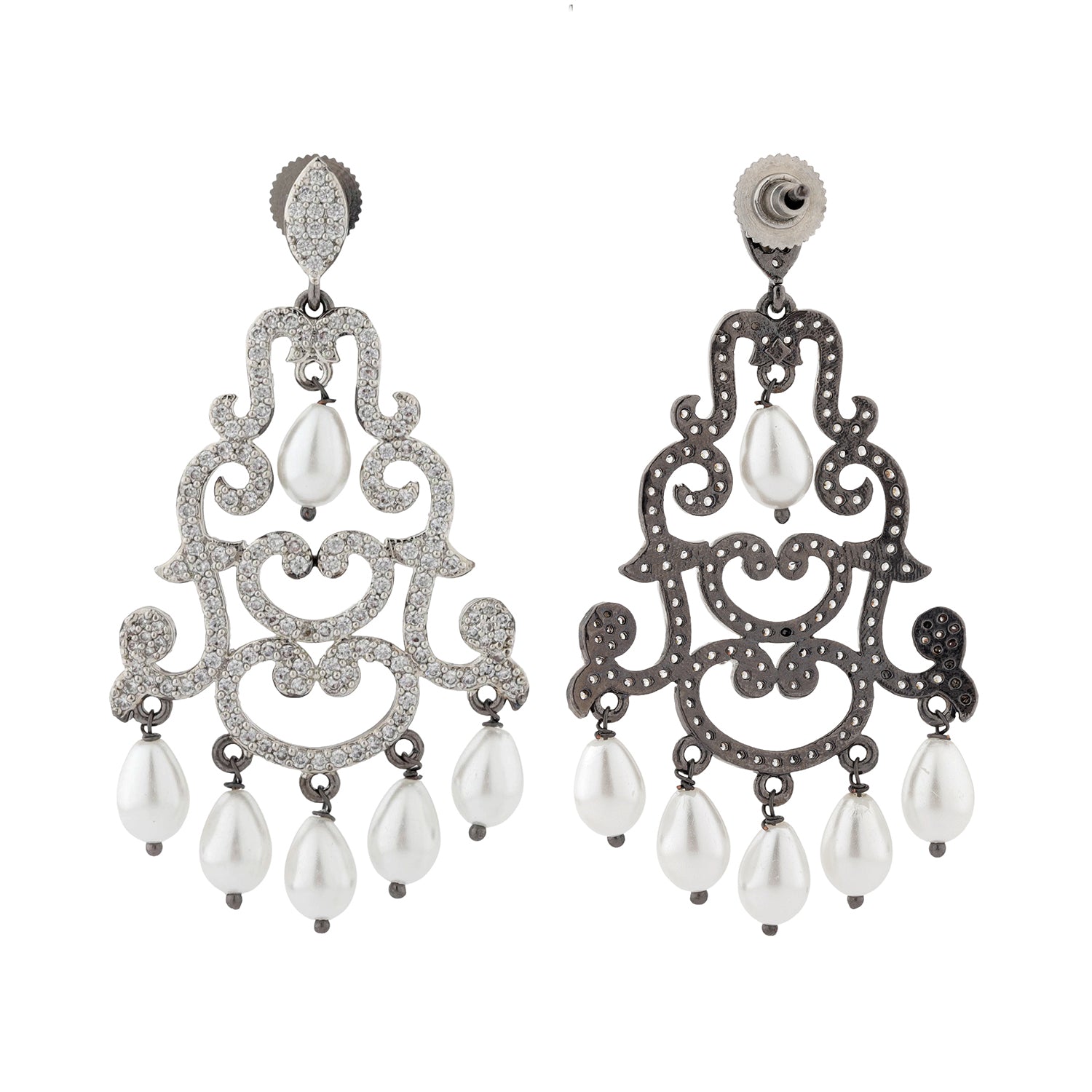 The Royal Romance Margaret Statement Earrings are designed to make an unforgettable impression. Part of our signature Royal Romance Collection, these Earrings for Women capture the essence of regal romance through intricate craftsmanship and elegant detailing. The ornate chandelier design is inspired by royal motifs, featuring graceful swirling patterns encrusted with sparkling american diamond CZ stones that shimmer beautifully with every movement. Delicate pearl drop accents add a soft, classic touch, enhancing the overall luxurious appeal of these women earrings.Crafted from high quality brass and finished with premium black rhodium plating, these earrings offer a perfect balance of durability and refined beauty. The cool black rhodium tone blends effortlessly with the brilliance of CZ stones and the luminous glow of pearls, creating a sophisticated and feminine color palette. Designed to elevate both traditional and contemporary outfits, these statement earrings are ideal for women who love timeless elegance with a modern edge. Whether worn for weddings, festive celebrations, romantic date nights, or special occasions like valentines day and galentine day, these earrings for women add instant glamour and confidence. They also make a meaningful gift for women, a thoughtful gift for lover, or a beautiful self love purchase to celebrate your personal style.