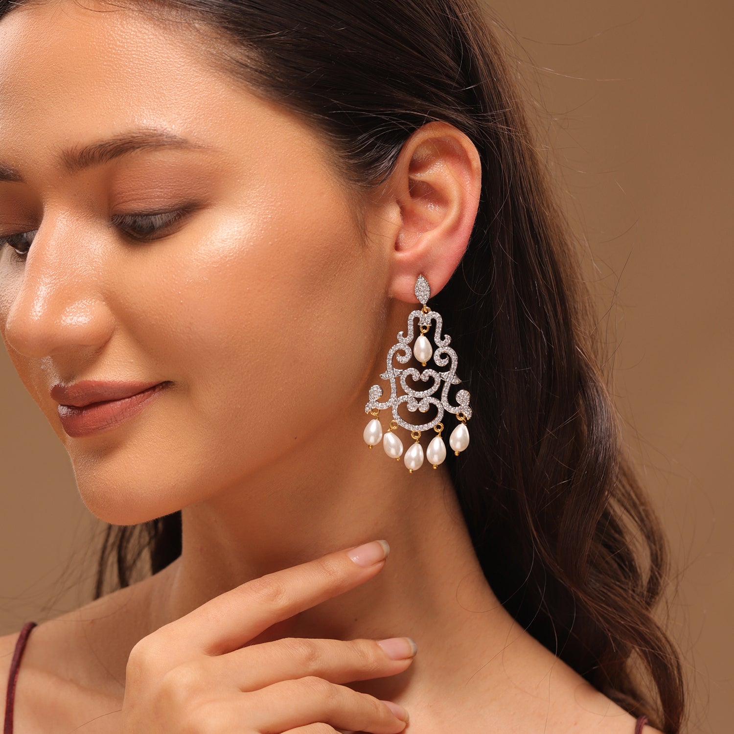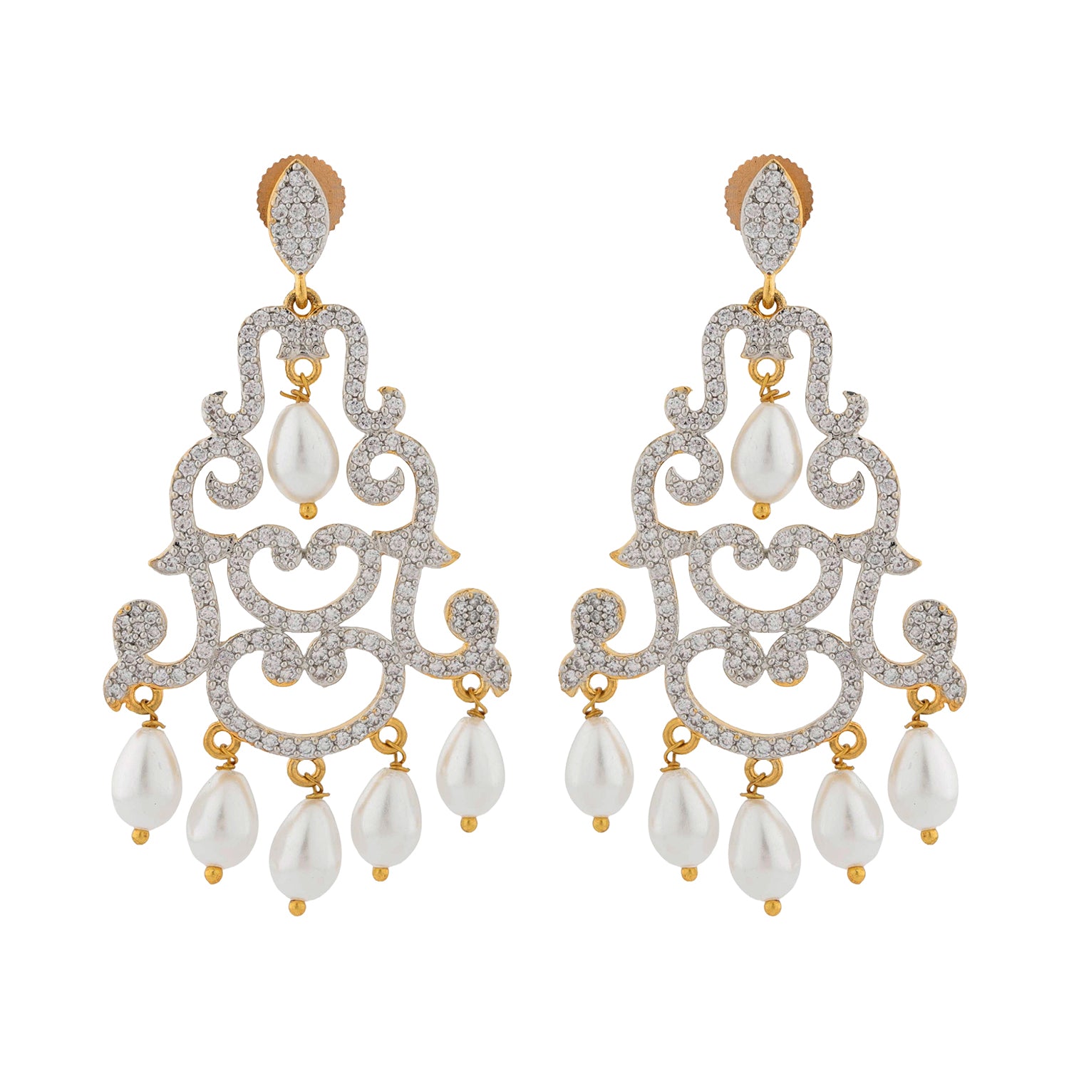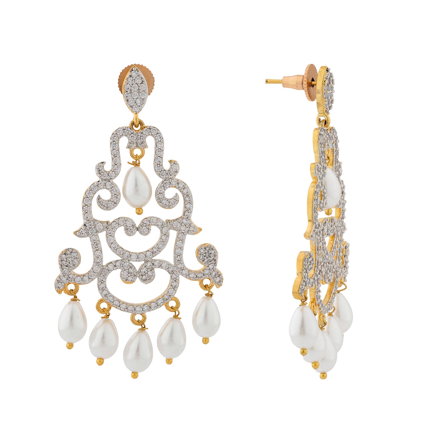 Celebrate timeless elegance with the Royal Romance Margaret Statement Earrings, a signature piece from the Royal Romance collection. Designed to reflect regal beauty and romantic charm, these Earrings for Women feature an ornate chandelier silhouette with graceful curves and classic detailing. Sparkling american diamond CZ earrings are delicately set across the design, enhanced by elegant pearl drops that add softness and sophistication. Crafted using premium quality brass and finished with luxurious yellow gold plating, these women earrings offer durability, comfort, and long lasting brilliance. The contrast of shimmering white CZ earrings with the warm golden tone creates a refined statement look. These earrings for women are perfect for elevating both traditional and contemporary outfits, making them a must have for special occasions. Whether chosen as a gift for women, a women gift for celebrations, a gift for lover, or a meaningful valentines day gift, these earrings beautifully symbolize romance, confidence, and self love. Ideal for valentines day, galentine day, or a thoughtful gift for self, the Margaret Statement Earrings add grace to every moment.