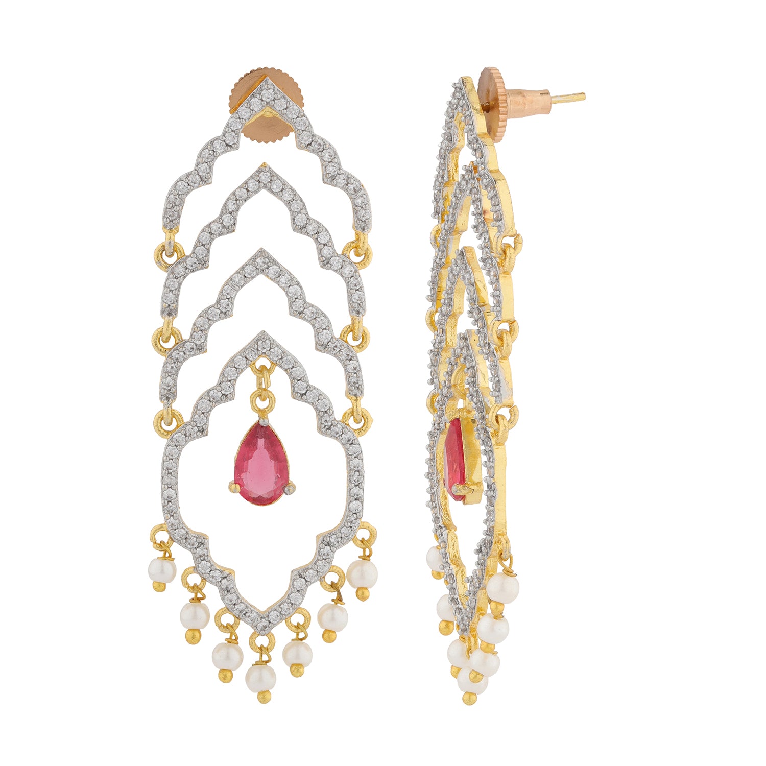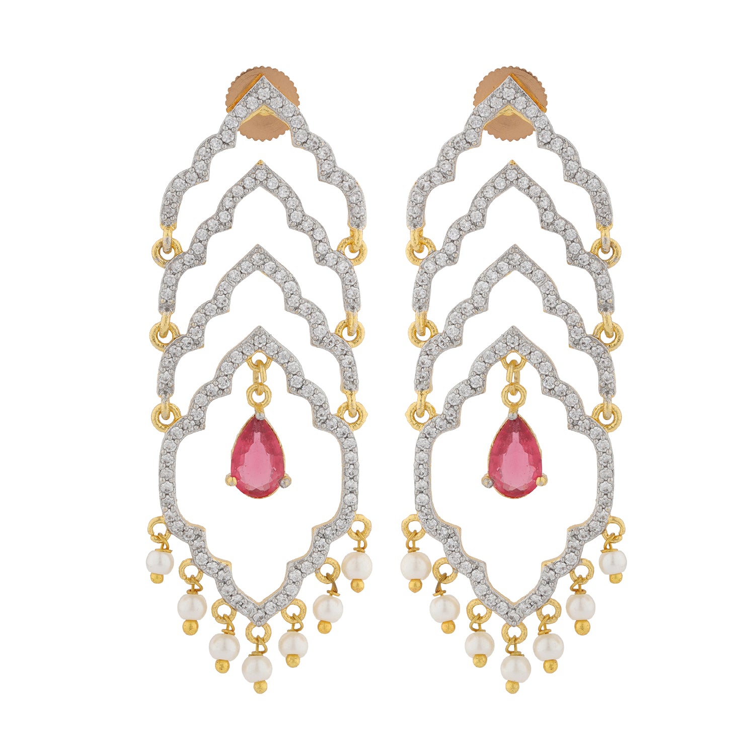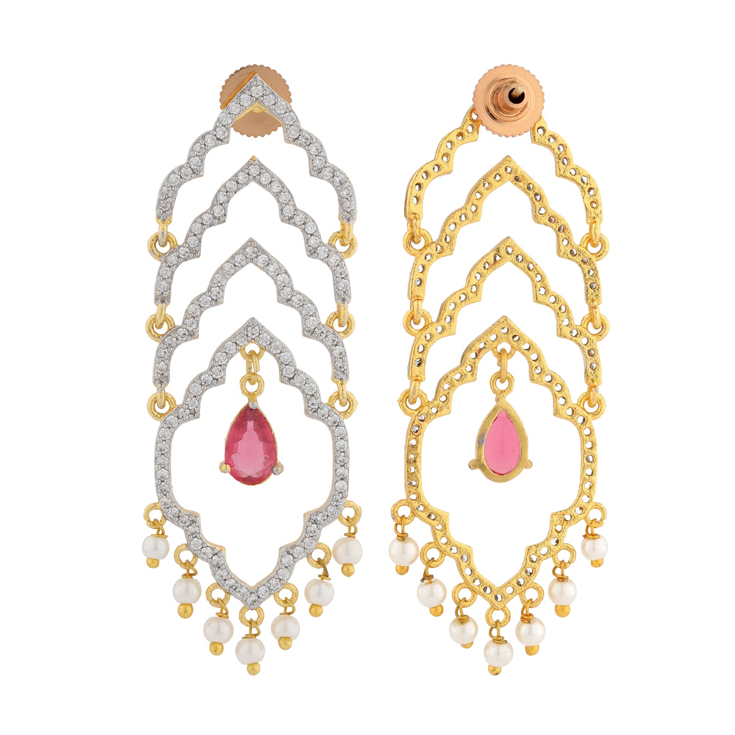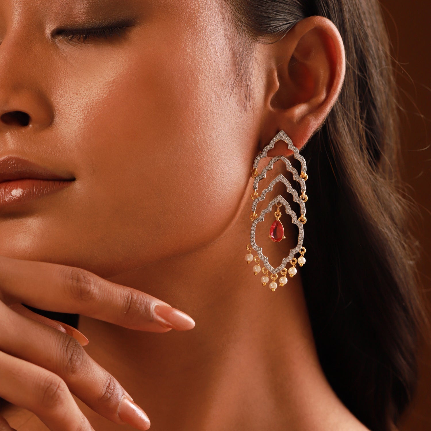The Shahi Dwar Leher Dangler Earrings are a stunning ode to Jaipur’s royal architecture, a design that captures the graceful flow and symmetry of palace arches. With cascading layers of elegance, these earrings truly embody their name “Leher” meaning “wave” , symbolizing movement, grace, and timeless allure. Crafted in high-quality brass and finished with rich yellow gold plating, these designer earrings feature five intricately linked arch motifs, each outlined with shimmering CZ American diamonds. The highlight is a vibrant ruby-red drop stone adds a royal pop of color, while delicate pearl danglings at the base complete the look with soft femininity. Lightweight yet luxurious, these stylish earrings effortlessly bridge traditional and contemporary charm. Perfect for weddings, festive celebrations, or grand evenings, they are a must-have earrings for women who love elegance with an artistic touch. They also make a beautiful gift for wife, gift for girlfriend, or gift for women who adore royal, meaningful jewelry.