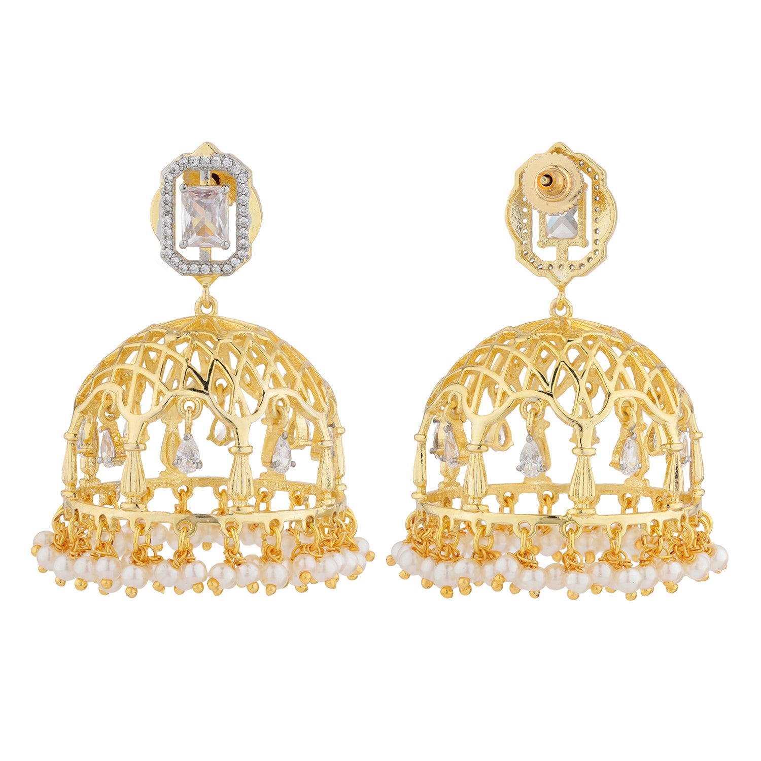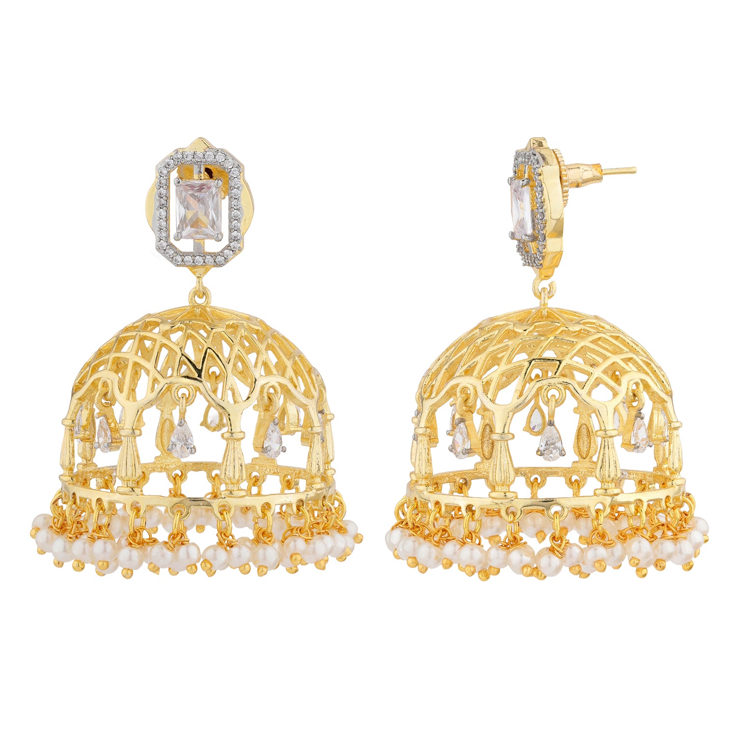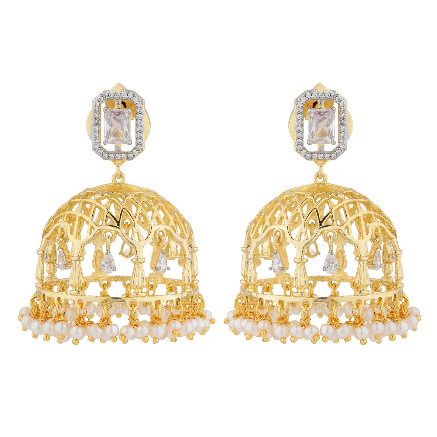 The Shahi Dwar Maharani Sa Jhumka Earrings are a timeless celebration of art, architecture, and adornment, a true reflection of the royal heritage. Every detail of these earrings echoes the grandeur of Jaipur’s palace gateways from their intricately carved domes to the graceful lattice patterns that bring them to life. These designer earrings feature a delicately arched dome structure reminiscent of Mughal-era architecture, where each curve represents strength wrapped in elegance. The top of the earring glimmers with a statement emerald-cut CZ American diamond, beautifully balanced by the cascading dome below, adorned with dainty CZ stone hangings that sparkle with movement. The base is lined with a fine row of hand-set pearls, adding softness and fluidity to the otherwise architectural form. Plated in luminous yellow gold, this jhumka radiates warmth, luxury, and exquisite craftsmanship. A perfect blend of traditional artistry and contemporary appeal, these royal earrings make for the ideal statement accessory at weddings, festive gatherings, and celebrations. They’re not just earrings, they’re miniature palaces of gold and light, designed for the woman who carries her heritage with grace and her confidence with flair.