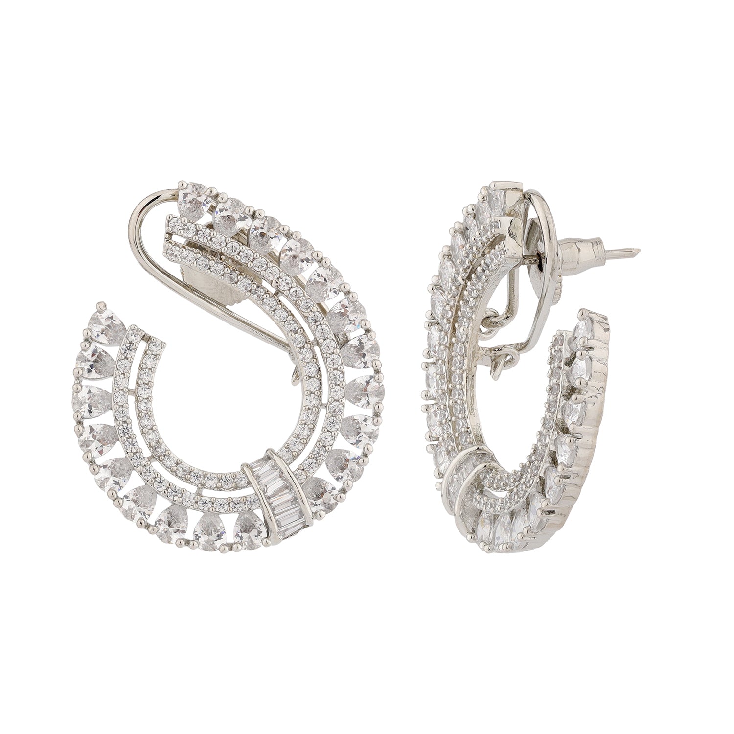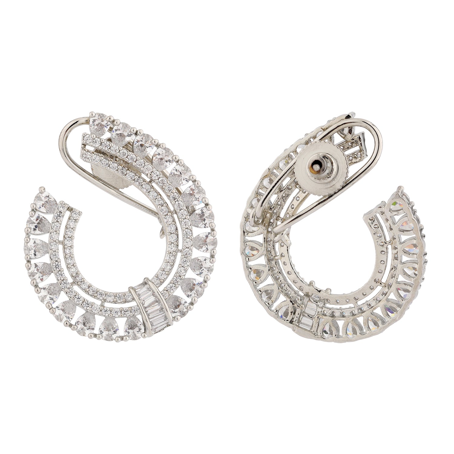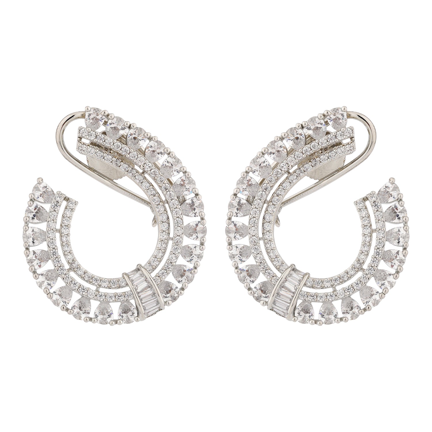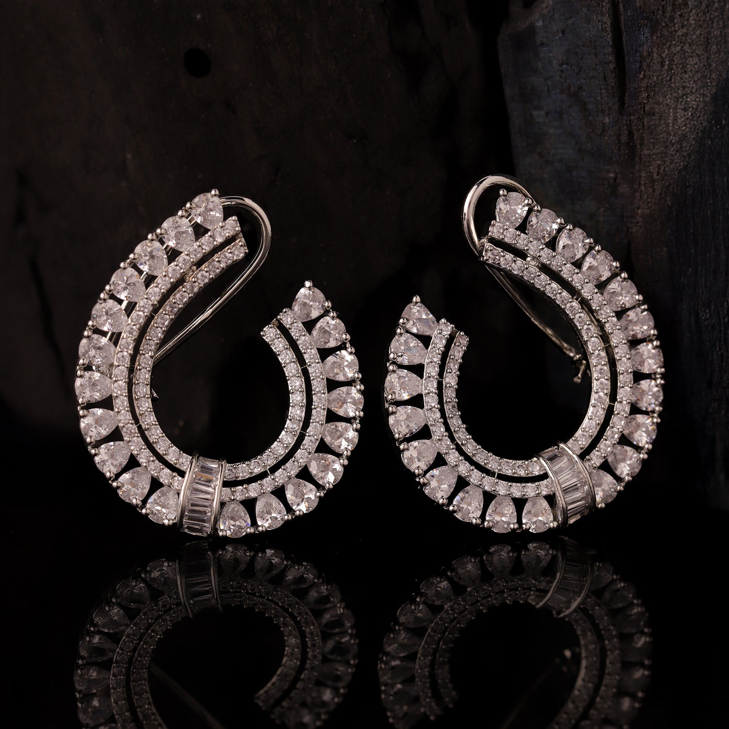 Shine with sophistication and timeless beauty with the Sparkling Elegance Collection’s Radiant Loop Earrings, a luxurious pair of dangler earrings for women that blend modern artistry with classic allure. Expertly crafted from premium brass and plated in elegant white rhodium, these cz earrings for women feature a captivating crescent-inspired loop design encrusted with brilliant American diamonds. The dazzling arrangement of stones enhances their sparkle, making them perfect silver earrings for both festive and formal occasions. Designed to make a statement, these stylish earrings exude luxury and grace, ideal as a designer earring choice for weddings, parties, and cocktail events. Whether you wear them for yourself or choose them as a thoughtful gift for wife, gift for girlfriend, or gift for women, the Radiant Loop Earrings are a symbol of elegance, confidence, and radiant charm.