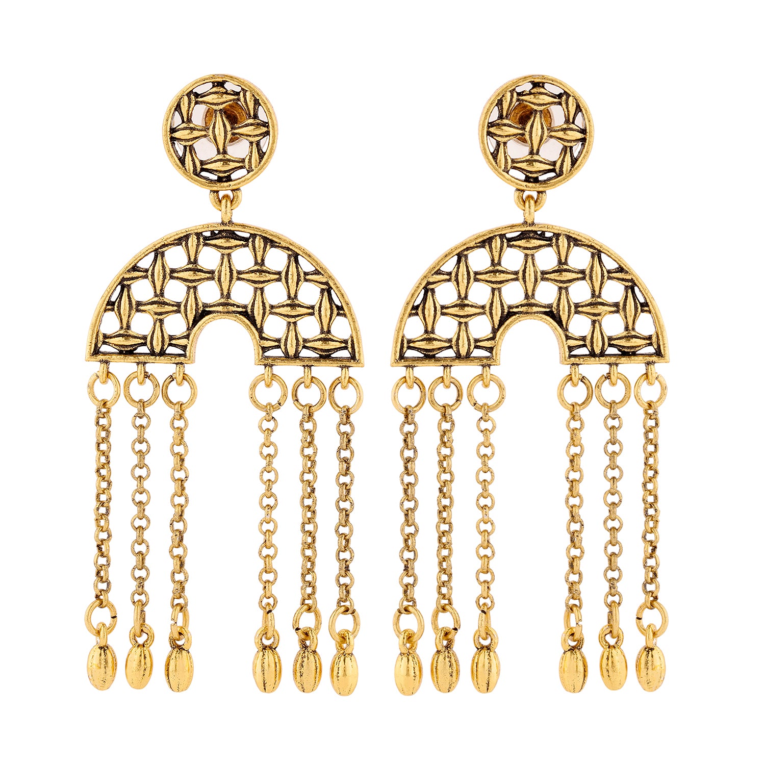 Introducing the Woven Wonder Wavy Weaved Dangler Earrings, a stunning addition to your jewelry collection. Crafted from high-quality brass and plated with gold oxidized finish, these earrings feature an intricate design inspired by the art of basket weaving. The semi-circular top showcases a beautiful pattern of interwoven metal strands, while delicate chains dangle gracefully, adding a touch of boho-chic elegance. Perfect for everyday wear, vacation, or special occasions like Diwali, Rakshabandhan, and Valentine's Day, these statement earrings are versatile enough to complement both casual and office attire. They make an excellent gift for women, whether it's for a sister, girlfriend, wife, mother, or friend. Elevate your style with these exquisite earrings that blend traditional craftsmanship with modern sophistication.