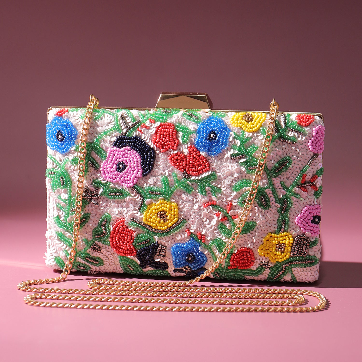 Bright, bold, and utterly breathtaking,the Bloom Radiance Beaded Clutch with Sling Chain is a celebration of artistry and joy. Part of our Trendy Bags Collection, this handcrafted clutch embodies the spirit of festivity through its stunning floral beadwork, radiant colors, and timeless charm. Meticulously designed using premium fabric and fine bead embellishments, this clutch showcases a garden of blooming flowers brought to life with colorful hand-sewn beads and sequins. Every stitch tells a story of craftsmanship, from the vivid red, pink, blue, and yellow blossoms to the fresh green foliage, all set against a soft ivory background that makes the colors pop beautifully. The sleek rectangular silhouette, paired with a gold-tone sling chain, adds a touch of sophistication to its playful vibrance. Whether you wear it crossbody or carry it as a handheld clutch, it instantly elevates any outfit. Spacious enough to hold your phone, essentials, and beauty must-haves, it’s perfect for weddings, festive evenings, parties, or brunch dates. With its artistic detailing and joyful palette, the Bloom Radiance Beaded Clutch isn’t just an accessory, it’s an experience. It’s also a thoughtful gift for women who appreciate color, craftsmanship, and conscious fashion.