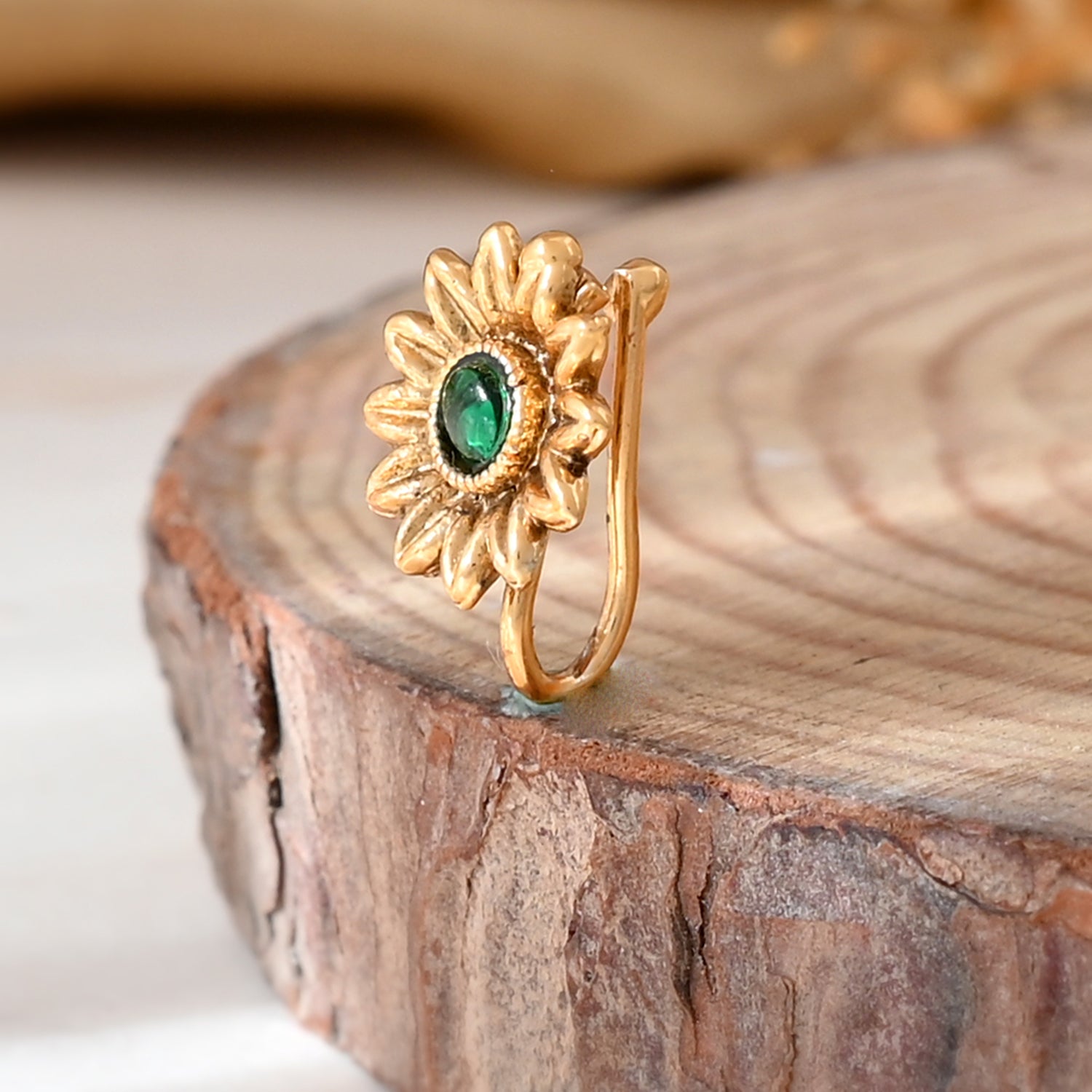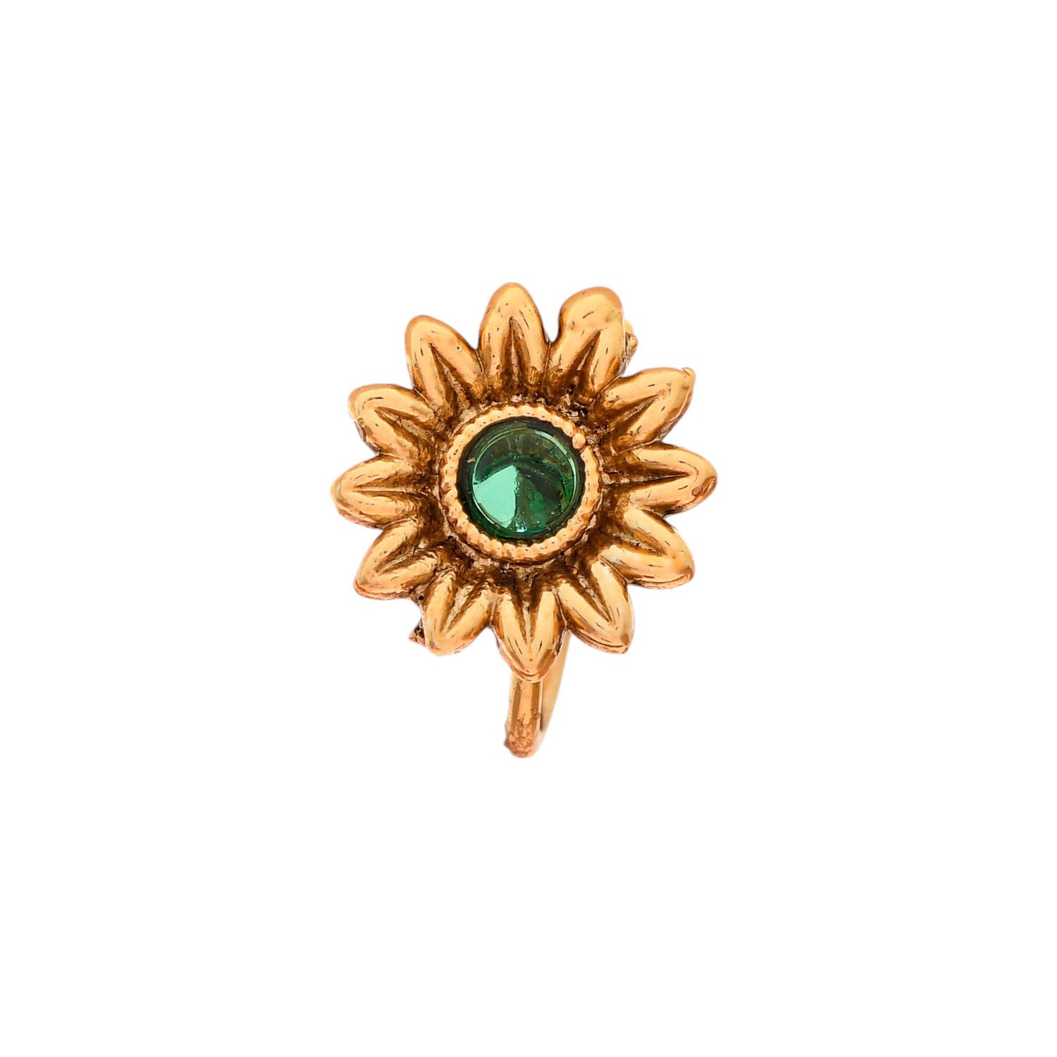 Elevate your elegance with the Sunflower Radiance Gold-Plated Brass Nose Pin by Voylla. This exquisite piece is meticulously crafted from high-quality brass and adorned with a lustrous gold plating, ensuring a timeless shine. The nose pin features a beautifully detailed sunflower design, with petals that radiate outwards, capturing the essence of nature's beauty. At the heart of the sunflower lies a captivating green stone, adding a touch of sophistication and charm. Perfect for festive occasions, weddings, parties, and special celebrations like Holi, Diwali, Rakshabandhan, and Christmas, this nose pin makes an ideal gift for women, whether it's for a sister, girlfriend, wife, mother, or a dear friend. Celebrate love and elegance with this stunning piece, a perfect addition to any jewelry collection.