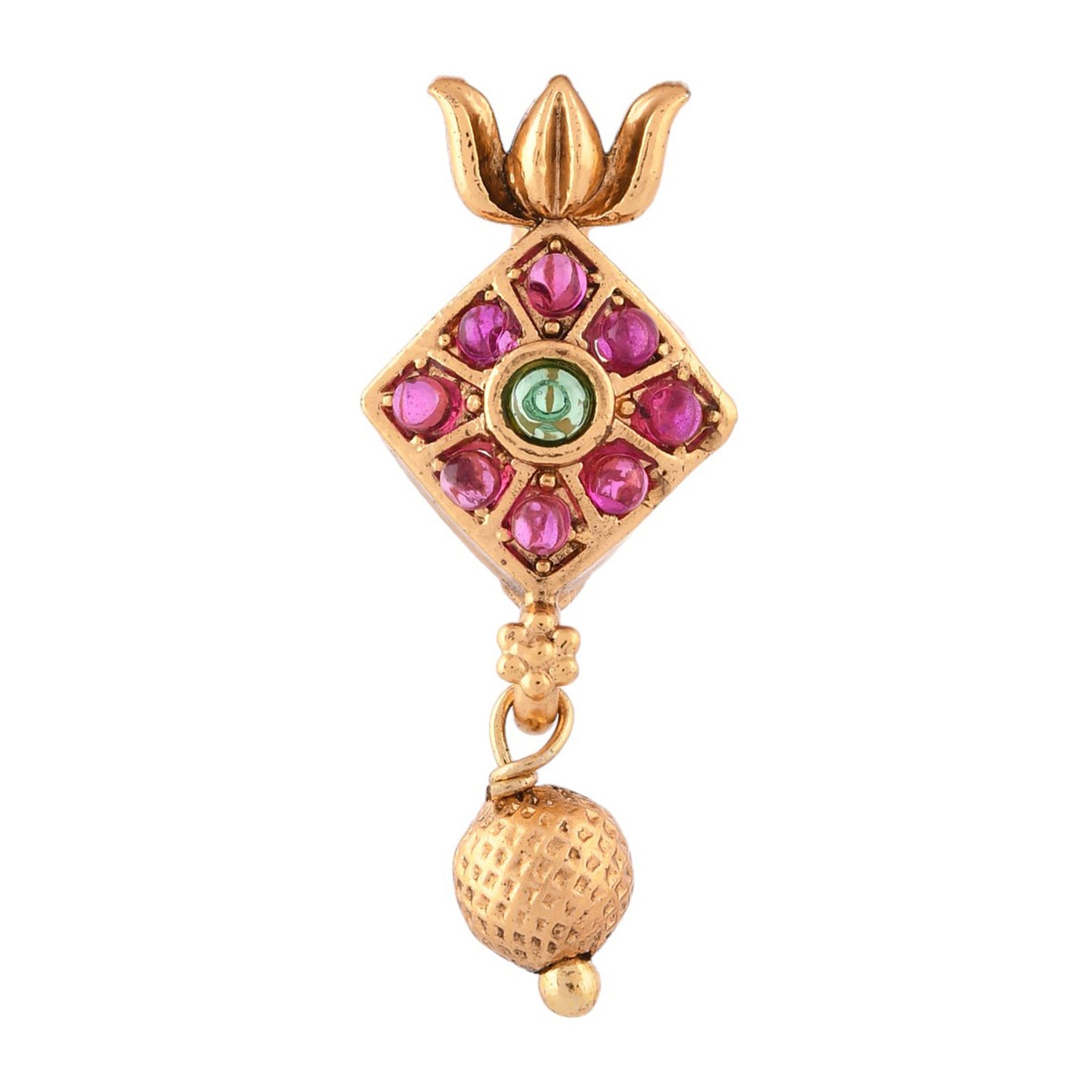 Crafted with precision and passion, this piece seamlessly blends tradition and modernity, making it a must-have accessory for festive occasions and weddings.The intricate design of this Nose Pin is a testament to the artisan’s skill. A square motif takes center stage, adorned with radiant pink stones that form a symmetrical pattern around a captivating green stone. The arrangement exudes elegance and sophistication, capturing the essence of celebration. Above the square, delicate gold petals unfurl, adding a touch of whimsy and grace. The color palette is rich and vibrant, reflecting the joyous spirit of Diwali, Rakshabandhan, and other festivities.Wear it during Pooja ceremonies, Rakhi celebrations, or Diwali festivities—the choice is yours.