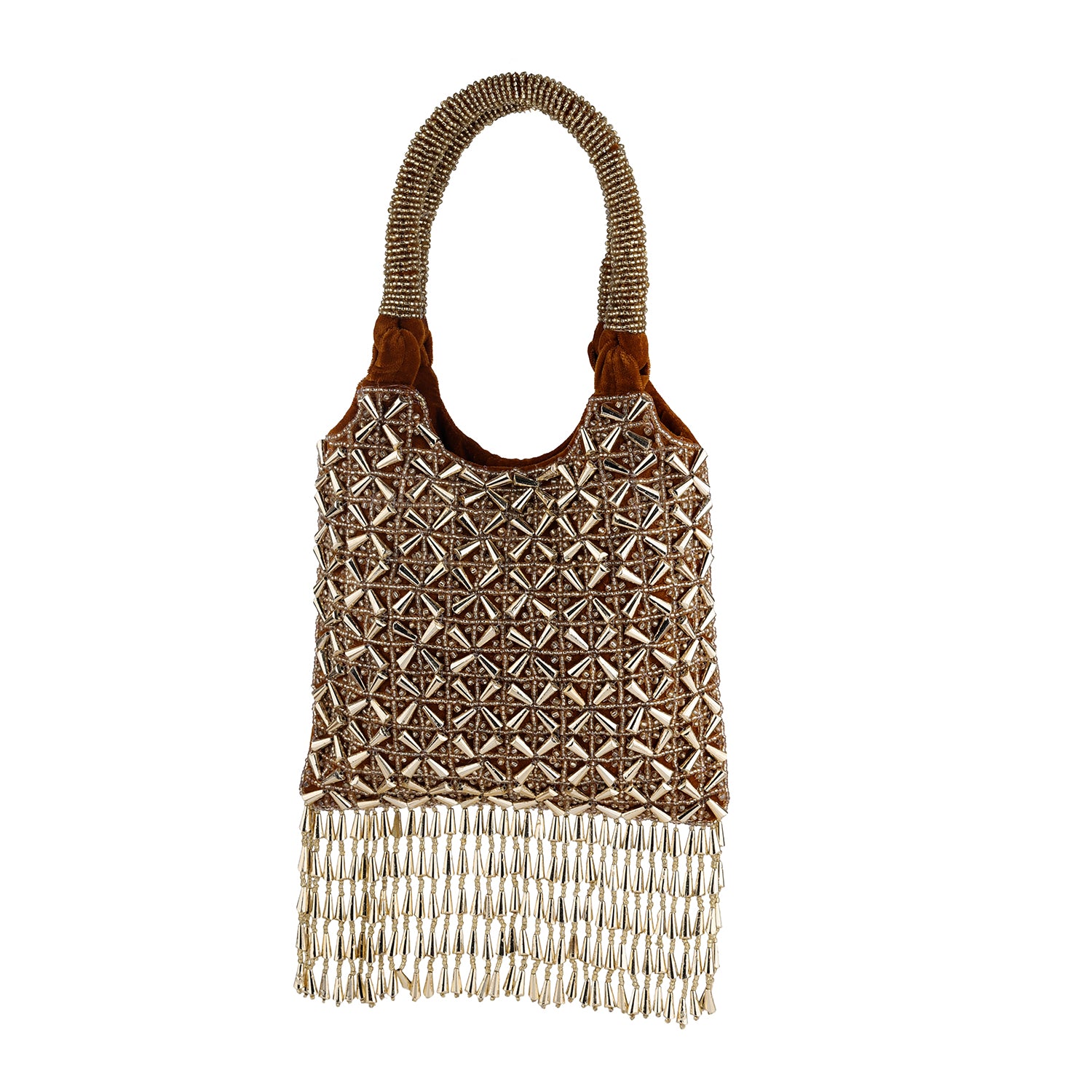 Turn every moment into a glamorous occasion with the Golden Dusk Beaded Handbag, an exquisite piece from our Trendy Bags Collection. Handcrafted with luxurious fabric and intricate bead detailing, this statement handbag beautifully captures the essence of festive fashion - elegant, radiant, and timeless. The bag features a rich golden-brown velvet base adorned with meticulously hand-sewn beads arranged in striking geometric patterns. The lower half shimmers with glittering golden tassels, adding a rhythmic sway and touch of vintage opulence to your ensemble. Complemented by beaded handles, it’s a piece that’s as functional as it is beautiful. Designed to hold your essentials with ease, this beaded handbag pairs perfectly with both traditional and contemporary outfits. Whether you’re attending a wedding, festive party, or evening celebration, it adds a sophisticated sparkle to your look. This handbag also makes for an unforgettable gift for her, ideal for someone who loves artisanal craftsmanship, intricate design, and statement-making accessories.