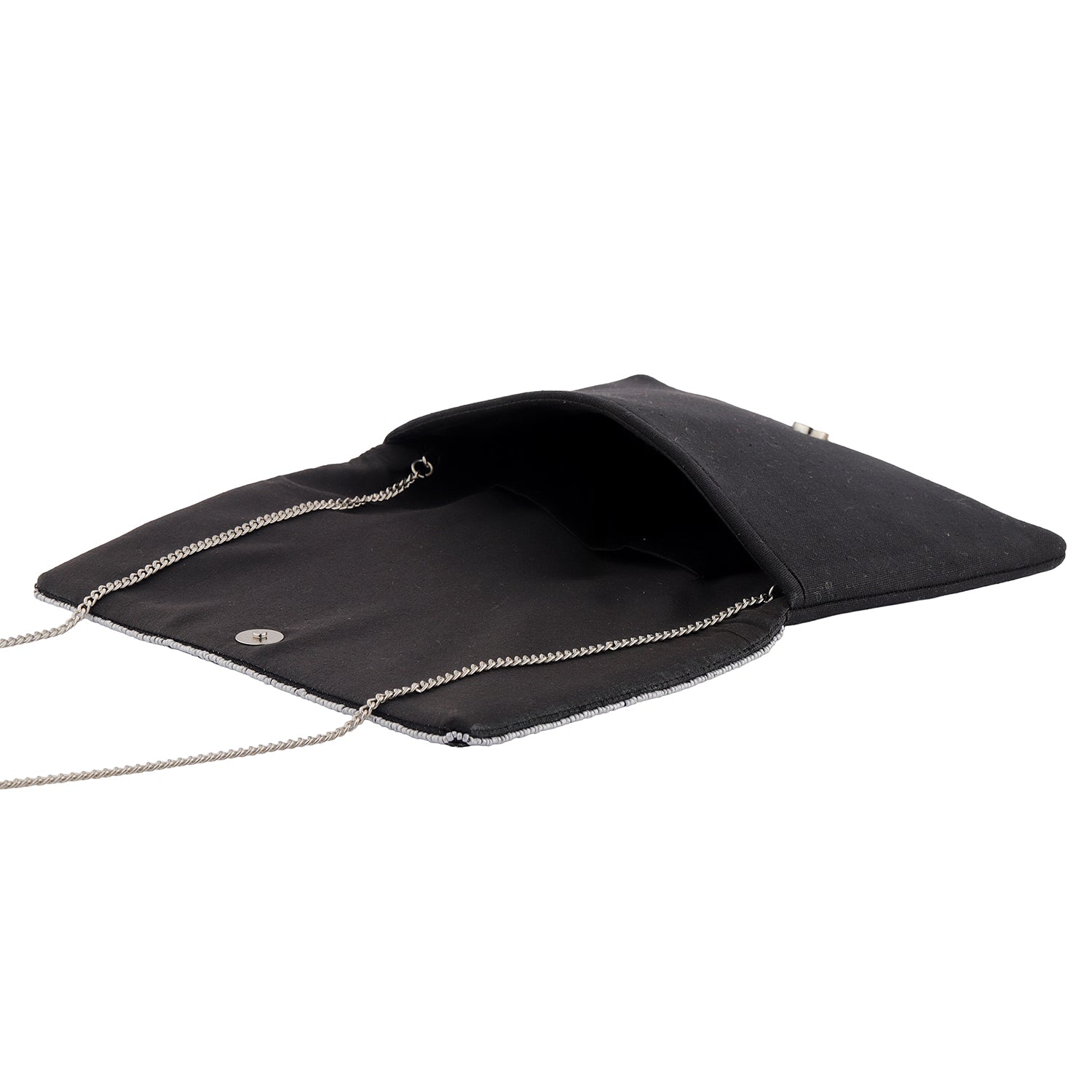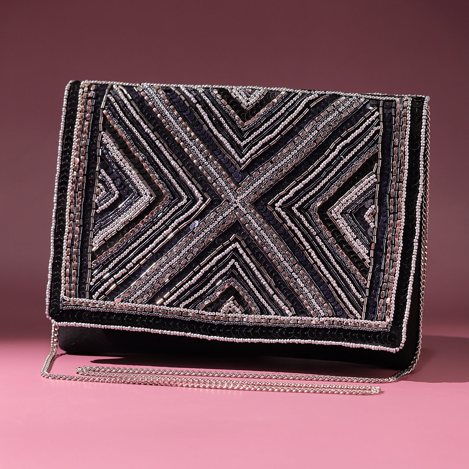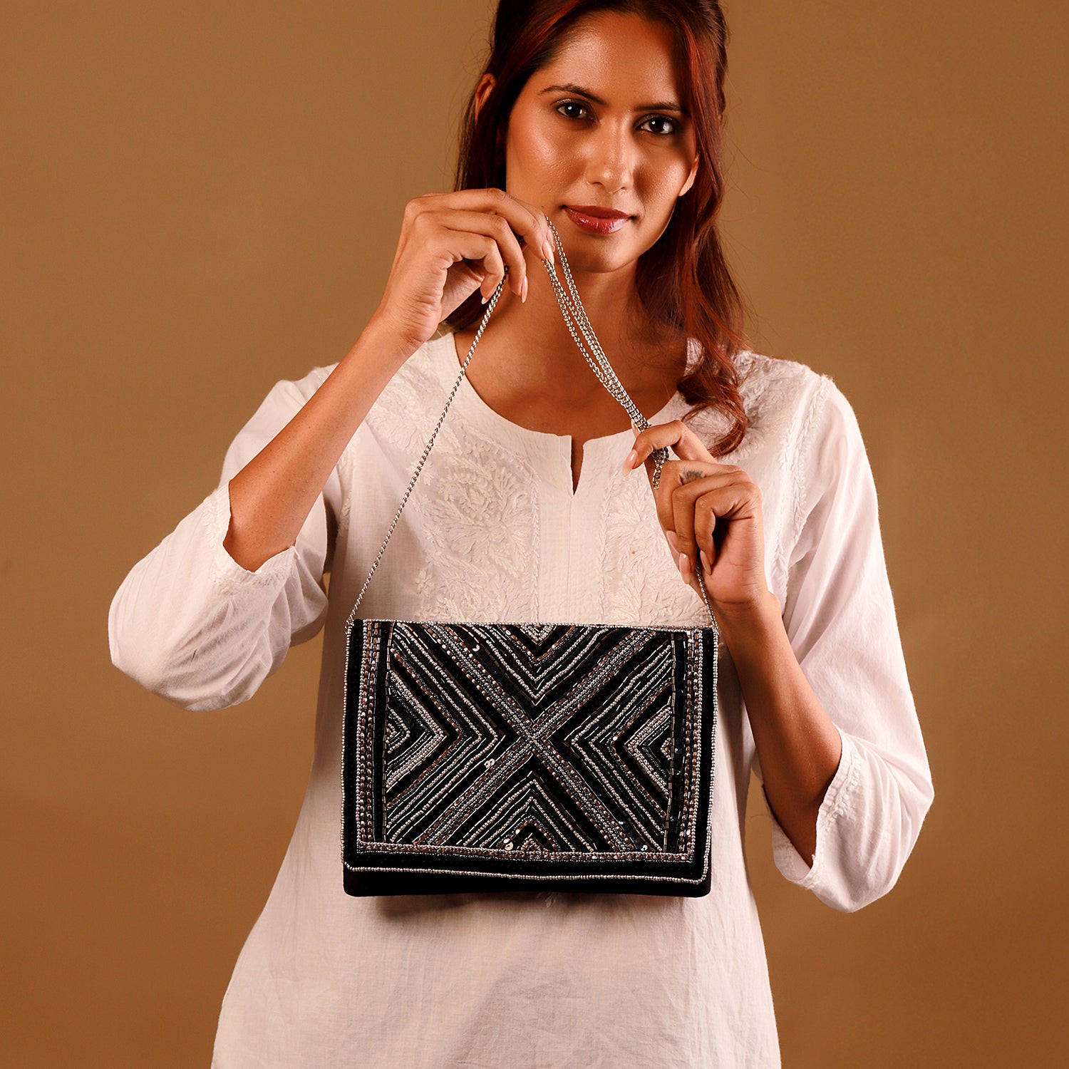 Step into timeless sophistication with the Midnight Luxe Beaded Clutch with Sling Chain, an exquisite statement piece from our Trendy Bags Collection. Designed for the modern woman who adores understated glamour, this handcrafted clutch perfectly balances classic charm with contemporary style. Meticulously made from premium fabric and adorned with intricate hand-beaded patterns, the clutch features a striking geometric design that glistens subtly with every movement. The elegant interplay of black, silver, and gunmetal beads gives it a rich, opulent finish, making it your go-to accessory for evening parties, weddings, or festive occasions. The silver sling chain adds versatility, allowing you to carry it effortlessly as a crossbody bag or hold it as a clutch for a polished, evening-ready look. Compact yet roomy enough for your essentials like phone, cards, lipstick, this clutch with sling chain combines beauty, function, and impeccable craftsmanship. Whether it’s for a night out, a formal event, or a thoughtful gift for her, the Midnight Luxe Beaded Clutch exudes elegance and artistry in every detail.