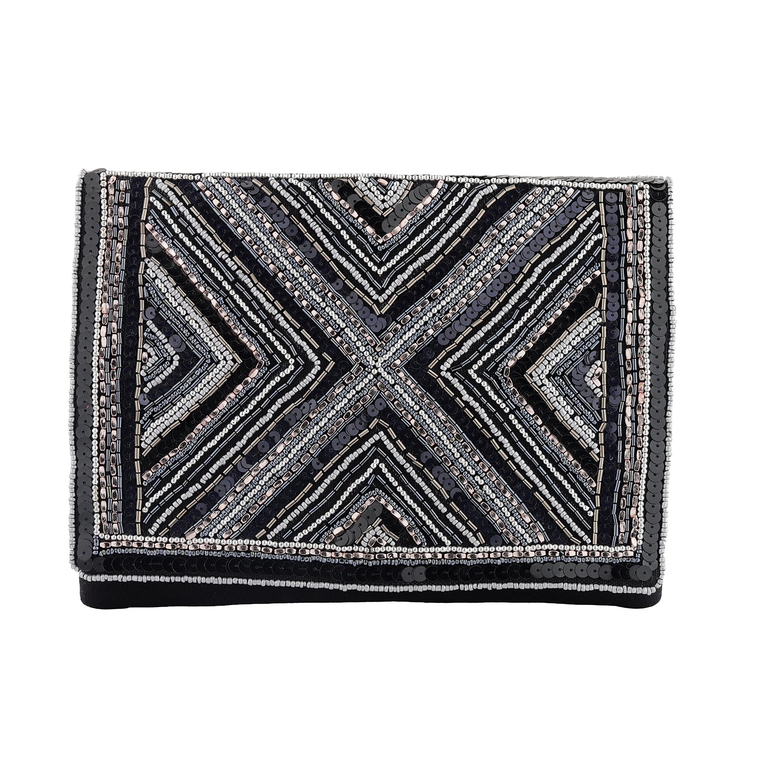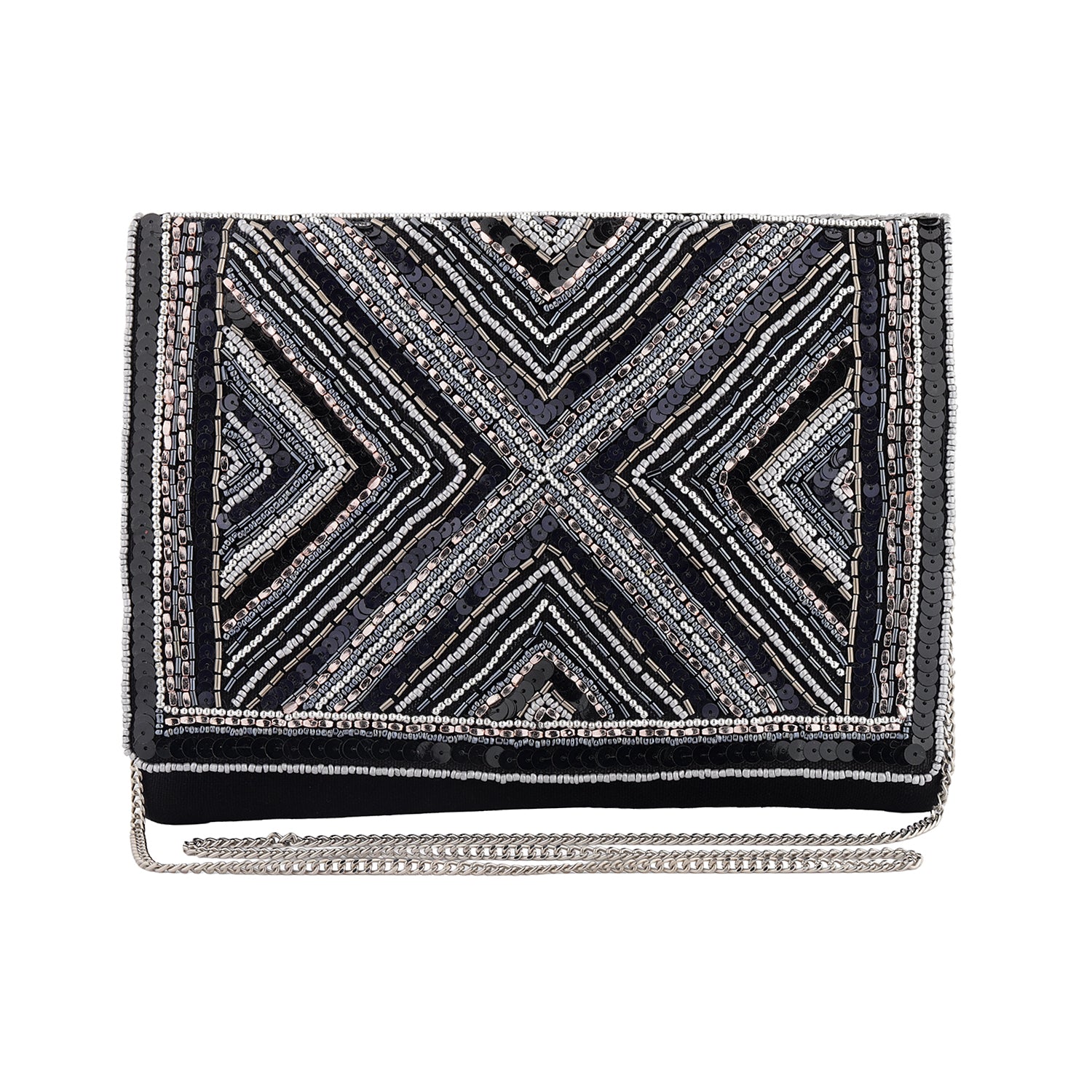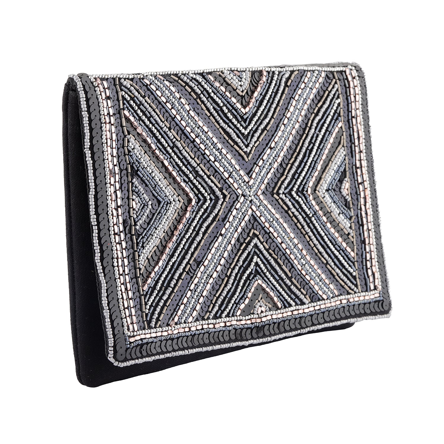 Step into timeless sophistication with the Midnight Luxe Beaded Clutch with Sling Chain, an exquisite statement piece from our Trendy Bags Collection. Designed for the modern woman who adores understated glamour, this handcrafted clutch perfectly balances classic charm with contemporary style. Meticulously made from premium fabric and adorned with intricate hand-beaded patterns, the clutch features a striking geometric design that glistens subtly with every movement. The elegant interplay of black, silver, and gunmetal beads gives it a rich, opulent finish, making it your go-to accessory for evening parties, weddings, or festive occasions. The silver sling chain adds versatility, allowing you to carry it effortlessly as a crossbody bag or hold it as a clutch for a polished, evening-ready look. Compact yet roomy enough for your essentials like phone, cards, lipstick, this clutch with sling chain combines beauty, function, and impeccable craftsmanship. Whether it’s for a night out, a formal event, or a thoughtful gift for her, the Midnight Luxe Beaded Clutch exudes elegance and artistry in every detail.
