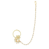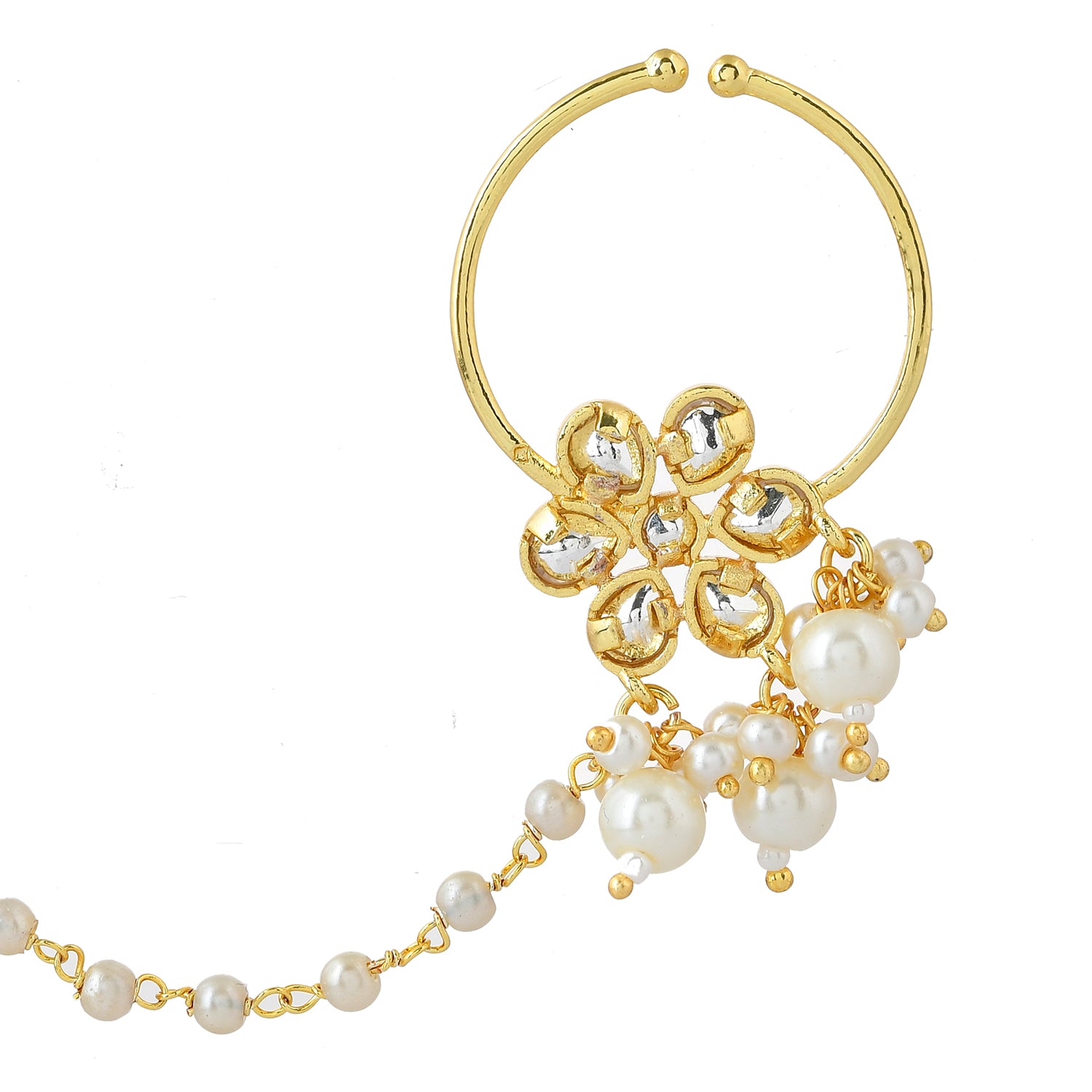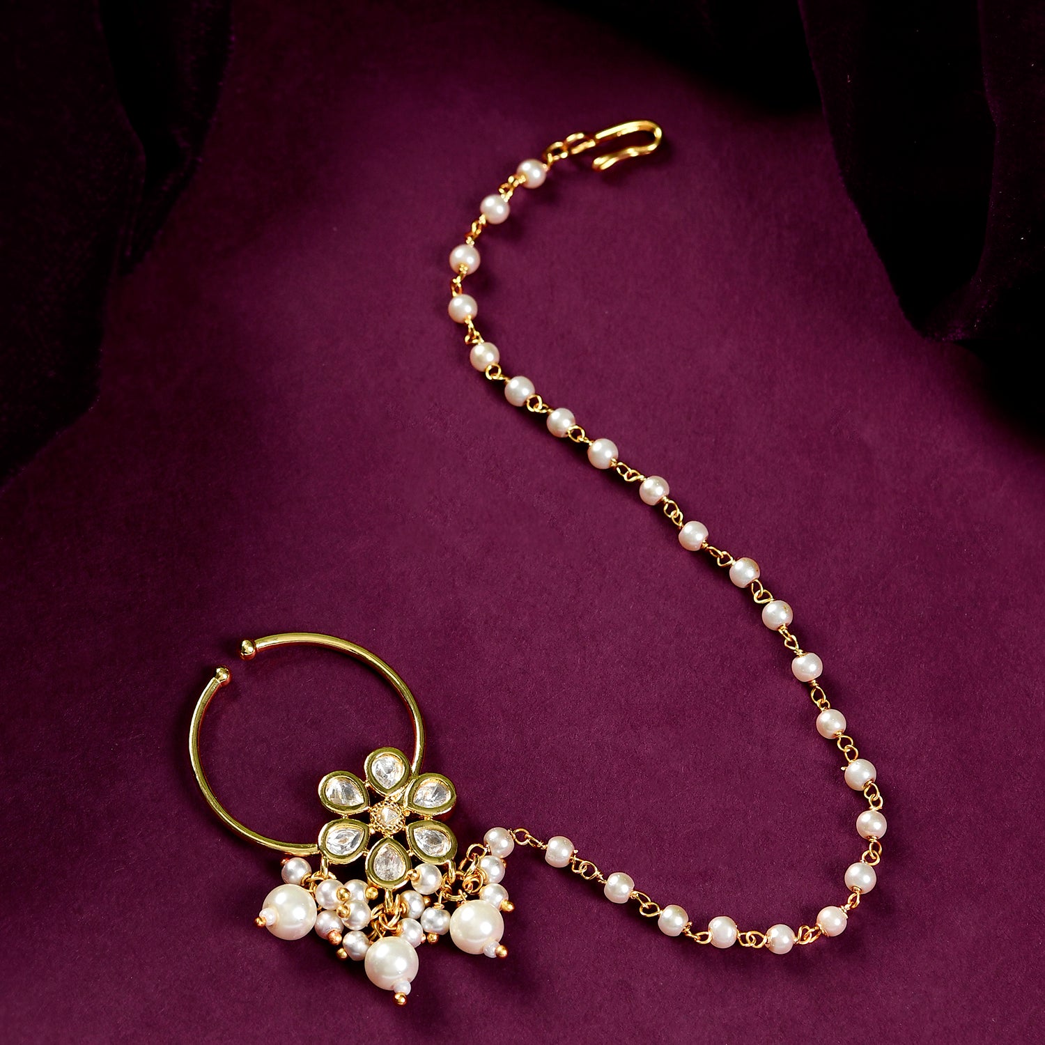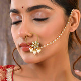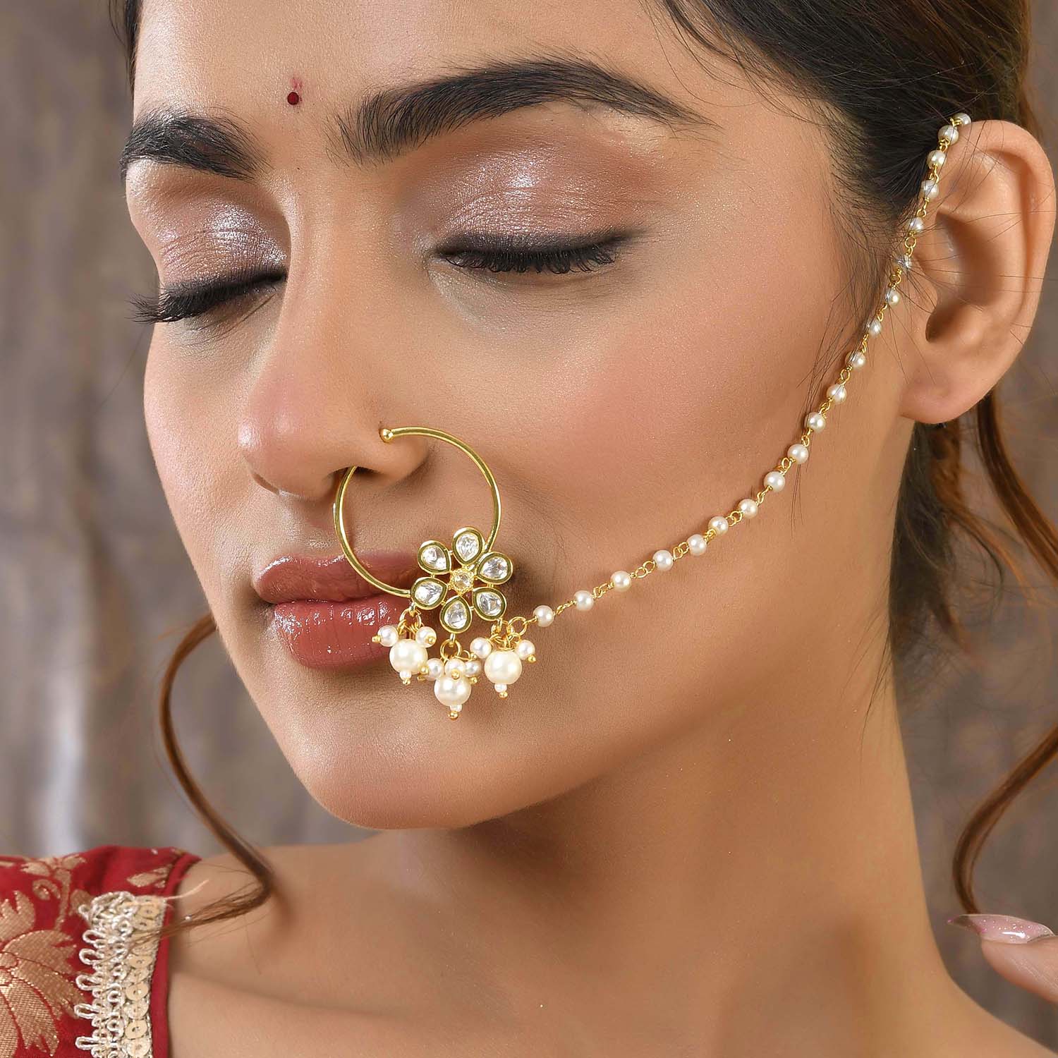 The Voylla Kashni Nose Ring from the Panchhi collection is a breathtaking blend of timeless elegance and intricate craftsmanship. Made from high-quality brass and adorned with luxurious gold plating, this piece showcases a delicate floral design embellished with sparkling American Diamond Kundan stones. The attention to detail is remarkable, with each element meticulously crafted to create a stunning visual appeal. Ideal for festive occasions, weddings, and parties, this nose ring is a versatile accessory that can be styled with both traditional and contemporary outfits. Whether you're looking for a thoughtful gift for a loved one or a stunning piece to add to your own jewelry collection, the Voylla Kashni Nose Ring is a perfect choice. Its harmonious design makes it suitable for occasions like Valentine's Day, Diwali, Rakshabandhan, Christmas, and New Year, making it a cherished gift for sisters, girlfriends, wives, mothers, or lovers. Inspired by nature's most majestic birds, the Panchhi collection captures the essence of love, grace, and the sacred union of two souls, making each piece a must-have for every bride's trousseau.