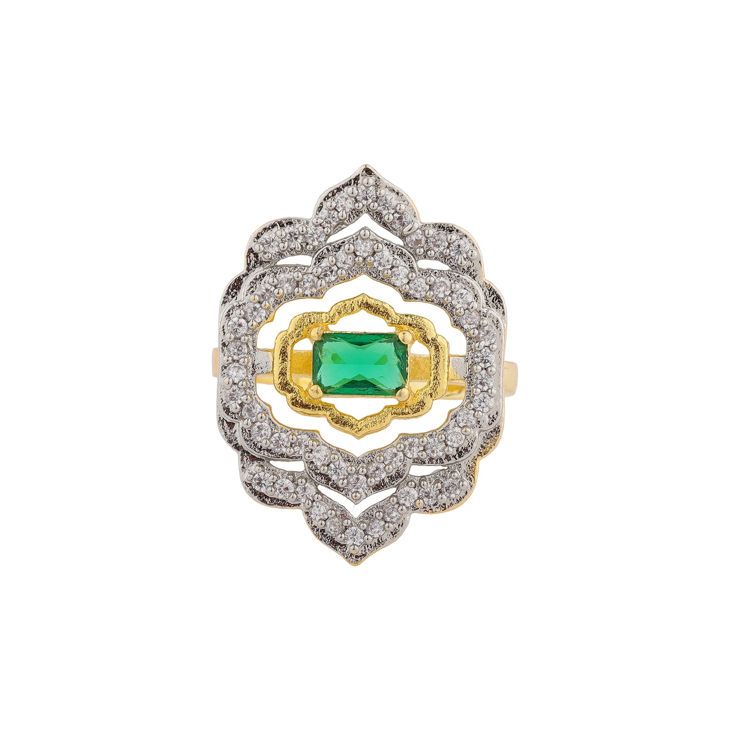 The Shahi Dwar Ragini Gemstone Ring is an exquisite fusion of royal artistry and timeless sophistication. Inspired by the grand palace arches of Jaipur, this design reflects the architectural beauty and intricate craftsmanship that defined royal India. The ring captures the regal essence of the Shahi Dwar Collection, where tradition and modern elegance meet in perfect harmony. Expertly handcrafted in fine brass with a luminous yellow gold plating, the Ragini Gemstone Ring features an ornate, multi-layered arch design symbolizing the majestic gates of ancient palaces. The centerpiece, a vivid green gemstone embodies prosperity and vitality, while a double halo of sparkling CZ American diamonds adds radiant brilliance and depth. Each curve and contour of the ring mimics architectural precision, turning this piece into a wearable heirloom. Bold yet elegant, the Ragini Ring is perfect for women who love jewelry that tells a story, one of power, grace, and timeless allure. Whether worn with a saree, lehenga, or an evening gown, this designer ring transforms any look into one worthy of royalty.