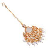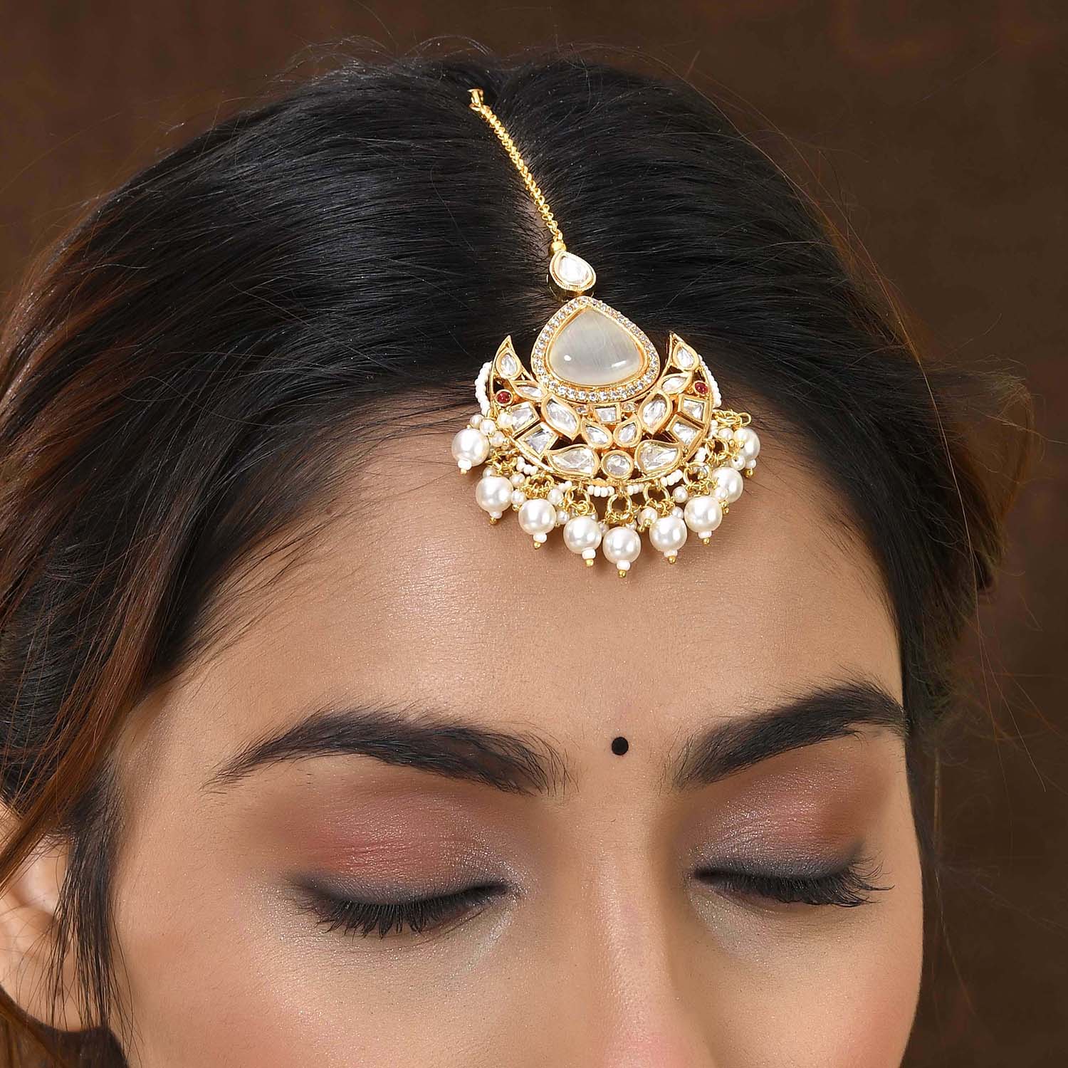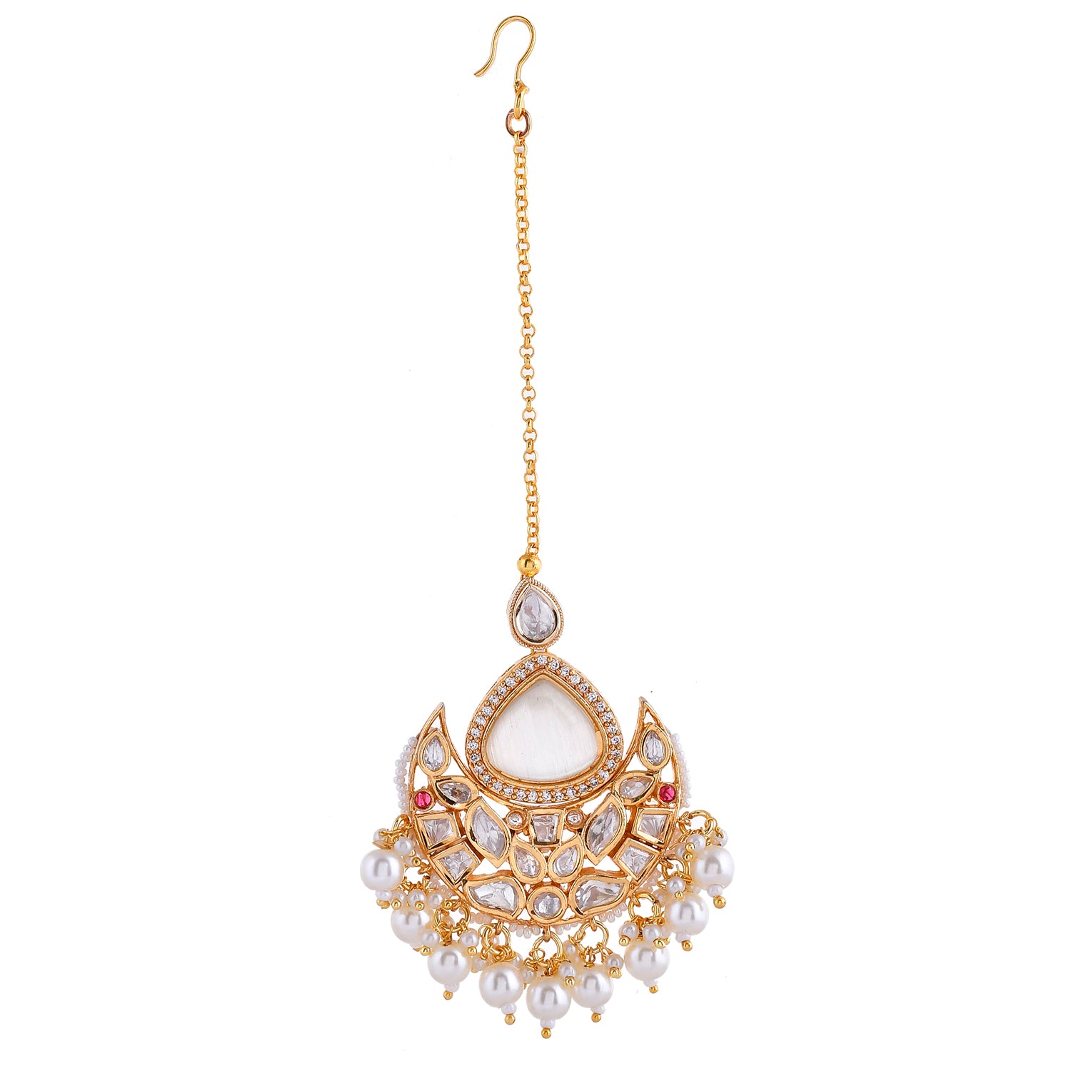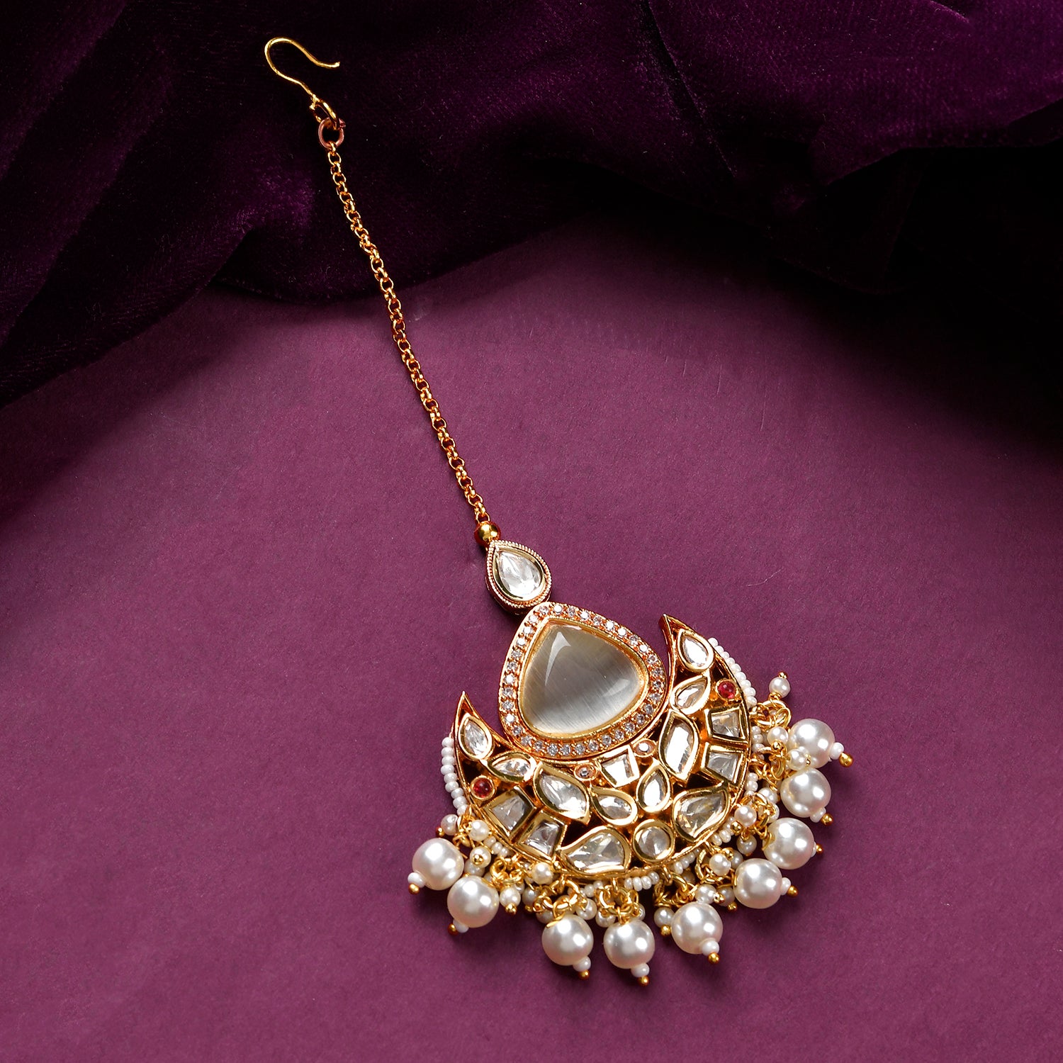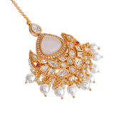 The Maharani Pearl Maang Tika from the Kundan Elegance Collection is a stunning piece of jewelry crafted from high-quality brass with a luxurious gold plating. This exquisite Maang Tika features intricate Kundan Polki work, adorned with shimmering kundan stones and delicate pearls, creating a regal and elegant look. The design showcases a central teardrop-shaped stone surrounded by smaller geometric shapes, all meticulously set to reflect light beautifully. Perfect for weddings, festive occasions, and traditional ceremonies, this statement Maang Tika adds a touch of royalty to any outfit. Its versatile design makes it an ideal accessory for ethnic wear, including sarees, lehengas, and anarkalis. This elegant piece also makes a thoughtful gift for women on special occasions such as Valentine's Day, Diwali, Rakshabandhan, Christmas, and New Year. Whether for a bride, sister, girlfriend, wife, or mother, the Maharani Pearl Maang Tika is a timeless addition to any jewelry collection, embodying grace and sophistication.