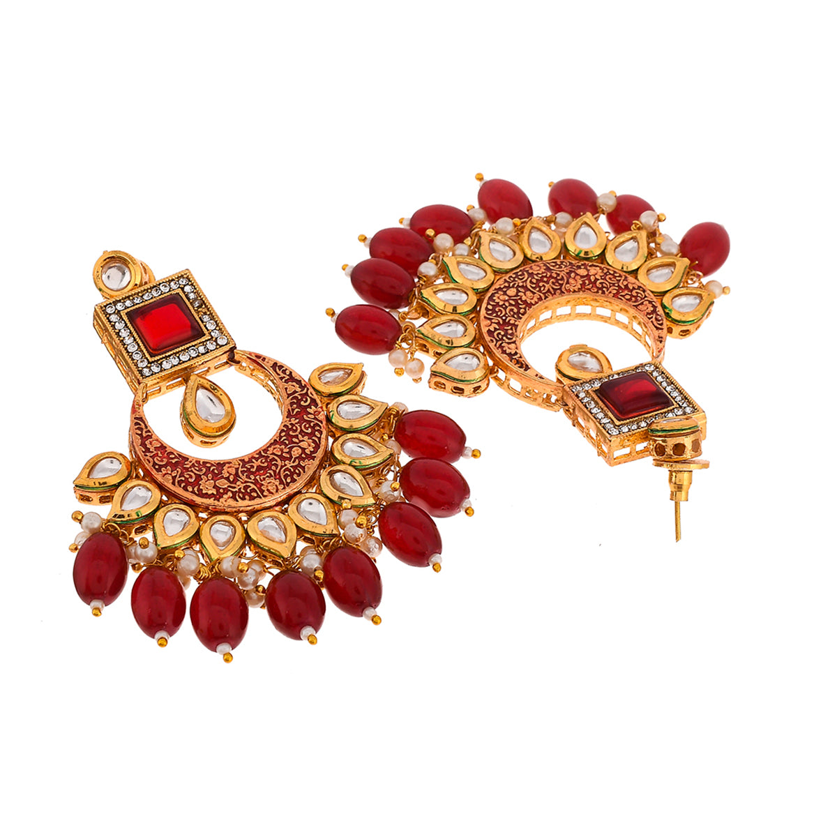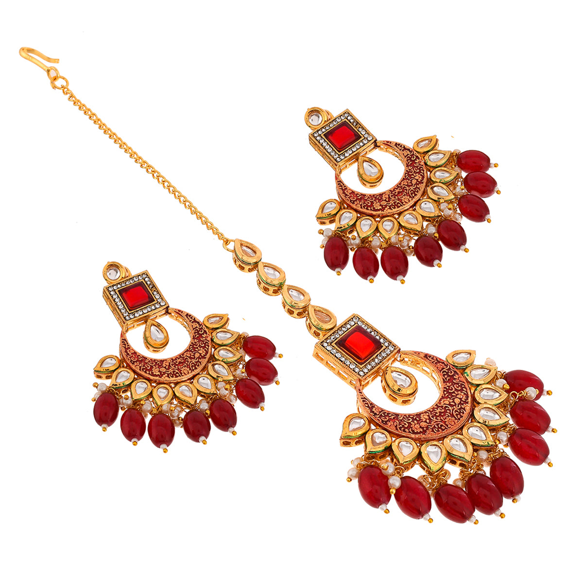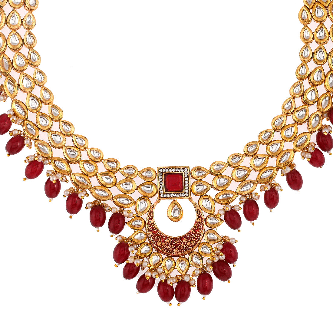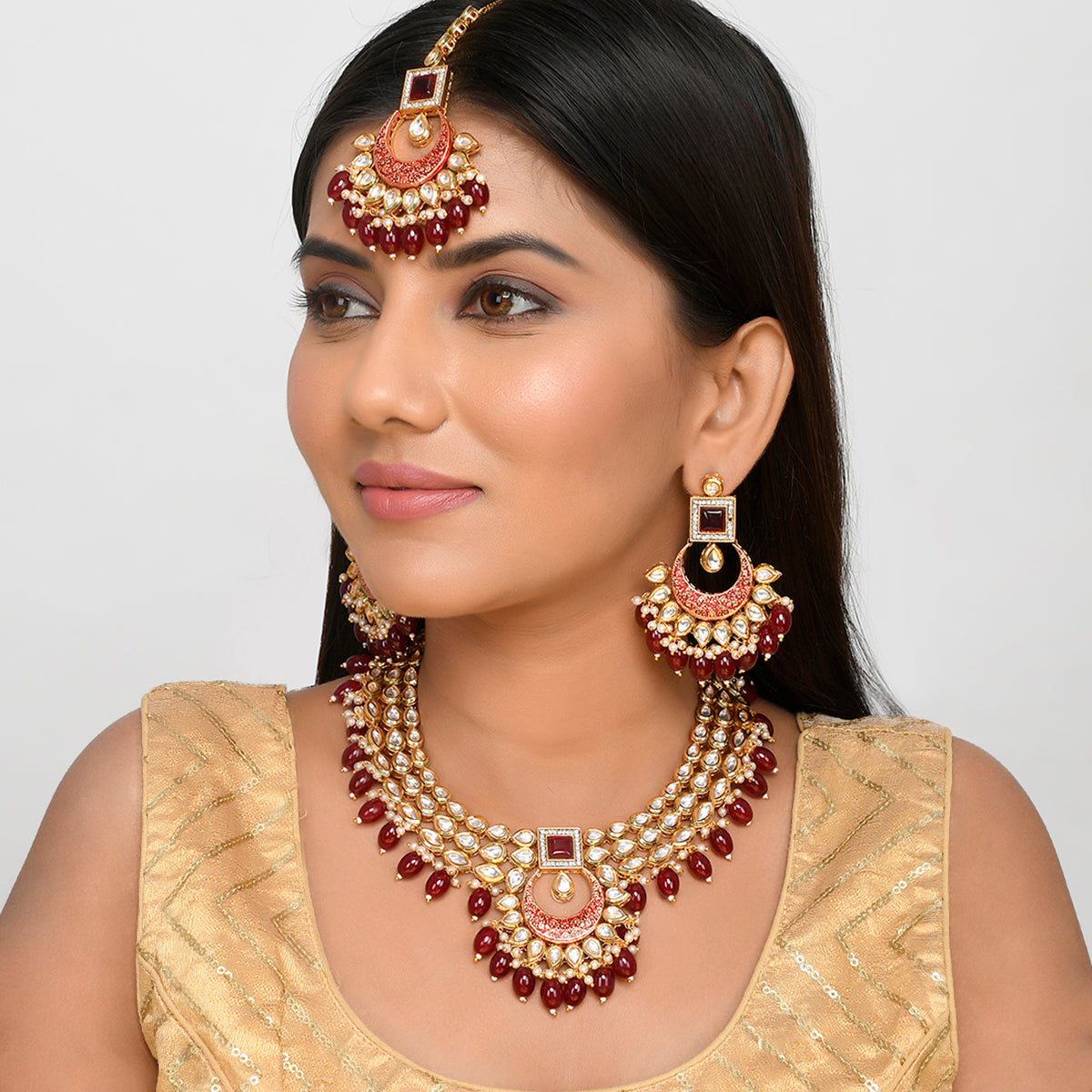 Ethnic jewellery set with kundan gems and red stones. The gold plated set has been fashioned out of brass and can be paired with Indian formal looks of all kinds.