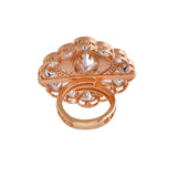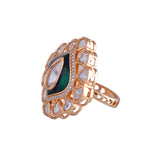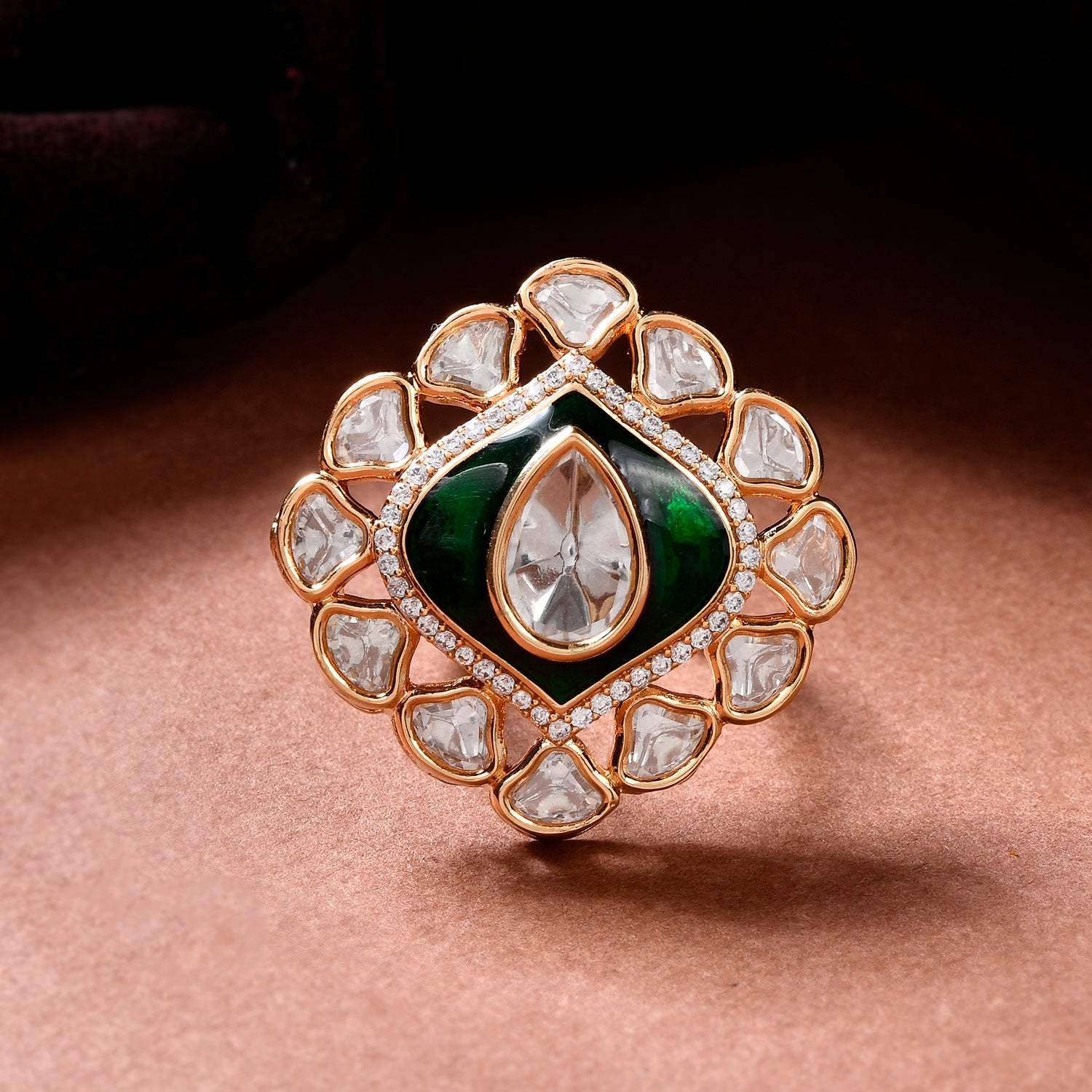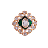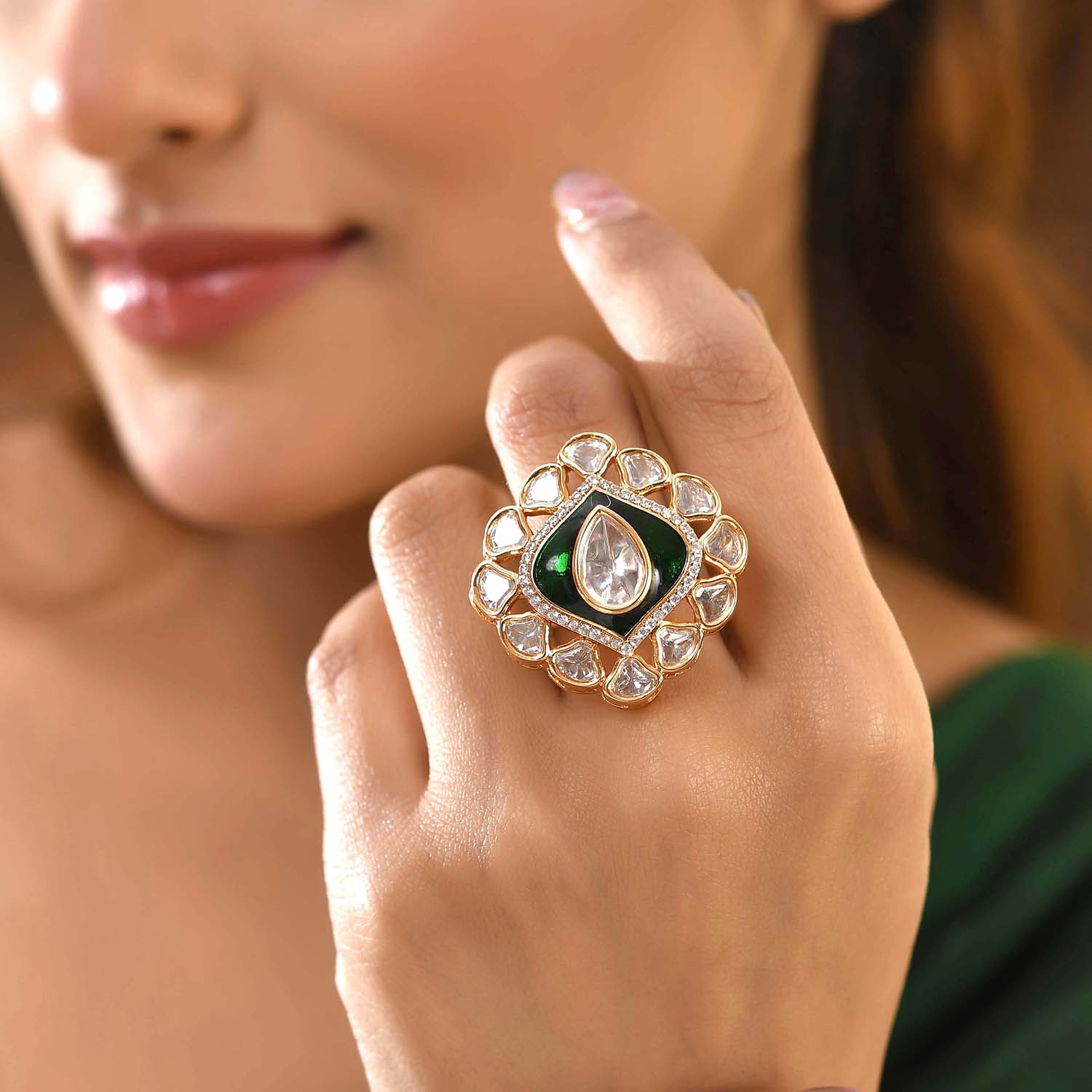 The Kohinoor Glow Ring is a stunning piece of jewelry that epitomizes elegance and grandeur. Crafted from high-quality brass and plated with gold, this exquisite ring features a central teardrop-shaped kundan stone, surrounded by a halo of smaller kundan stones set in a floral pattern. The intricate design and meticulous craftsmanship make it a standout piece in the Kundan Opulence collection. The rich green enamel detailing adds a touch of royalty, making it perfect for festive occasions, weddings, and traditional ceremonies. This statement ring is not only a beautiful accessory but also a thoughtful gift for women on special occasions like Valentine's Day, Diwali, Rakshabandhan, Christmas, and New Year. Pair it with ethnic wear for a regal look or with contemporary outfits for a fusion style. The Kohinoor Glow Ring is a versatile and timeless addition to any jewelry collection, making it an ideal gift for mothers, wives, girlfriends, and sisters.