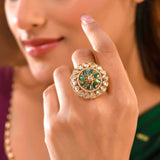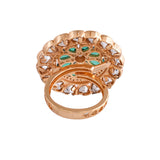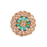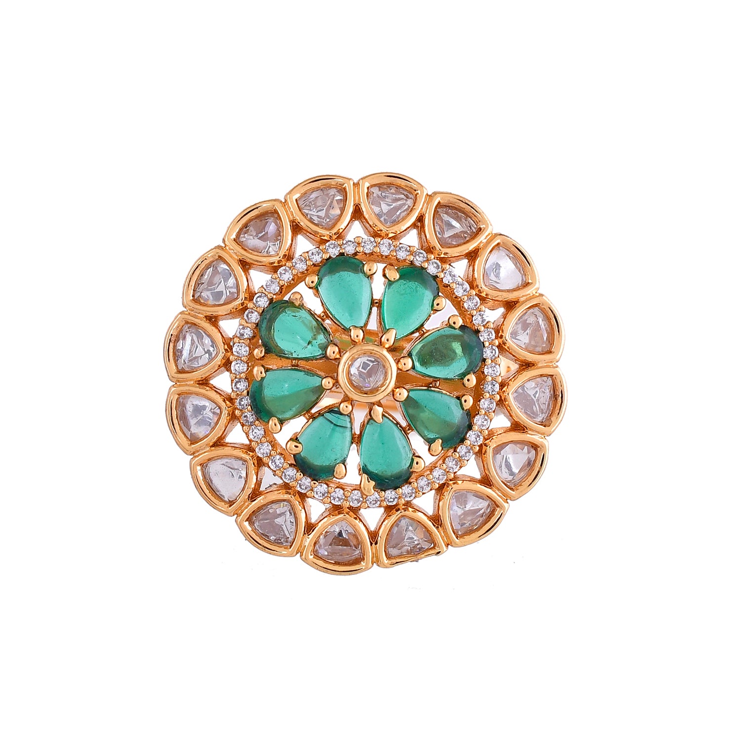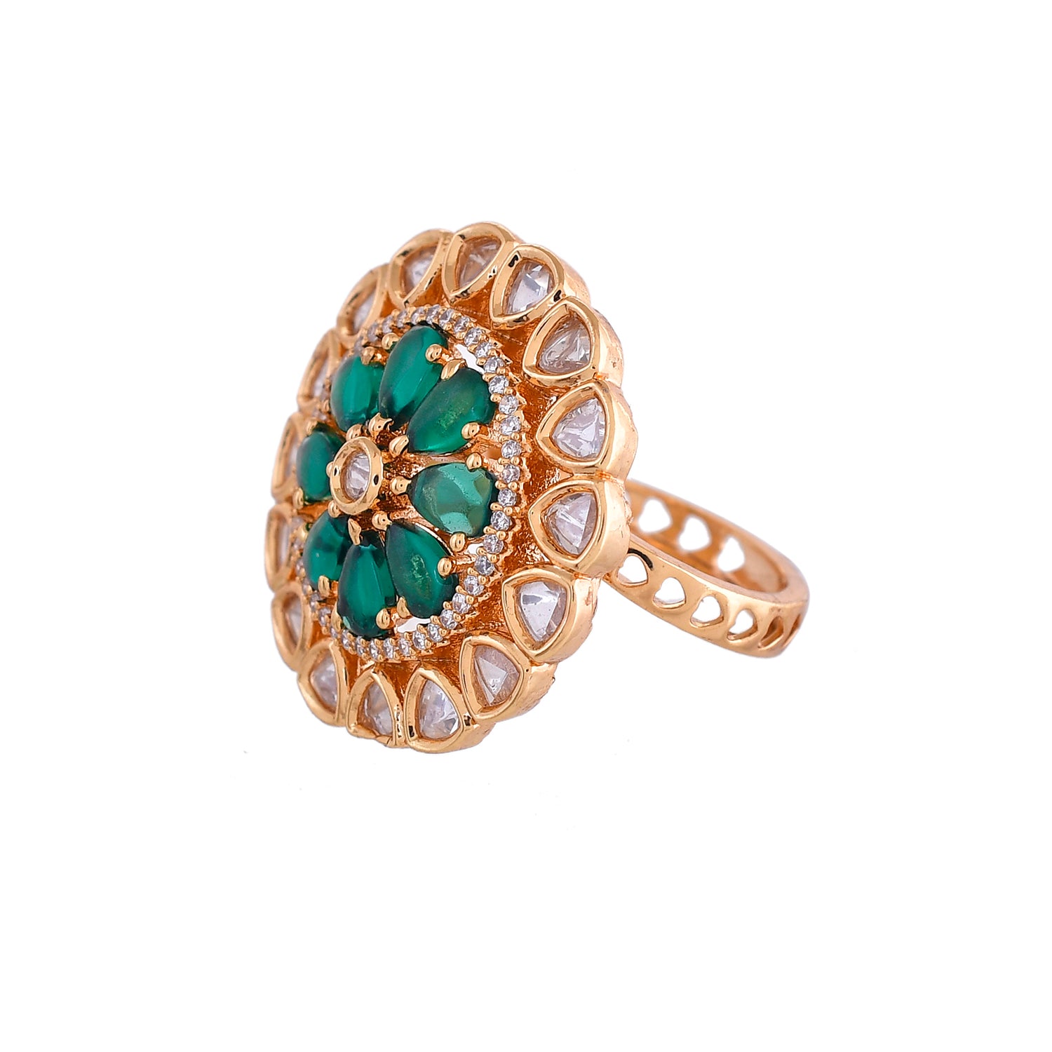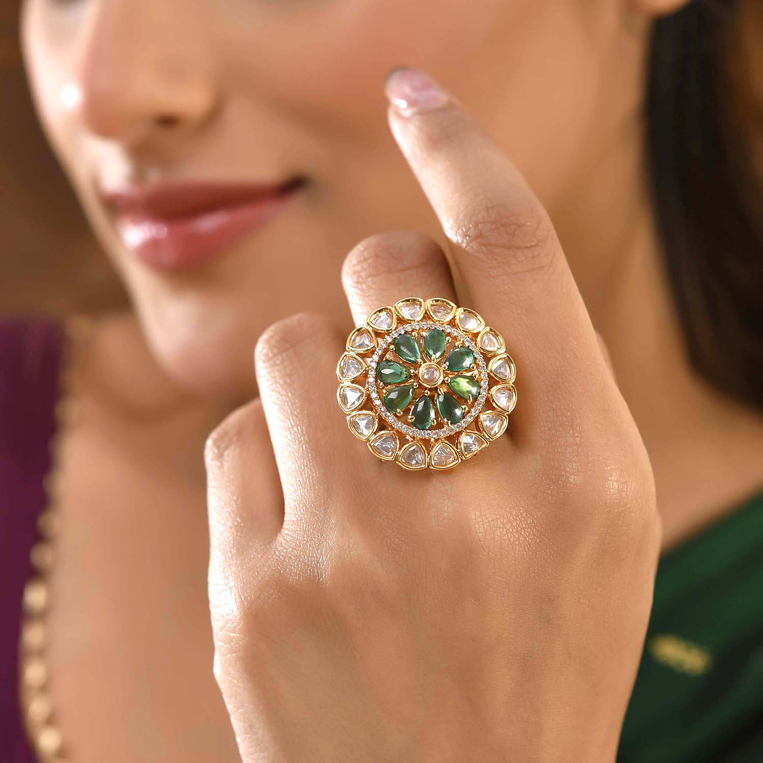 The Majestic Bloom Ring is a stunning piece from the Kundan Opulence collection, meticulously crafted from high-quality brass and plated with luxurious gold. This exquisite ring features a captivating design with a central arrangement of rich green stones, each surrounded by sparkling white stones, creating a floral motif that exudes elegance and sophistication. Perfect for weddings, festive occasions, or as a statement piece, this ring adds a touch of royal charm to any outfit. Its versatile design makes it an ideal gift for women, whether for Valentine's Day, Diwali, Rakshabandhan, or Christmas. Pair it with traditional ethnic wear or modern ensembles to elevate your style effortlessly. This ring is not just a piece of jewelry; it's a symbol of timeless beauty and grace, making it a cherished addition to any jewelry collection.