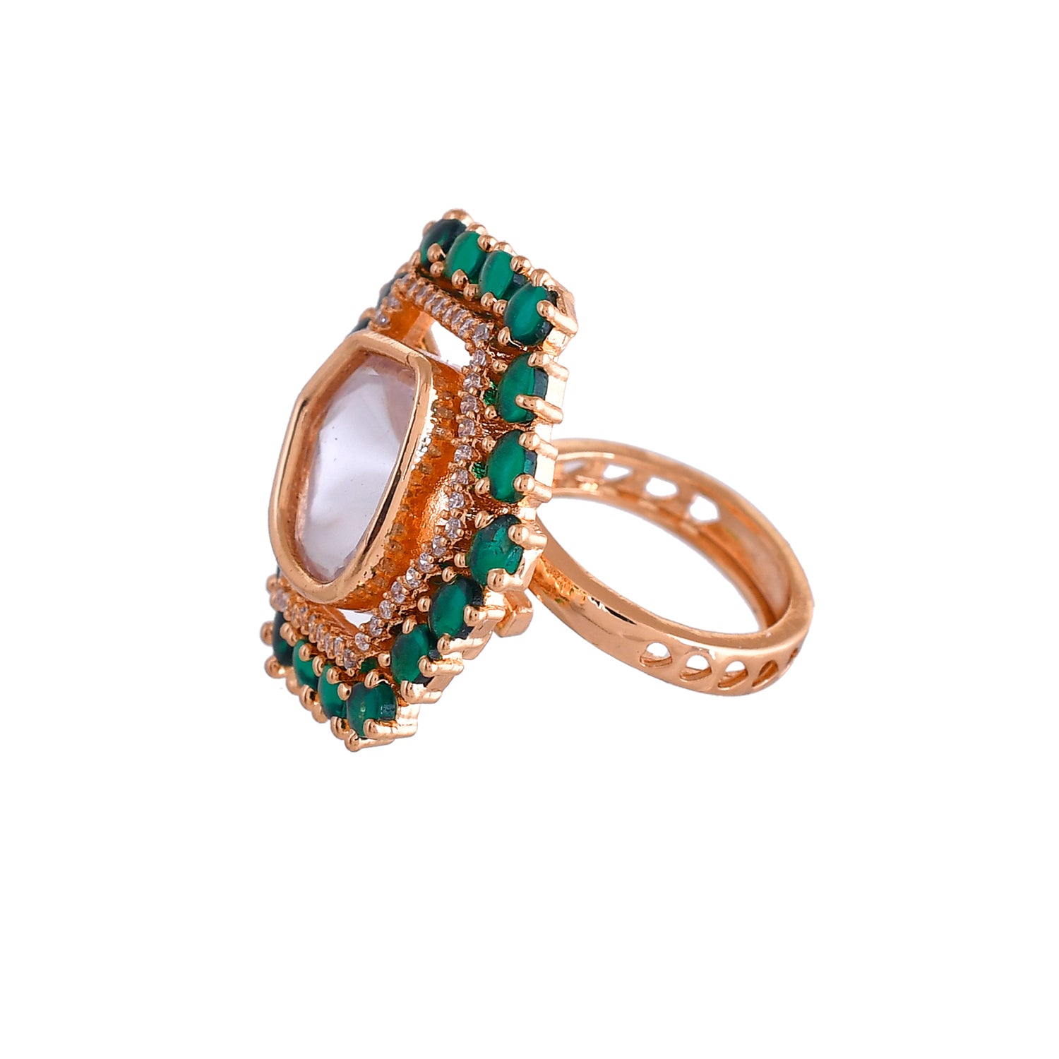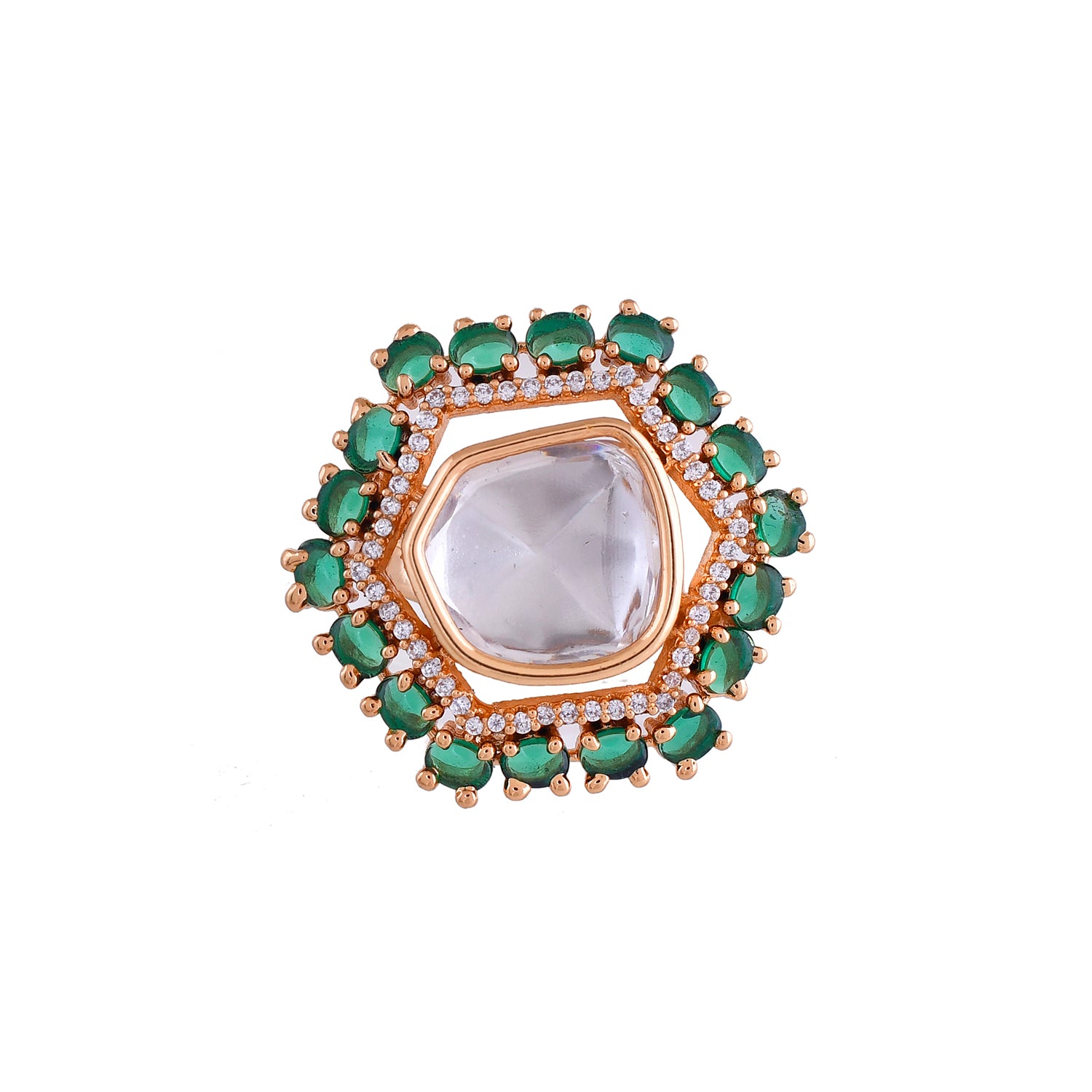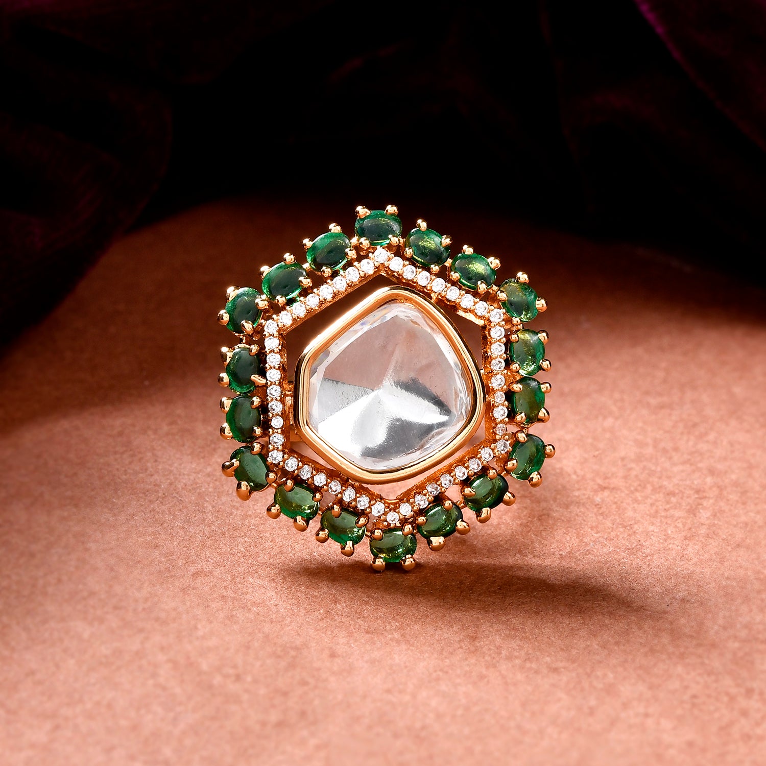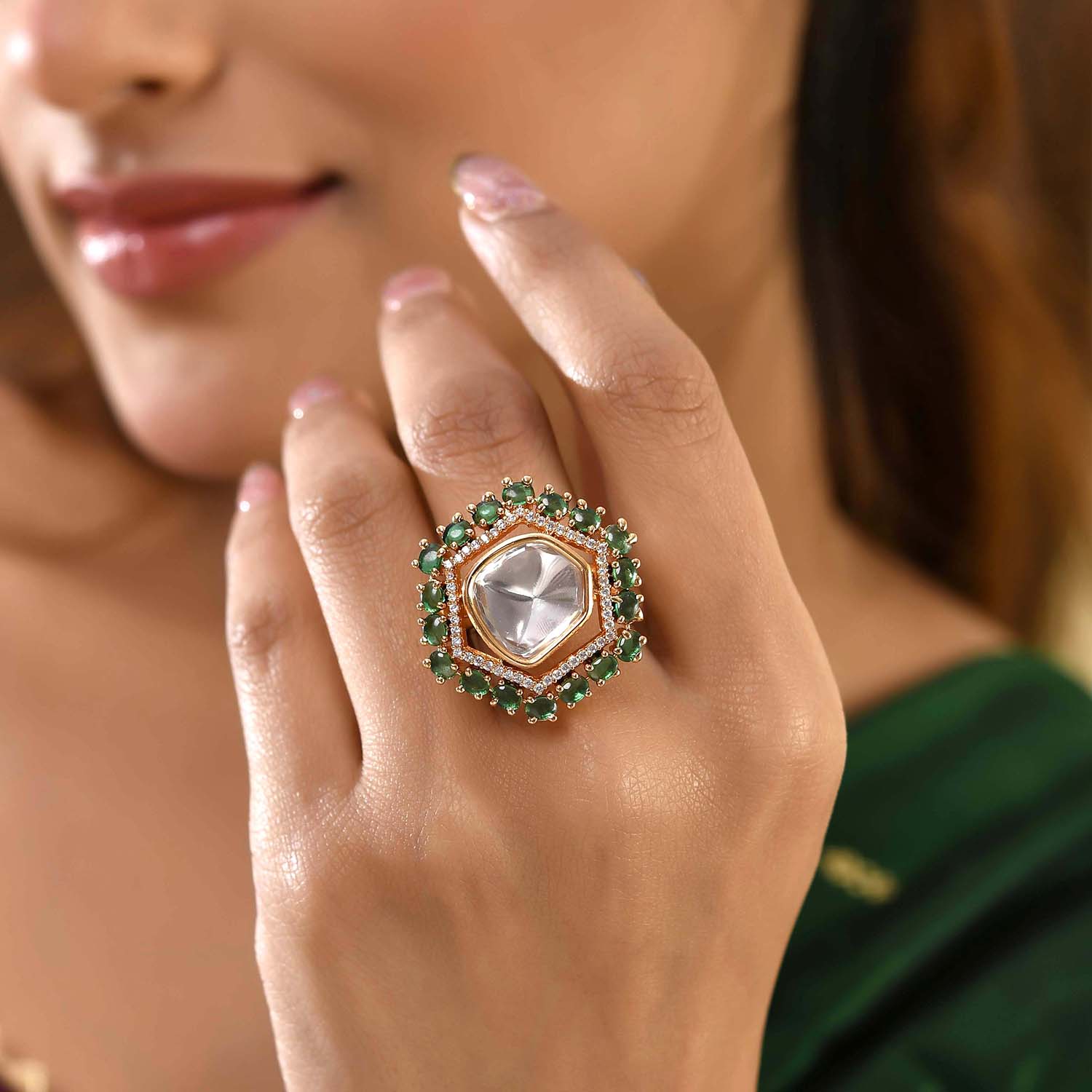 The Riyasat Emerald Ring from the Kundan Opulence Collection is a dazzling piece that combines elegance and charm, making it a must-have for any jewelry lover. Crafted from high-quality brass and plated with gold, this ring features a unique hexagonal design at its center, adorned with a large, sparkling clear gemstone. Encircling the central gem, a halo of brilliant white stones is followed by a striking row of rich green emerald-like stones, creating a stunning contrast that captures attention. This statement ring is perfect for festive occasions, weddings, and traditional ceremonies like pooja and Diwali. Its intricate design and vibrant colors make it an ideal gift for women, suitable for Valentine's Day, Rakshabandhan, Christmas, New Year, and other special occasions. Pair this ring with ethnic outfits for a regal look or contemporary attire for a touch of opulence. The Riyasat Emerald Ring is not just jewelry, it's a timeless treasure that will be cherished for years to come.