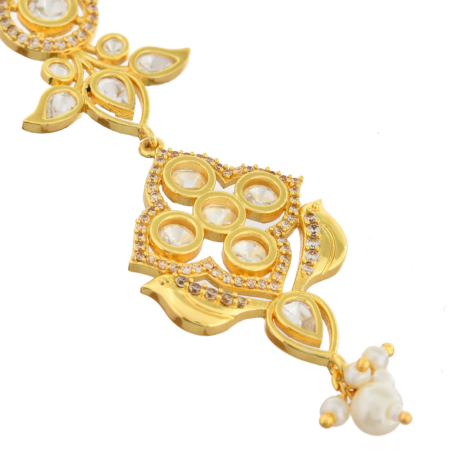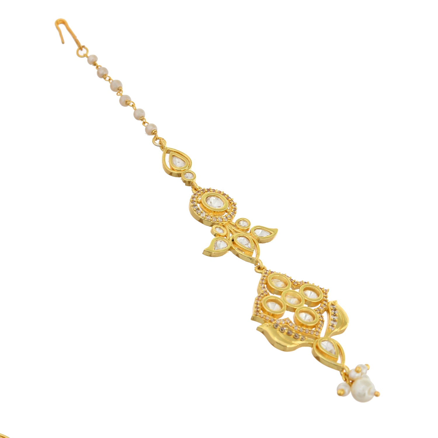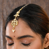 Embrace the timeless elegance of the Voylla Pakhee Mangtikka hair accessory, crafted from high-quality brass and adorned with luxurious gold plating. Inspired by the majestic birds, this exquisite piece showcases intricate designs with American Diamond Kundan stones, symbolizing grace and beauty. The delicate arrangement of pearls and teardrop motifs adds sophistication, perfect for festive occasions, weddings, and parties. Style it with traditional attire for a regal look or pair it with contemporary outfits for a chic, festive appearance. Ideal as a womens gift for Diwali, Rakshabandhan, Holi, ValentineÕs Day, Christmas, New Year, and more, this Mangtikka is a timeless treasure. Whether for your sister, girlfriend, wife, mother, or lover, it's a symbol of elegance and the sacred union of two souls. Make it a part of your wedding wear, party wear, or festive collectionÑit's a must-have for every brideÕs trousseau.