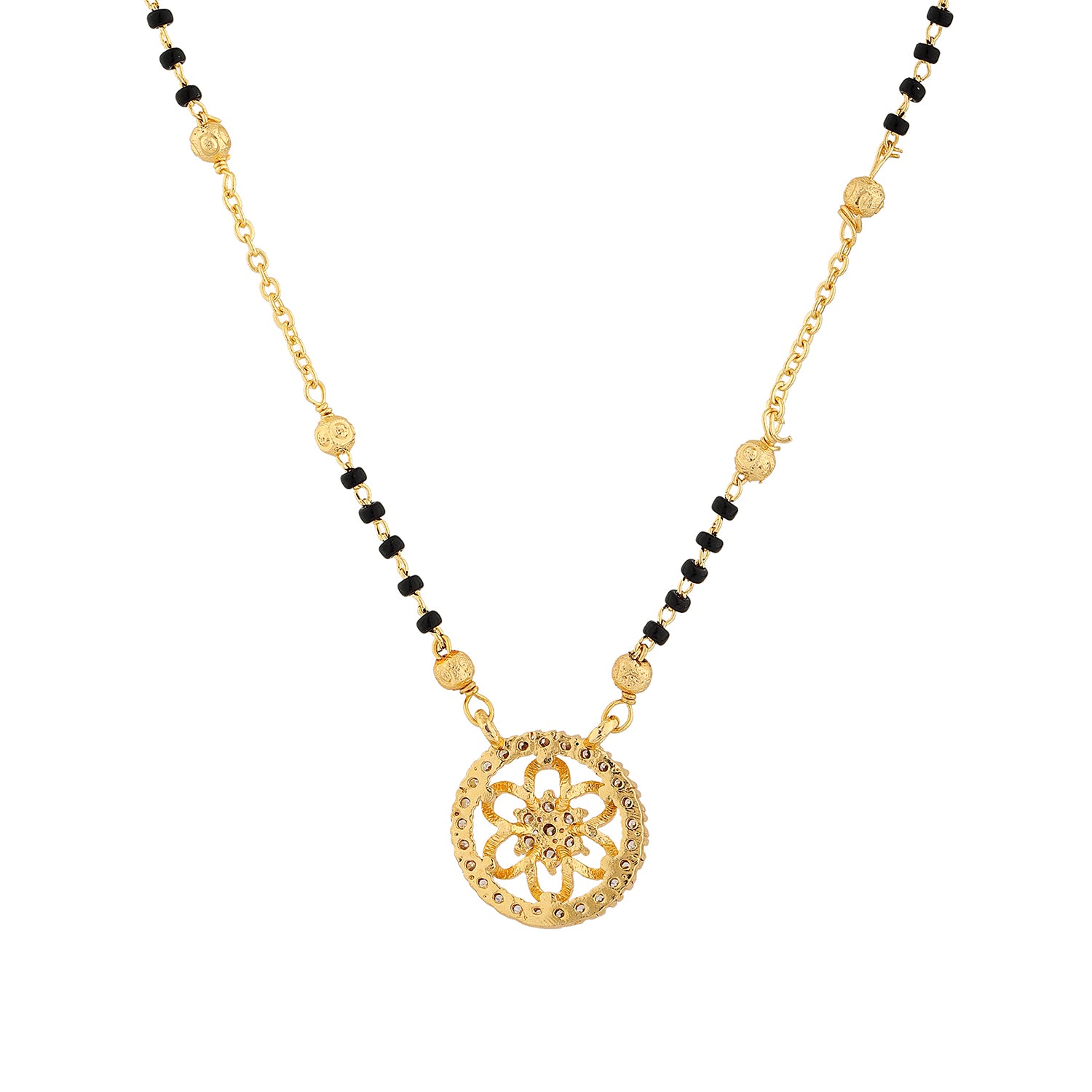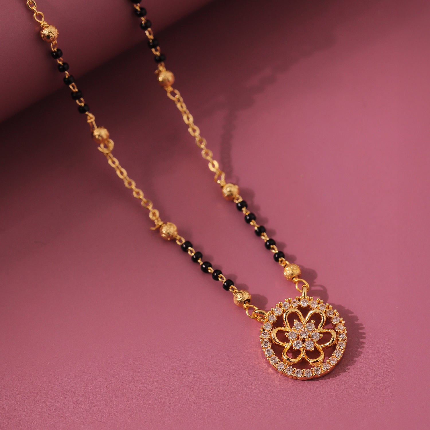 The Gold Essentials Flora American Diamond Mangalsutra is a graceful blend of nature-inspired beauty and timeless tradition. Part of the signature Gold Essentials Collection, this piece is crafted in premium brass with radiant gold plating, ensuring lasting shine, strength, and elegance. Its pendant design features a delicate floral motif, beautifully outlined with sparkling American Diamonds and centered with a cluster of stones for extra brilliance. Paired with a classic black-beaded chain and golden accents, this piece perfectly balances cultural symbolism with the sophistication of a designer mangalsutra. Lightweight yet striking, the Flora mangalsutra is versatile enough for daily wear, office wear, and wedding wear. Whether styled with sarees for festive occasions, kurtis for everyday elegance, or professional outfits for work, it adapts effortlessly. More than just jewelry, it is a keepsake of love and unity, making it a heartfelt gift for wife, anniversary gift, Valentine’s Day gift, or wedding gift.