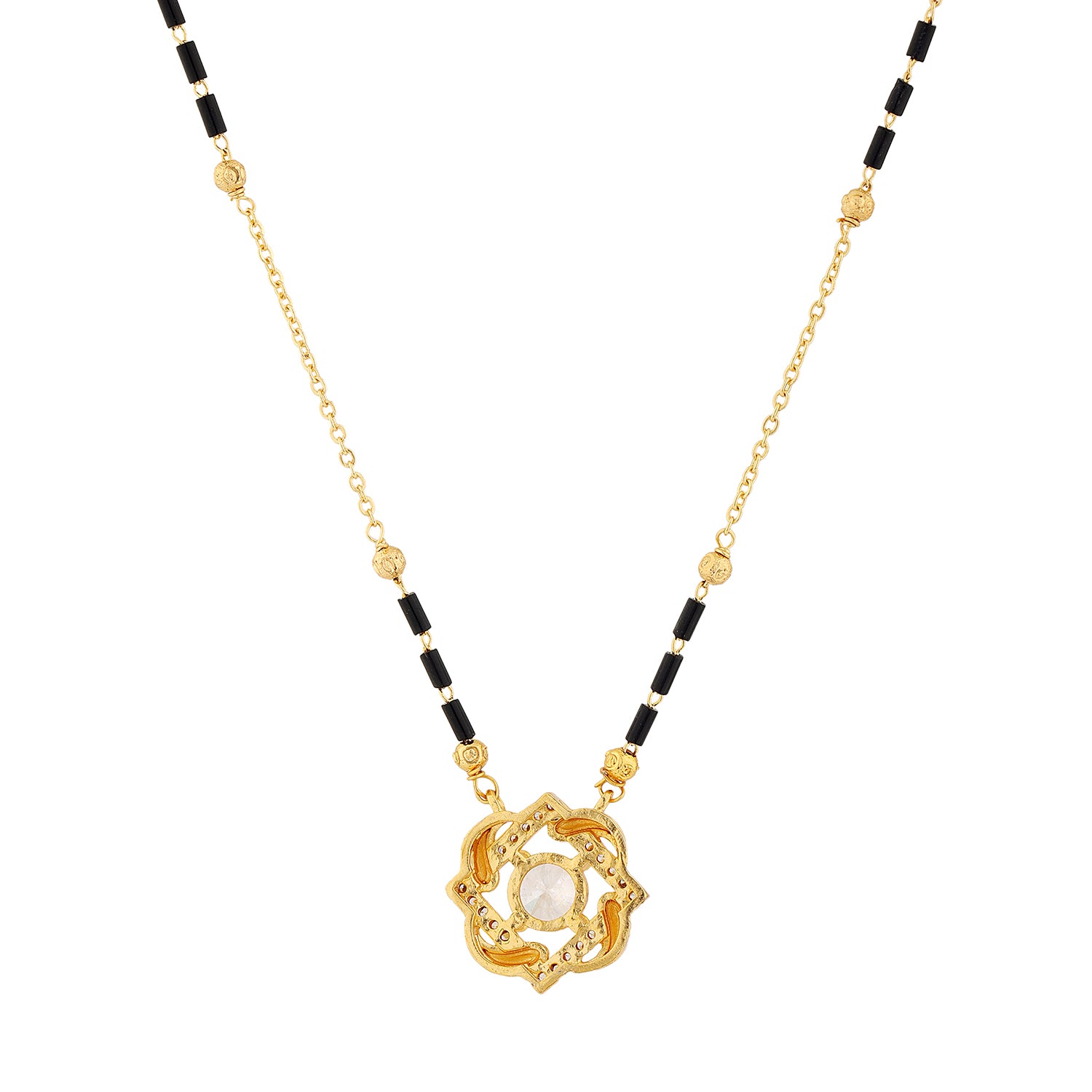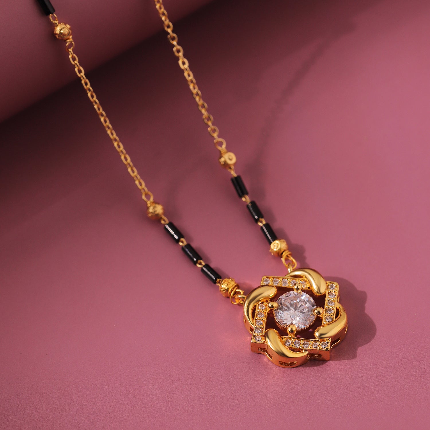 The Gold Essentials Saubhagya American Diamond Mangalsutra is a true symbol of love, grace, and everlasting elegance. Belonging to our much-loved Gold Essentials Collection, this piece is crafted in premium brass with durable gold plating, ensuring a long-lasting shine and a timeless look.Its pendant features a striking solitaire-inspired American Diamond set at the center, embraced by an intricate floral-meets-geometric frame adorned with sparkling stones. The classic black-beaded chain pairs beautifully with golden links, preserving the essence of a traditional mangalsutra while adding the refined charm of a designer mangalsutra. Perfectly versatile, this women mangalsutra can be styled with ethnic sarees and lehengas for weddings, kurtis and Indo-western outfits for daily elegance, or chic formal wear for the office. More than just jewelry, it is a token of togetherness, making it a thoughtful choice as a gift for wife, anniversary gift, Valentine’s Day gift, or wedding gift.