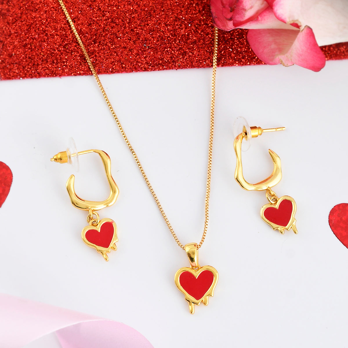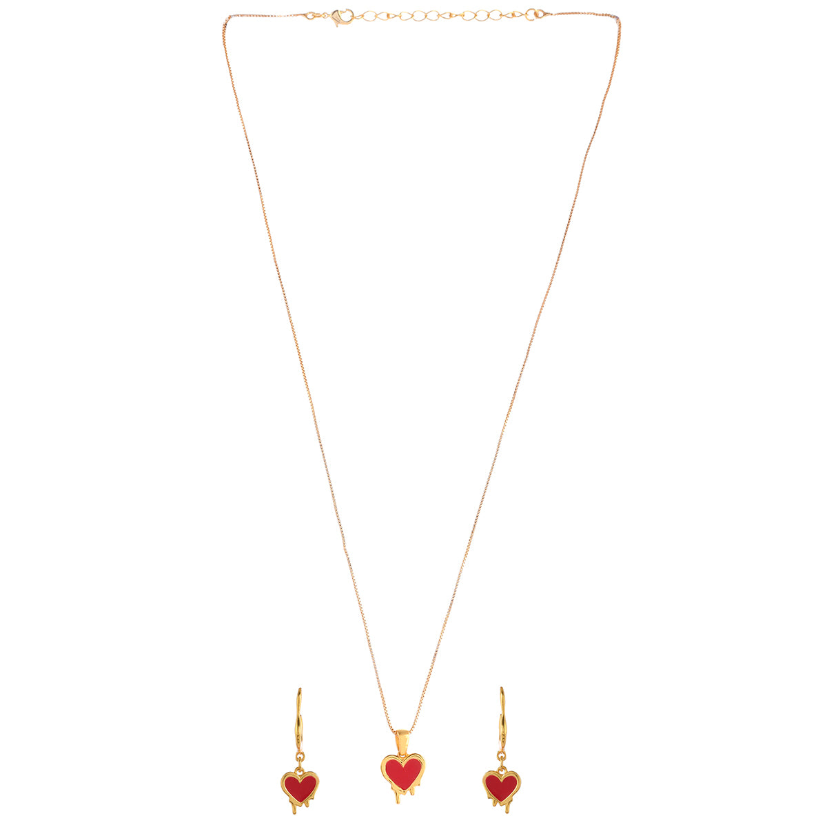 Deep red enamel hearts pendant set with yellow gold plating. Made from brass and a lightweight and versatile wear.Weight (Gms): 7.53Size (LxW)(Inch): 109.2*39Material: BrassPlating: Yellow GoldColor: GoldSales Package: 1 Pendant; 2 Earrings; 1 ChainProduct Code: 8905124491418
