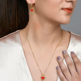 Yellow gold plated pendant set with red enamelled hearts. Made from brass. Pair with casual V Day looks.Weight (Gms): 7.14Size (LxW)(Inch): 97.11*39Material: BrassPlating: Yellow GoldColor: GoldSales Package: 1 Pendant; 2 Earrings; 1 ChainProduct Code: 8905124490718