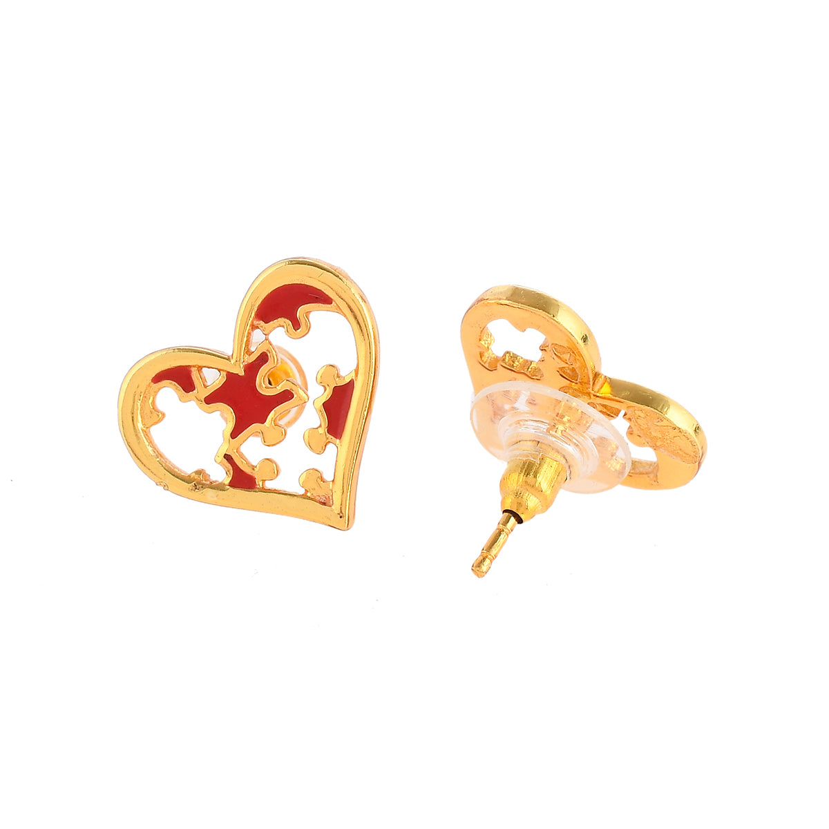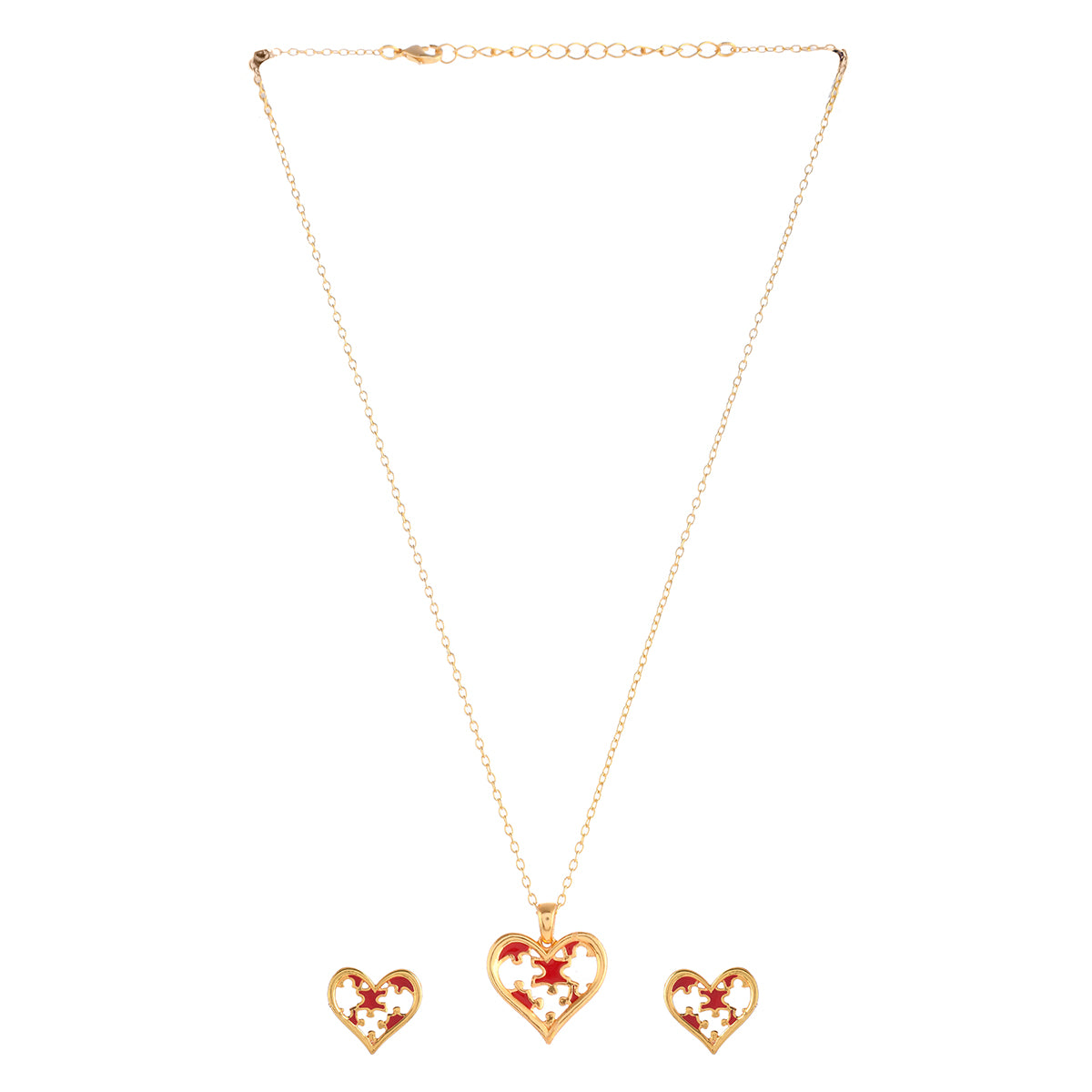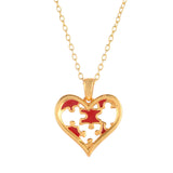 Jigsaw pieces in a red heart pendant set. Made from brass and gold plated. Lightweight and versatile.