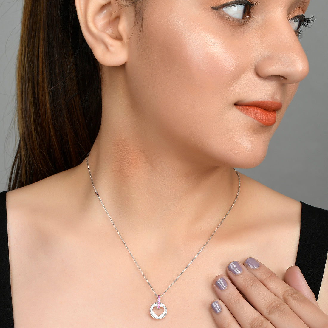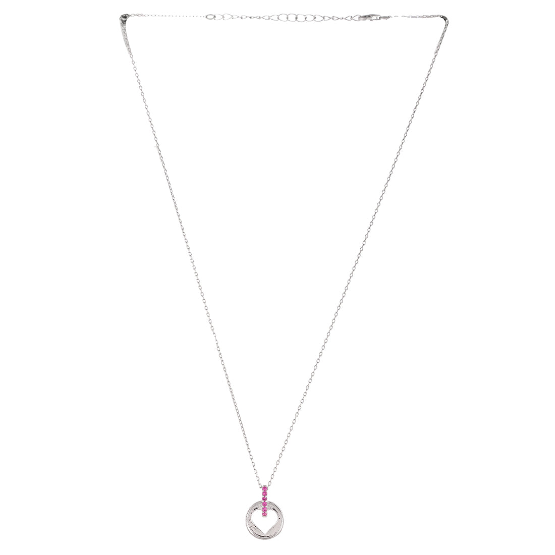 925 sterling silver pendant featuring a heart shape design and pink zirconia gemstones. White rhodium plated and featuring a high polish finish, the pendant is perfect for threading in chains as well as a good charm for bracelets.