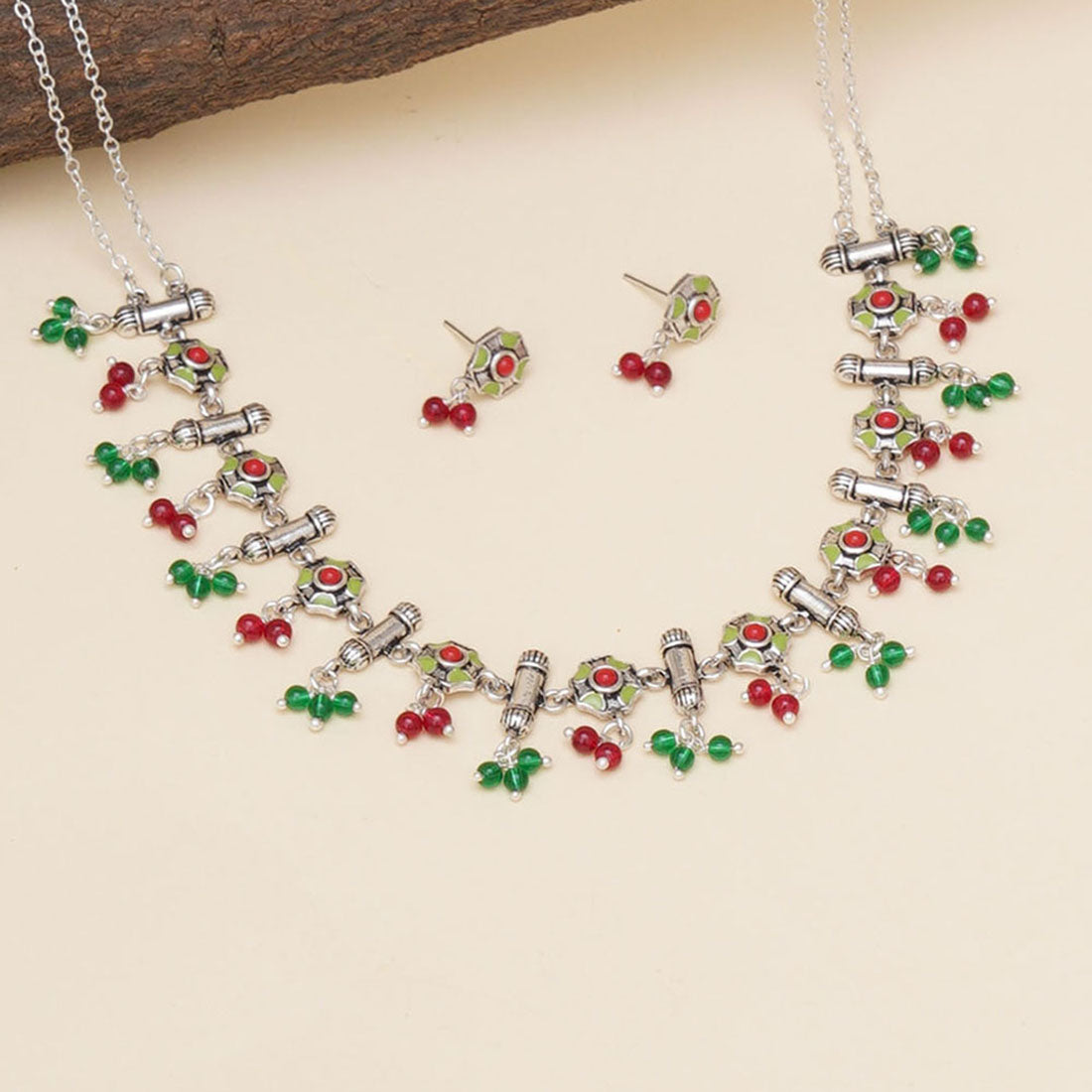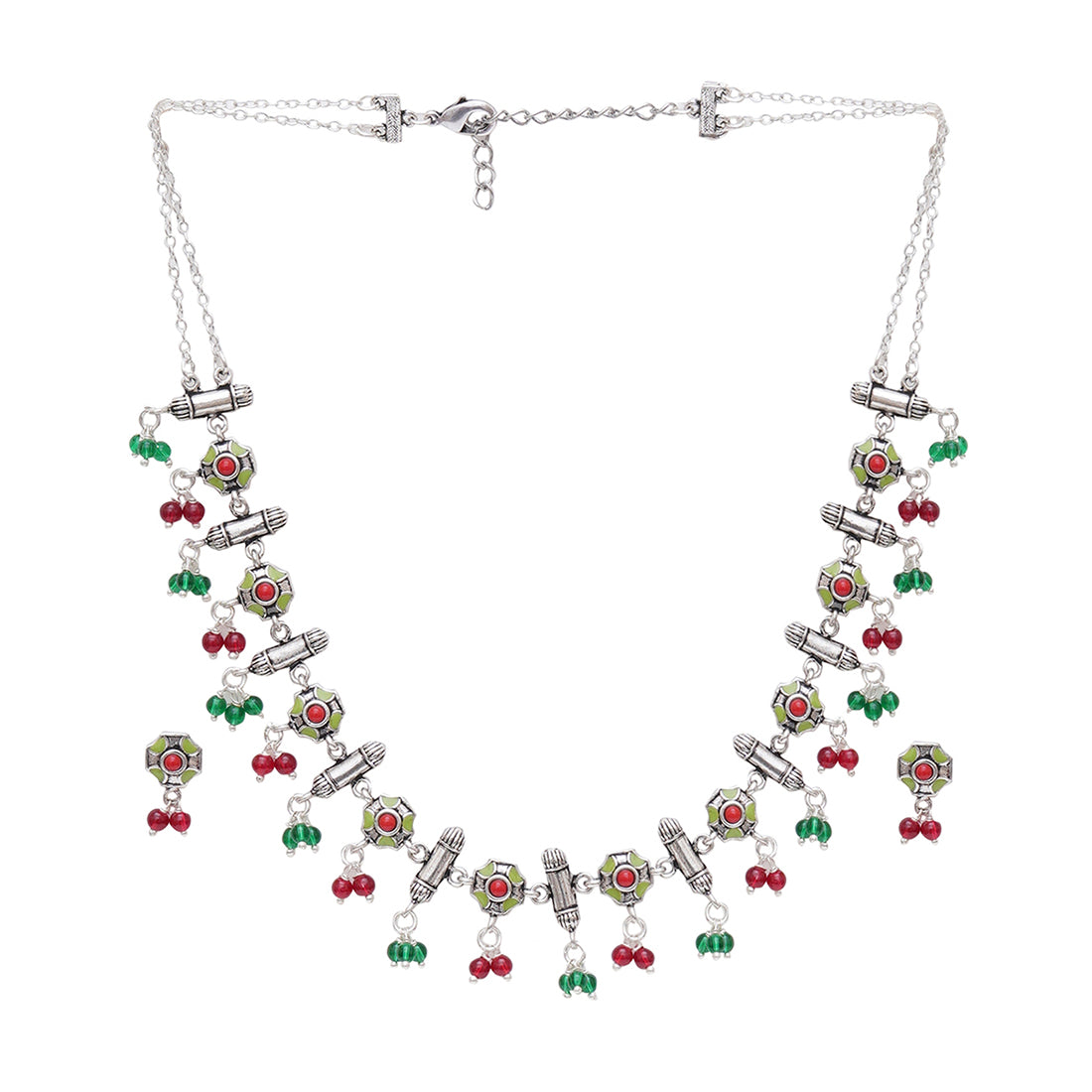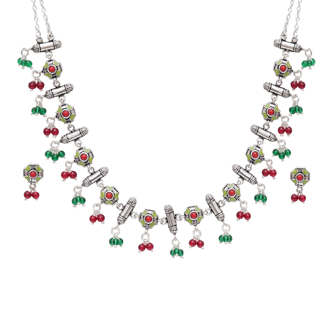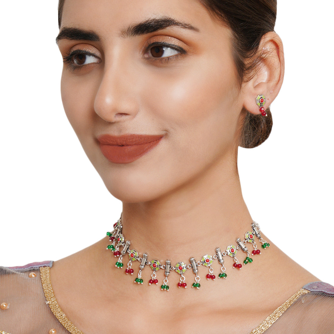 Festive Hues Intricate Enameled Choker Necklace Set with Artisanal Motifs and Green Beads