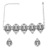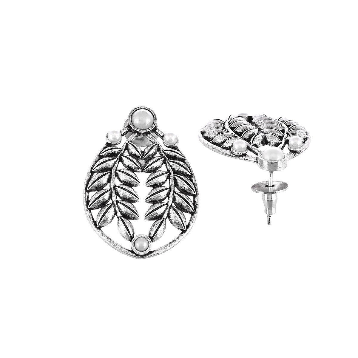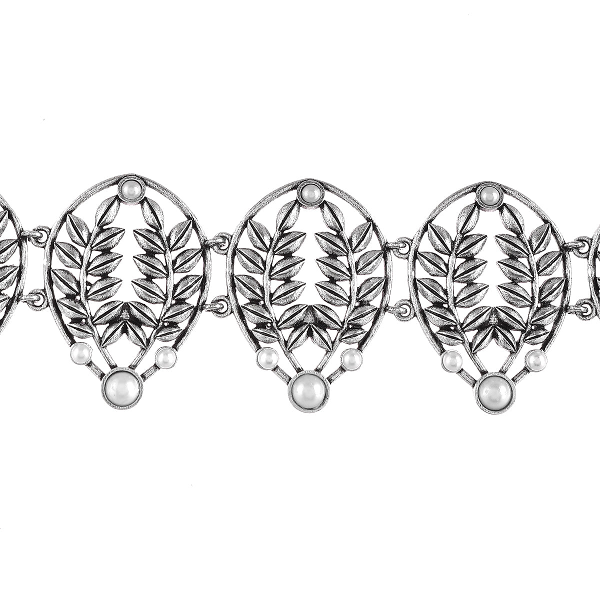 Add a sparkle to all your ethnic and Indo-Western looks with this lovely choker set with leaves motifs, inspired by the fern leaf. Adorned with white pearls, the set has been fashioned out of brass. Oxidized silver plating adds to its charm.